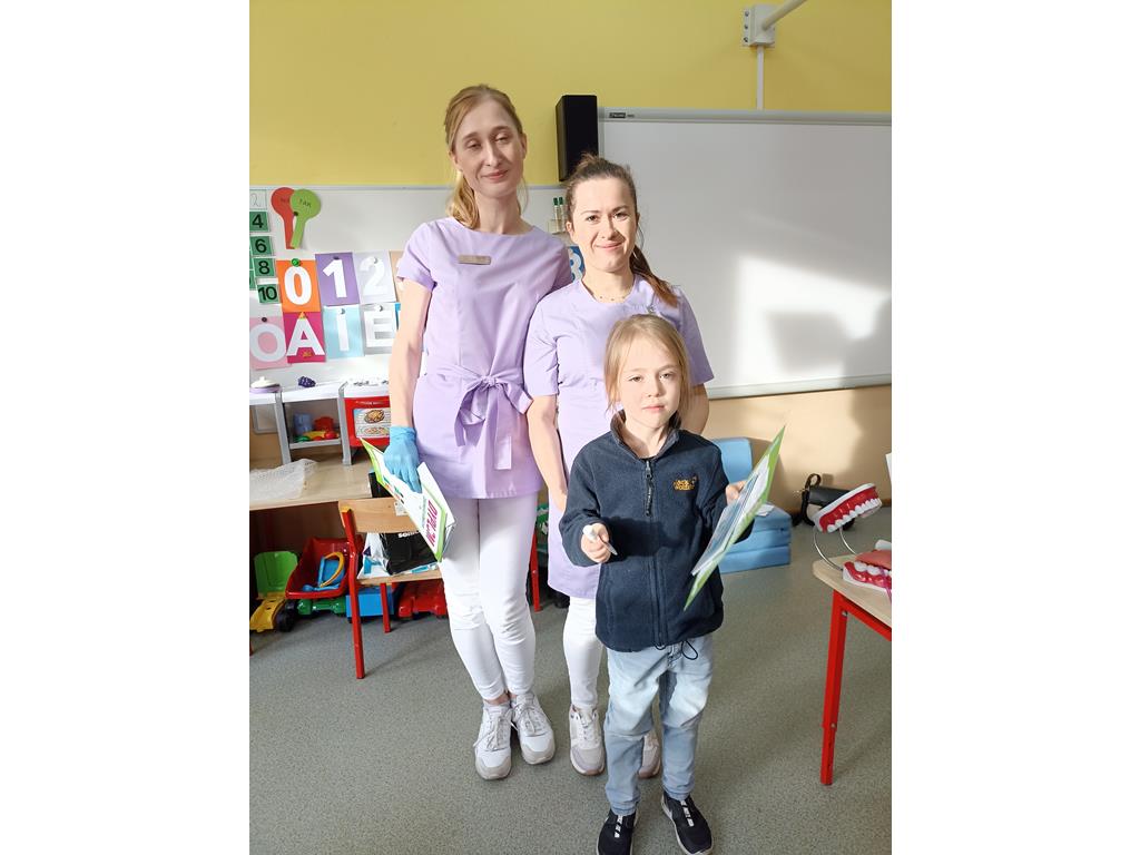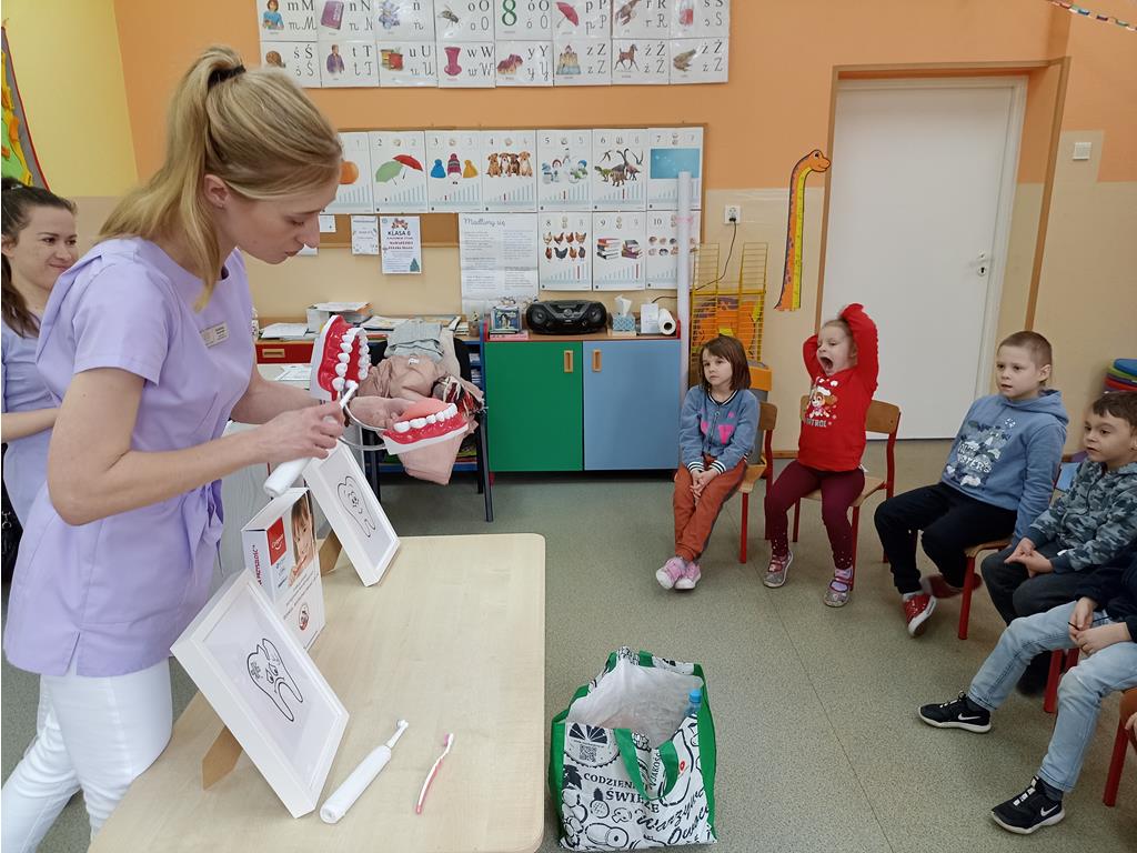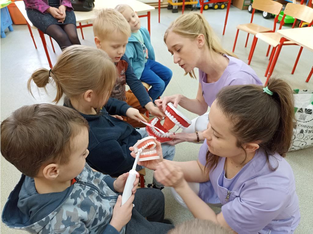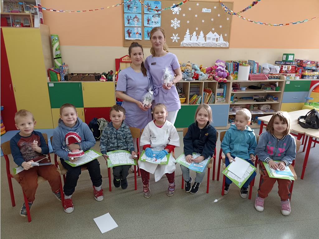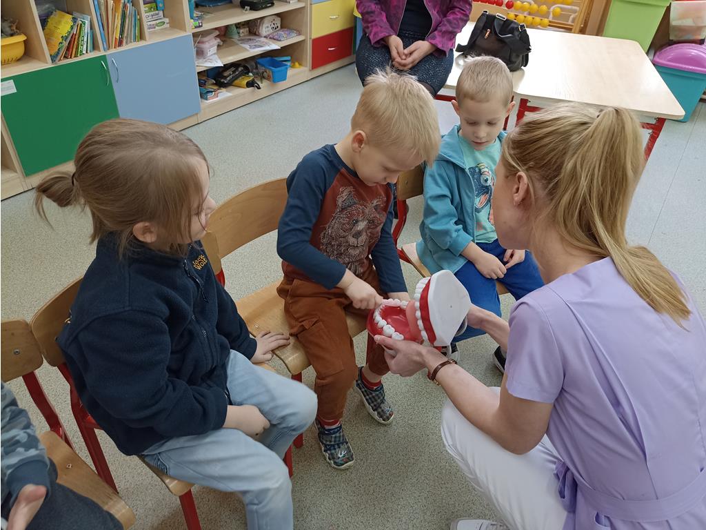 Dnia 17 stycznia naszą grupę odwiedziły higienistki stomatologiczne Pani Andżelika Kasprzyk i Joanna Kaczorowska . Celem wizyty była rozmowa na temat konieczności dbania o higienę jamy ustnej, przełamanie obaw przed wizytą u stomatologa, a także kształtowanie nawyków prozdrowotnych. Panie opowiedziała dzieciom jak należy dbać o higienę jamy ustnej, jaka jest najlepsza technika mycia zębów. Dzieci miały okazję wcielić się w rolę stomatologa i pacjenta. Teraz już wszyscy wiedzą, jak należy dbać o zęby i jak je myć. Serdecznie dziękujemy za pięknie przygotowane warsztaty, cenne wskazówki, które na pewno wykorzystamy w praktyce.
