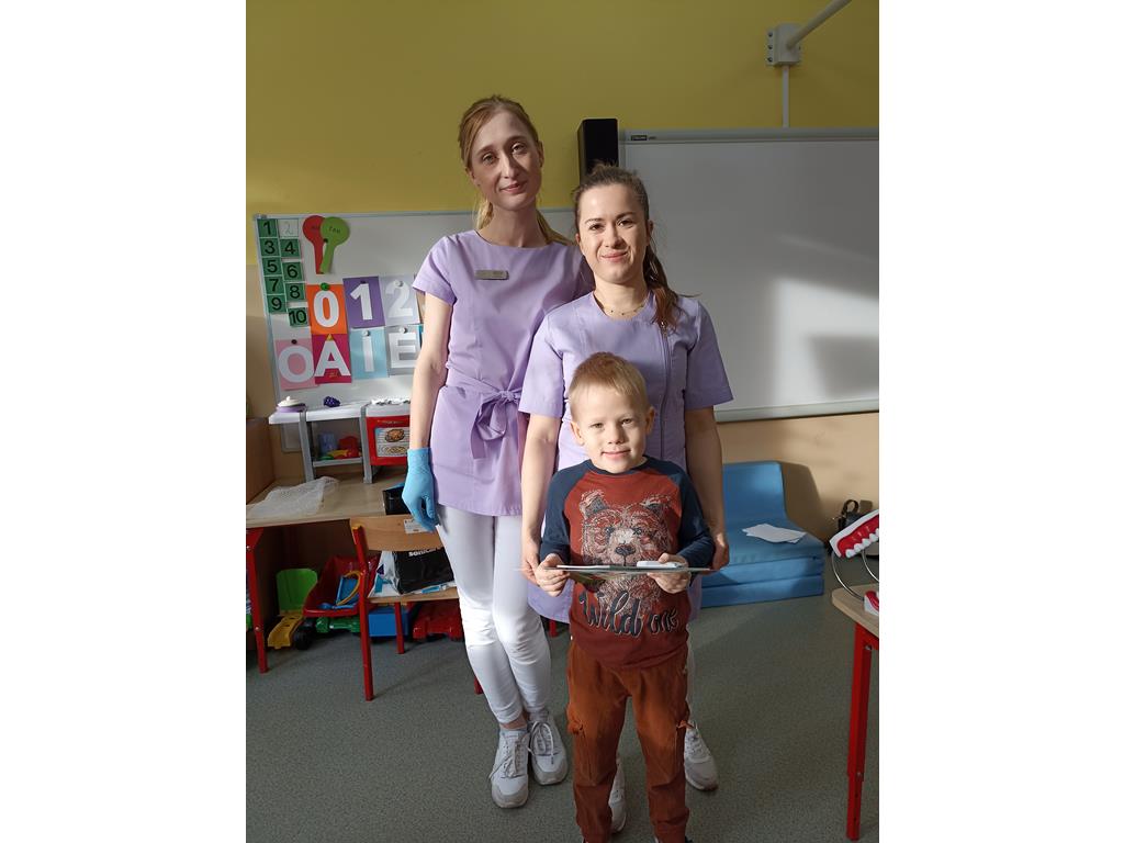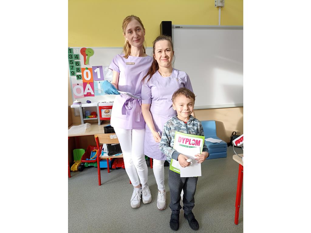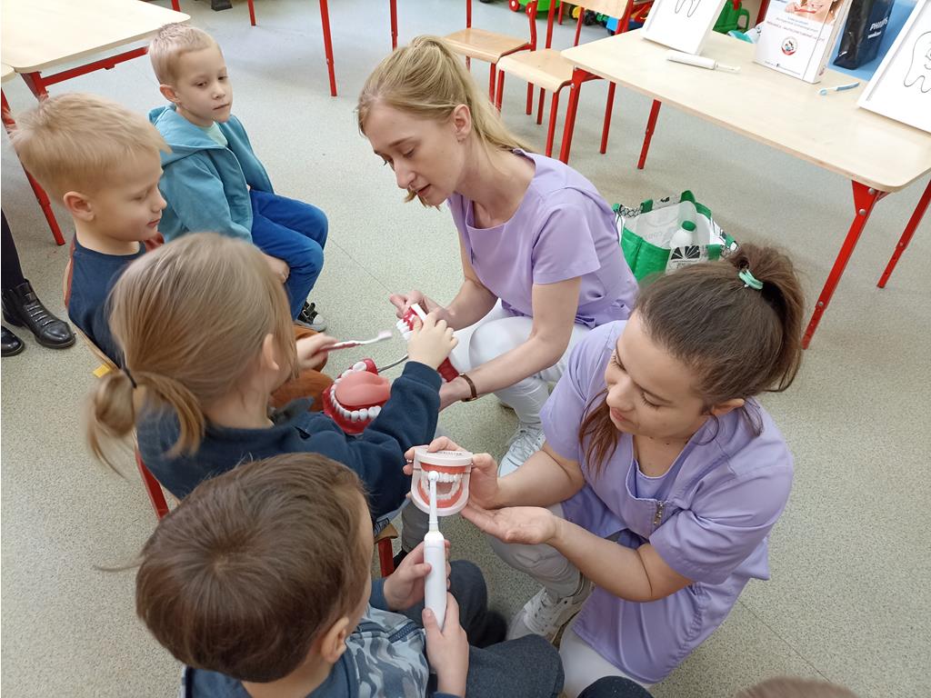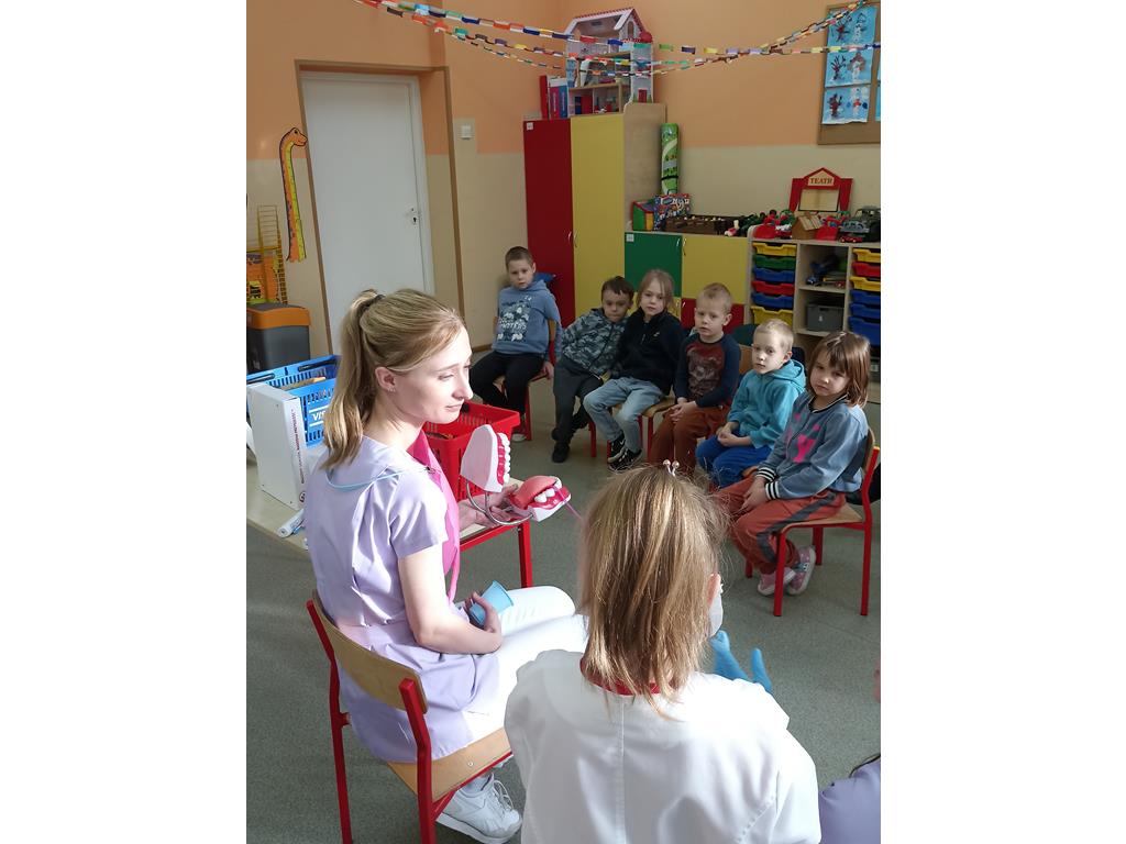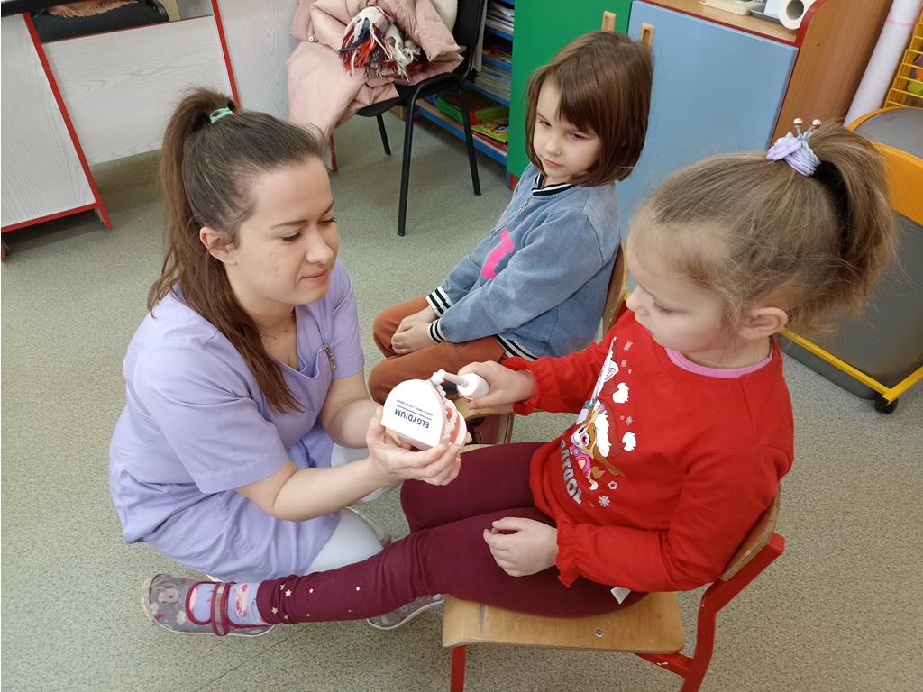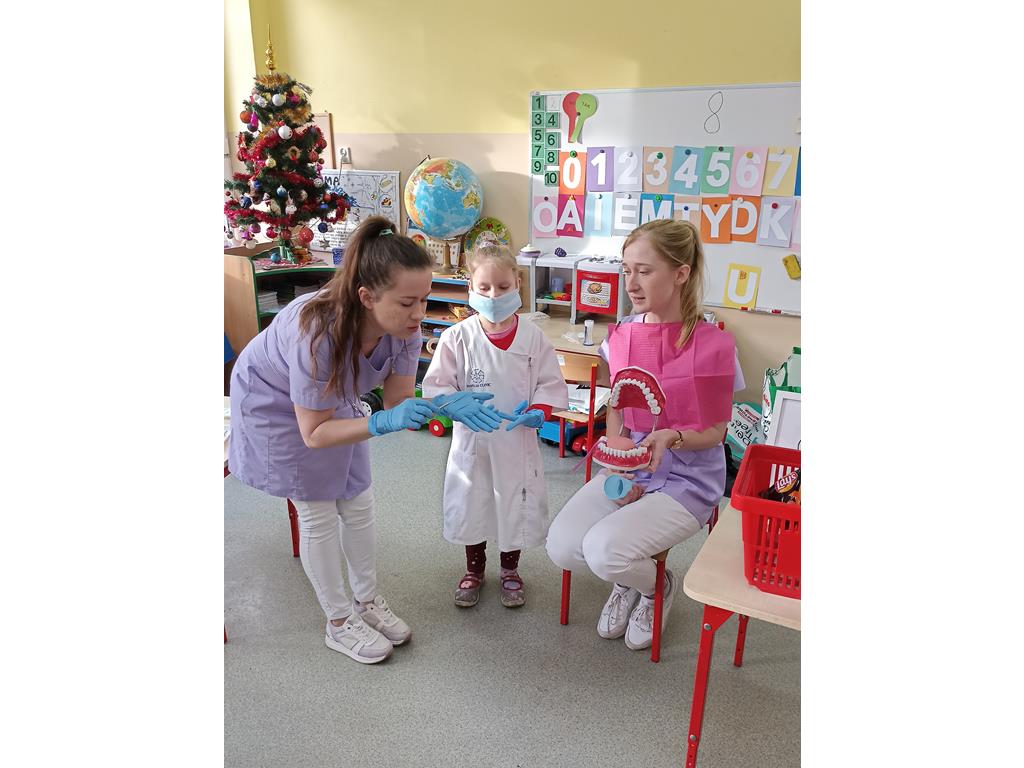 Dnia 17 stycznia naszą grupę odwiedziły higienistki stomatologiczne Pani Andżelika Kasprzyk i Joanna Kaczorowska . Celem wizyty była rozmowa na temat konieczności dbania o higienę jamy ustnej, przełamanie obaw przed wizytą u stomatologa, a także kształtowanie nawyków prozdrowotnych. Panie opowiedziała dzieciom jak należy dbać o higienę jamy ustnej, jaka jest najlepsza technika mycia zębów. Dzieci miały okazję wcielić się w rolę stomatologa i pacjenta. Teraz już wszyscy wiedzą, jak należy dbać o zęby i jak je myć. Serdecznie dziękujemy za pięknie przygotowane warsztaty, cenne wskazówki, które na pewno wykorzystamy w praktyce.