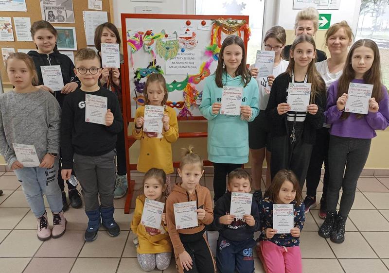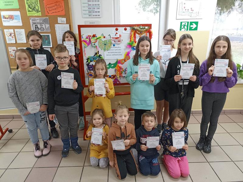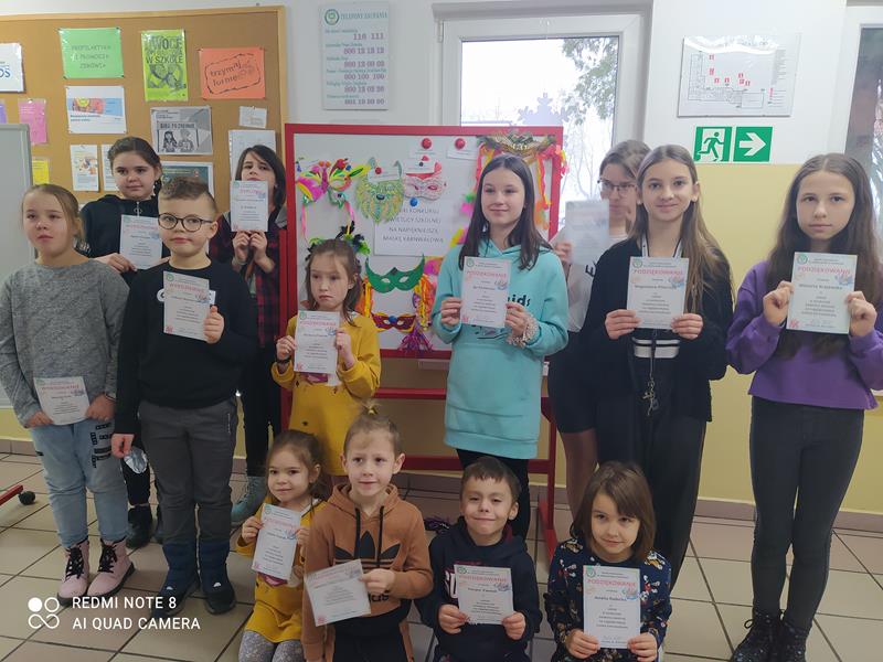 Jedną z tradycji karnawału jest bal karnawałowy, który nie może się odbyć bez maski… Z tego powodu w styczniu ogłoszono konkurs świetlicy szkolnej na ,,NAJPIĘKNIEJSZĄ MASKĘ KARNAWAŁOWĄ”. W zmaganiach plastycznych wzięło udział wielu uczniów. Konkurencja była ogromna, a maski naprawdę przepiękne. Zebrana komisja konkursowa postanowiła przyznać: