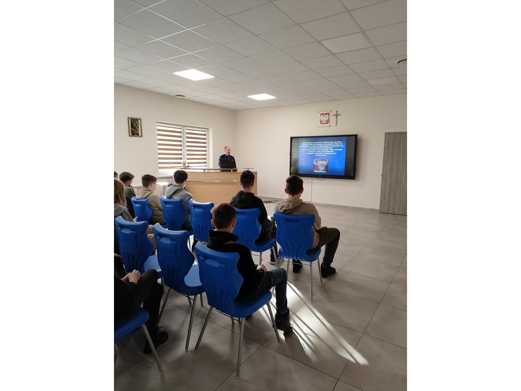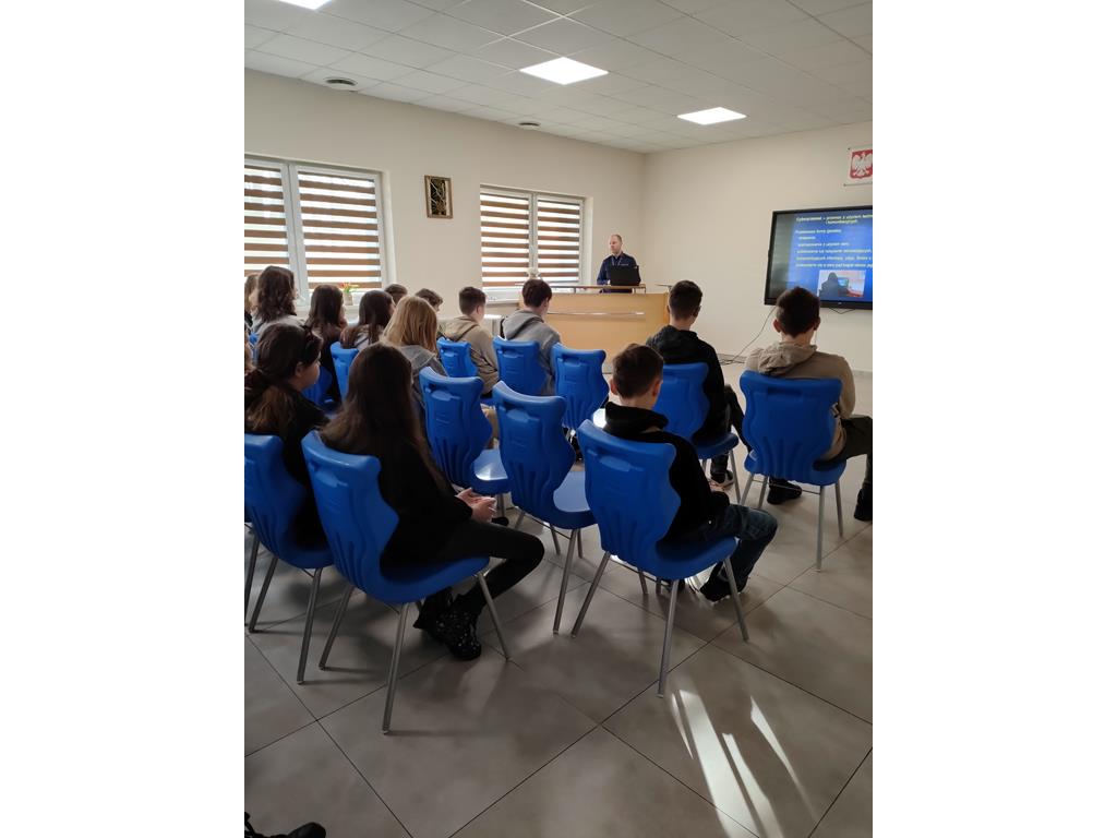 Dnia 23.02.2023 r. w ramach programu wychowawczo – profilaktycznego, w naszej szkole odbyło się spotkanie z przedstawicielem służb mundurowych - funkcjonariuszem policji. Tematyką spotkania była „Odpowiedzialność prawna nieletnich w świetle obowiązujących przepisów”. Podczas wykładu została poruszona kwestia odpowiedzialności prawnej nieletnich, zostały wyjaśnione podstawowe pojęcia takie jak: kim jest nieletni, a także czym jest czyn karalny. Swoją wypowiedź policjant podsumował przykładami oraz konsekwencjami prawnymi. Następnie została poruszona kwestia cyberprzemocy, w jaki sposób zabezpieczać swoje konta w Internecie oraz to czym jest demoralizacja, a także jakie niesie za sobą konsekwencje. Na koniec funkcjonariusz przybliżył zawód policjanta oraz odpowiedział na nurtujące uczniów pytania. W spotkaniu wzięli udział uczniowie klasy 5, 7 i 8.