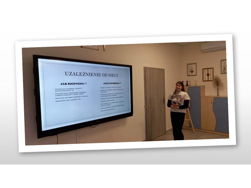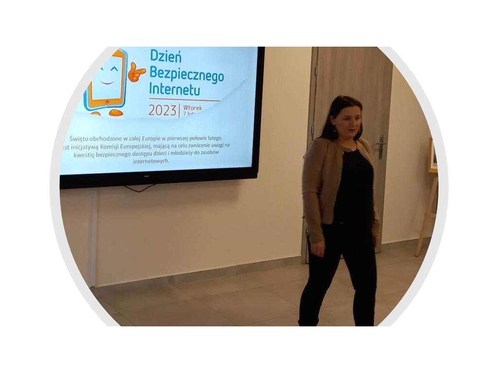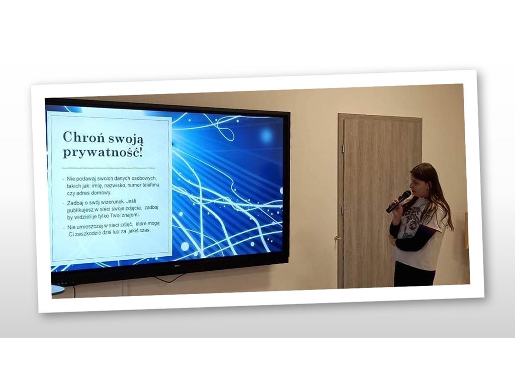 Uczennica klasy ósmej przygotowała prelekcję na temat „Jak bezpiecznie korzystać z Internetu i social mediów”, którą przedstawiła wszystkim uczniom szkoły. Zebrani podczas obchodów zostali zapoznani z różnymi zagrożeniami w sieci i sposobami reagowania na nie, oglądali filmy edukacyjne na temat „Hejt”, „Bezpieczeństwie w kontaktach z innymi”, „Wiarygodność informacji w sieci”, „Bezpieczeństwo własnego wizerunku” oraz „Edukacja prawna – cyberprzemoc”.