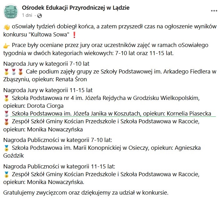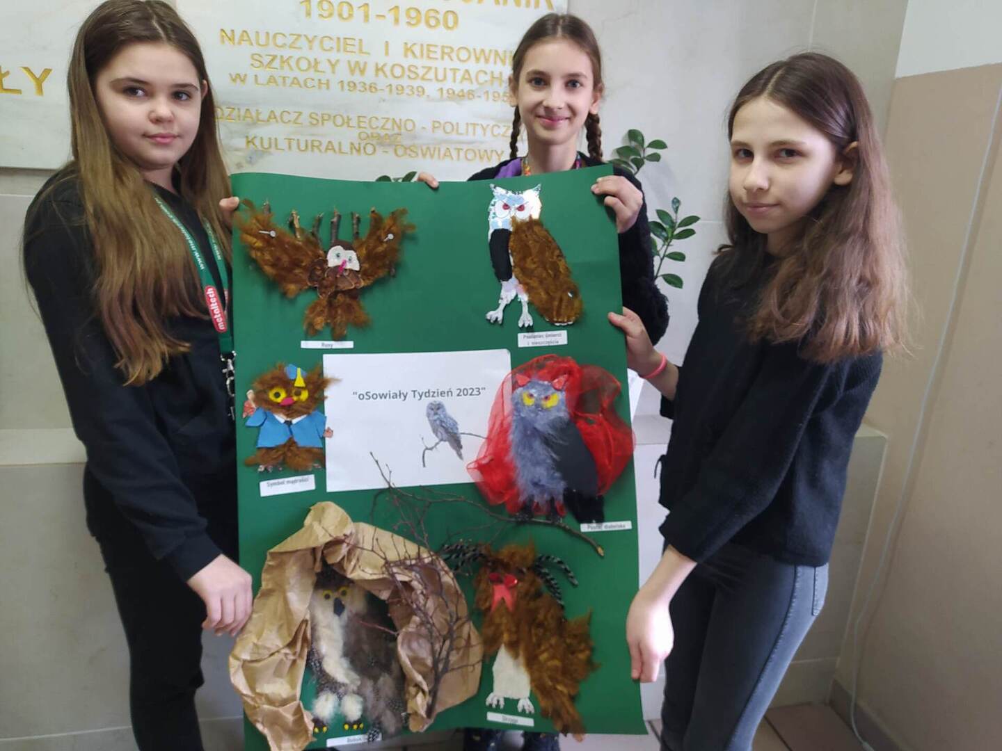 W ramach „Osowiałego tygodnia” Ośrodek Edukacji Przyrodniczej w Lądzie ogłosił konkurs plastyczny „Kultowa Sowa”, którego celem było podniesienie świadomości społecznej o roli i znaczeniu sów w kulturze ludowej i popularnej oraz rozwijanie umiejętności plastycznych i kreatywności wśród dzieci i młodzieży. Skierowany był on do uczniów szkół podstawowych województwa wielkopolskiego. Zadaniem uczestników konkursu było stworzenie zespołów 4 – osobowych i wykonanie pracy plastycznej, której tematem przewodnim będą sowy w kulturze, ich postrzeganie na przestrzeni wieków. W konkursie wzięli udział uczniowie naszej szkoły, uczennice klasy V- Agata Gurgas, Magdalena Pilarczyk, Wiktoria Krajewska oraz Julia Włodarczyk, wraz z wychowawcą- Kornelią Piasecką. Jury oceniło i przyznało nam drugie miejsce w kategorii 11-15 lat. Serdecznie gratulujemy sucesu!
