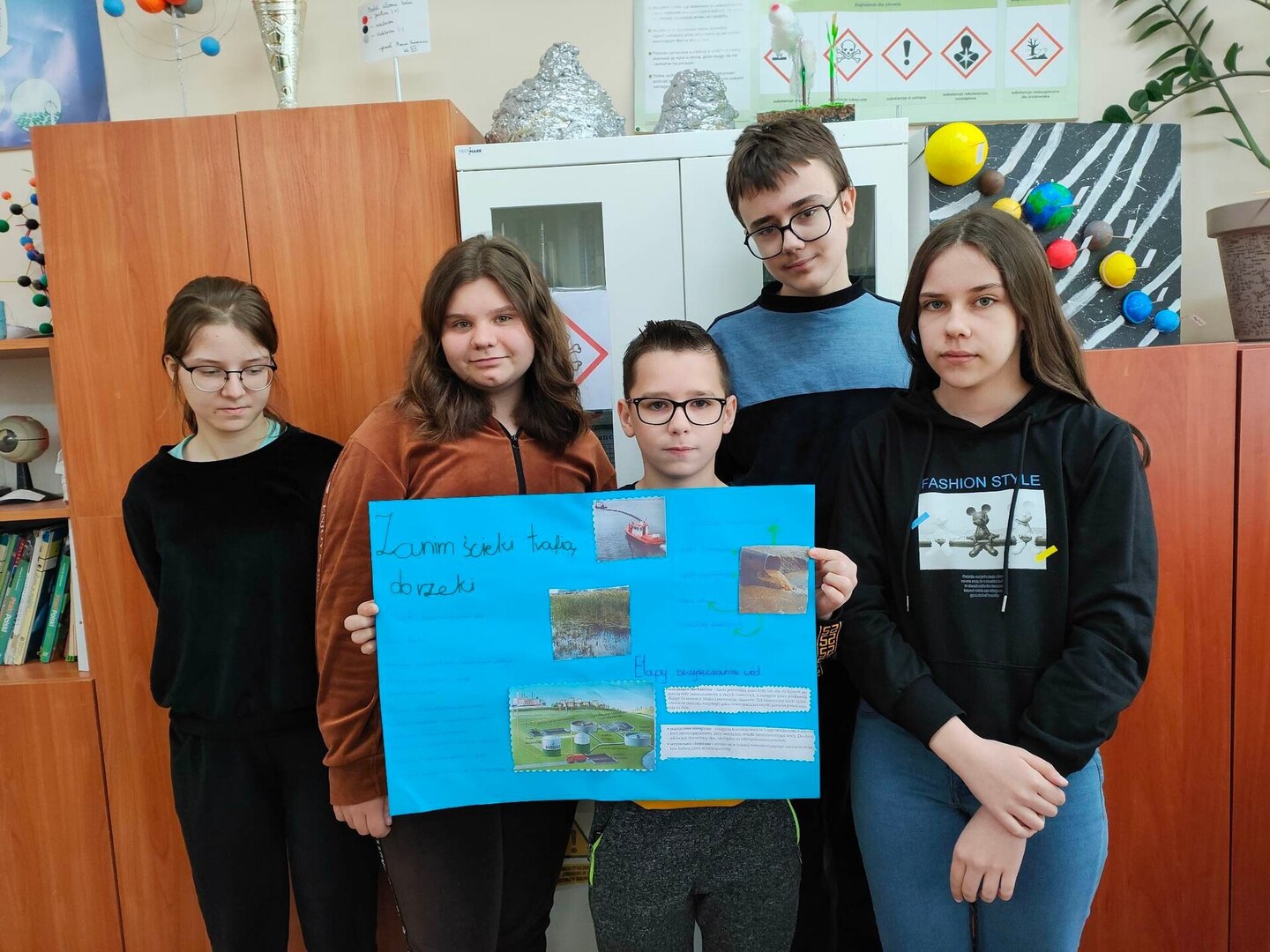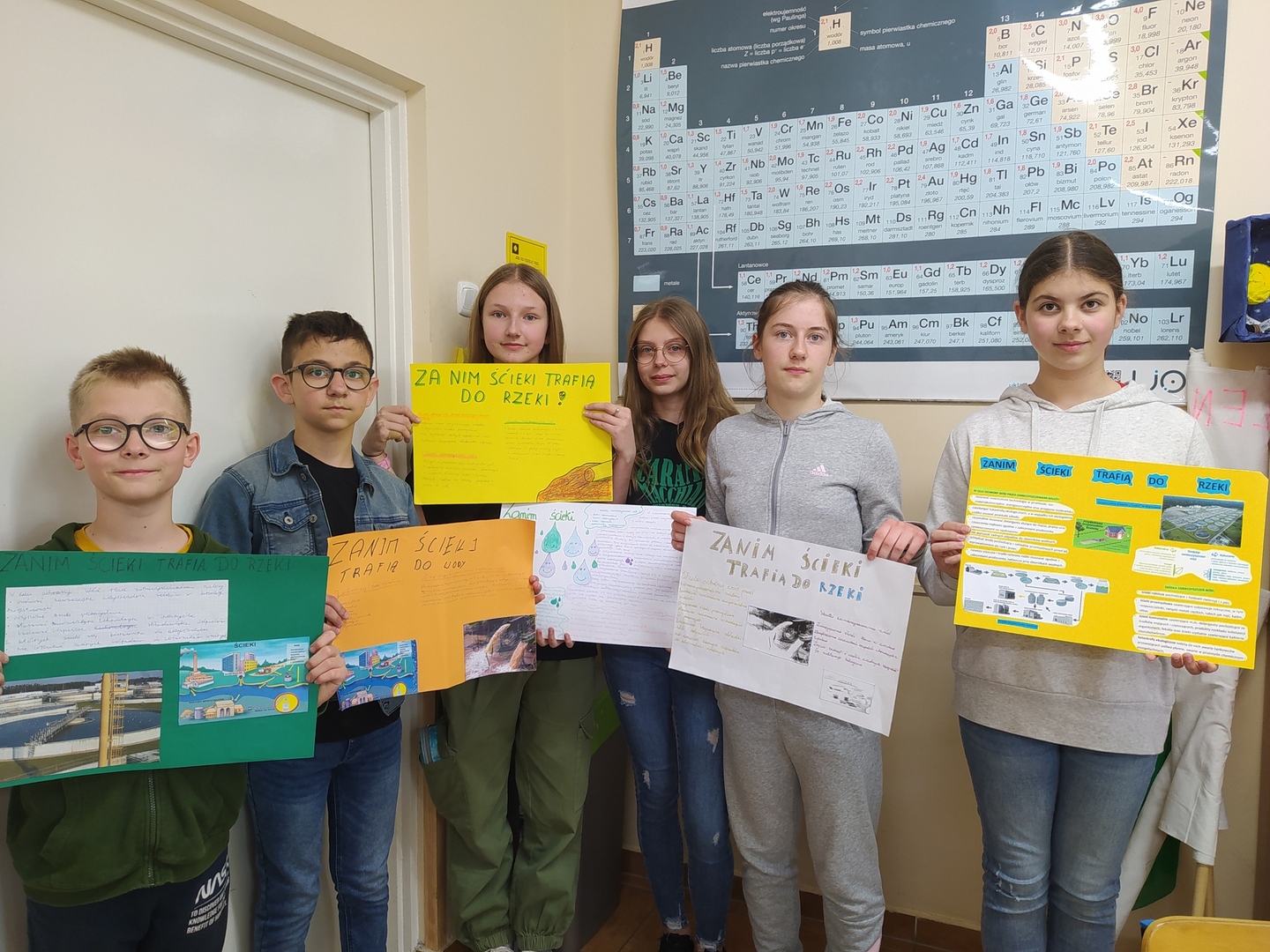 „Woda nie jest produktem handlowym takim jak każdy inny, ale raczej dziedziczonym dobrem, które musi być chronione, bronione i traktowane jako takie”(z preambuły Ramowej Dyrektywy Wodnej). Rzeka – symbol potęgi, siły wieczności. Jej ruch przypomina drogę, symbolizuje wędrówkę i przemijalność życia. Historia rozwoju wielkich cywilizacji jest związana z rzekami, które dostarczały pożywienia, użyźniały glebę, były środkiem transportu, stanowiły ochronę przed wrogiem. W tej fazie rozwoju, człowiek żył w harmonii z rzeką. Rzeki są zatruwane ściekami przemysłowymi, zanieczyszczeniami rolniczymi, spływami powierzchniowymi z miast, ale najpoważniejszą przyczyną ich silnego zanieczyszczenia są ścieki z gospodarstw domowych odprowadzane bezpośrednio (lub z nieszczelnych szamb) do rzek, rowów melioracyjnych czy gleby. Dlatego na lekcji chemii uczniowie klasy siódmej realizowali mini projekt edukacyjny, w którym poszukiwali, porządkowali i analizowali informacje dotyczące źródeł i skutków zanieczyszczeń wód. Posługując się wiadomościami pochodzącymi z analizy materiałów źródłowych i pracując w zespole dowiedzieli się jak nie zanieczyszczać wody, jak można je oczyszczać i na jakiej zasadzie działa oczyszczalnia ścieków. Zdobytą wiedzę uwiecznili na plakatach. Czysta woda, to lepsza jakość życia nas samych.