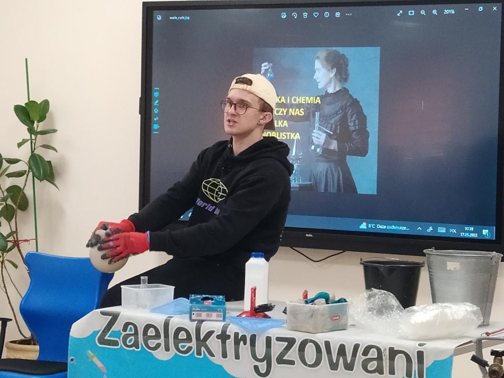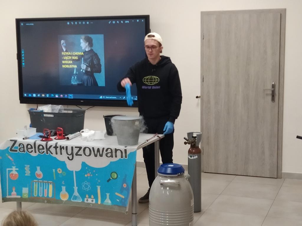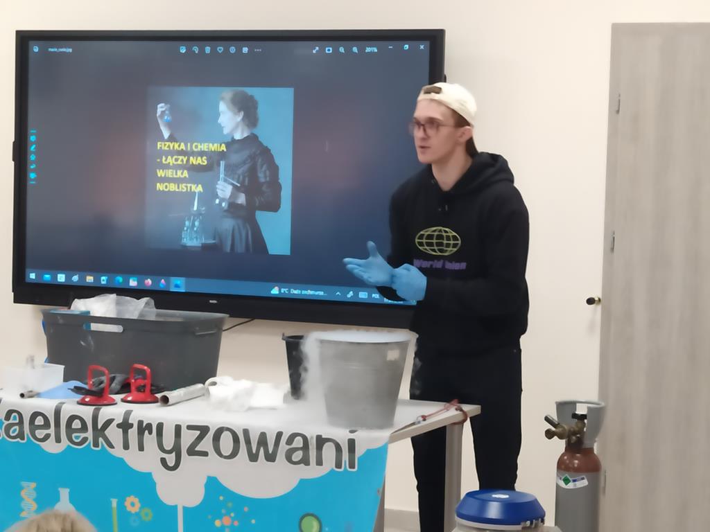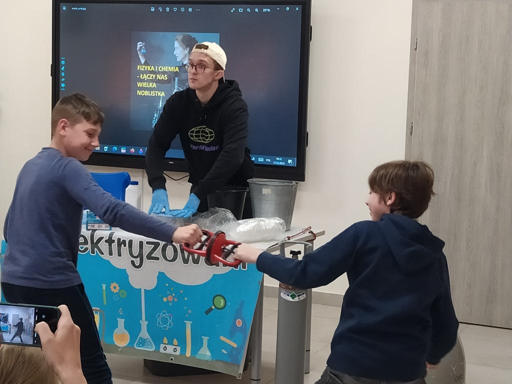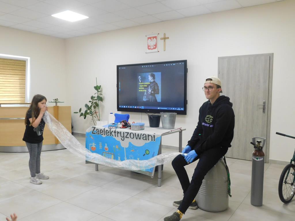 W środę naszą szkołę odwiedził pan Mikołaj z "Grupy Zaelektryzowani", który przeprowadził dla naszych uczniów niecodzienną lekcję pt. "Poczuj chemię do fizyki”. Scenariusz tych niecodziennych zajęć połączył w sobie elementy edukacyjne z humorystycznymi. Dzięki tym doświadczeniom wiemy, że świat, który nas otacza i zjawiska w nim zachodzące są pasjonujące i magiczne. Starsi i młodsi uczniowie mieli okazję zobaczyć niecodzienne eksperymenty fizyczne i chemiczne oraz zaobserwować ciekawe zjawiska fizyczne. Wśród nich znalazły się: efektowna, wybuchowa zabawa z wodorem, nadmuchiwanie foliowego rękawa, zabawy z helem i ciekłym azotem, jazda rowerem przeciwskrętnym czy rozdzielanie przyssawek.