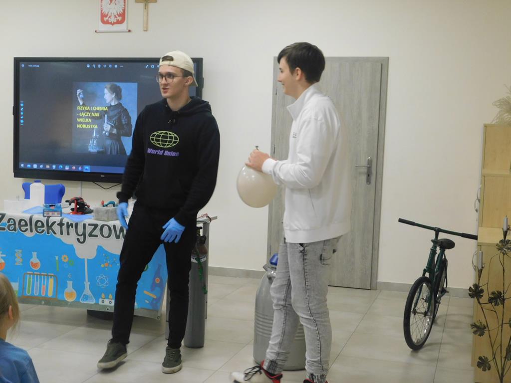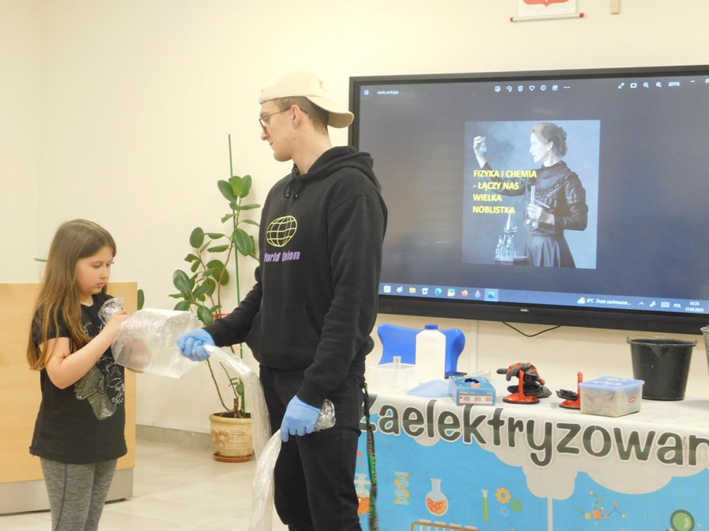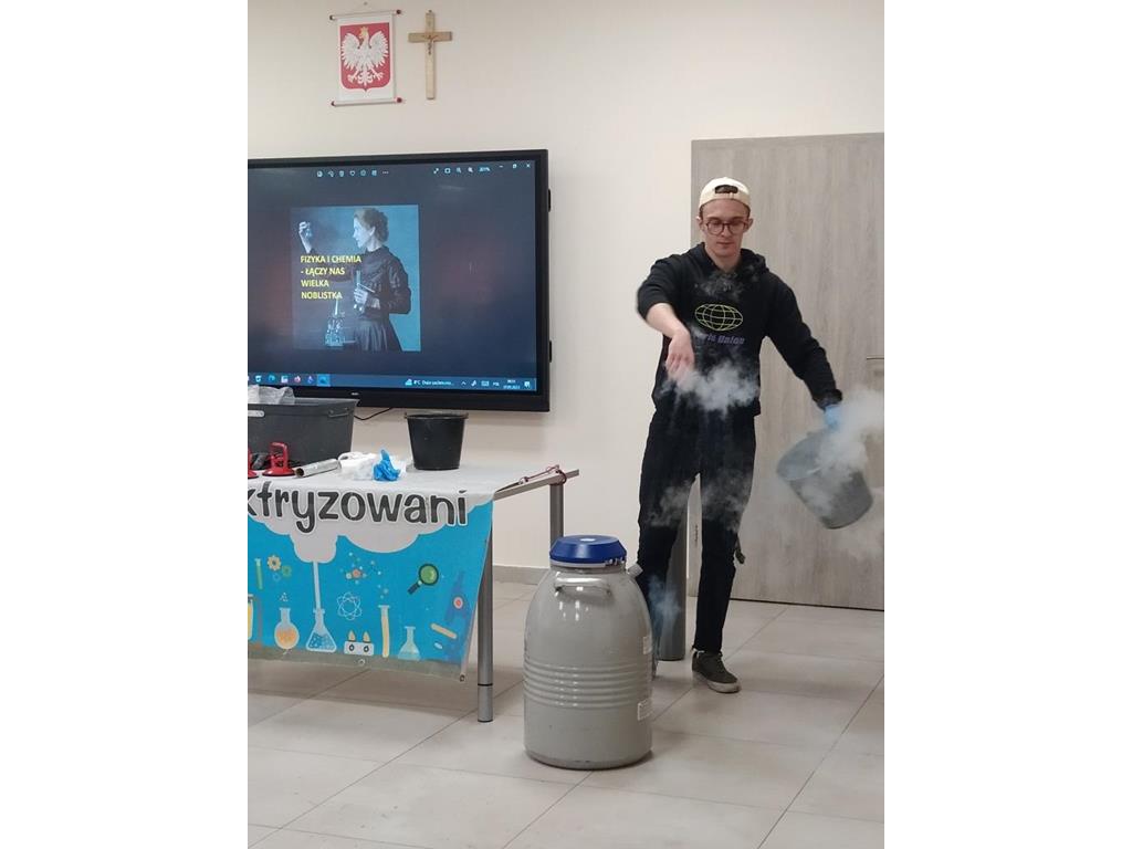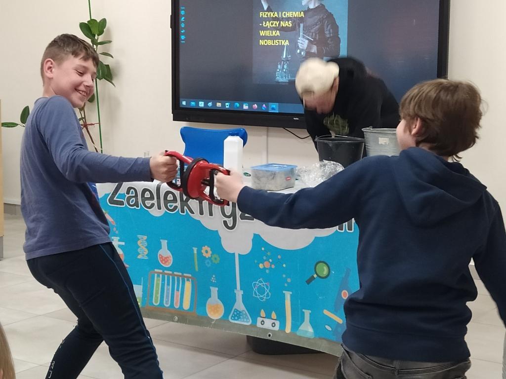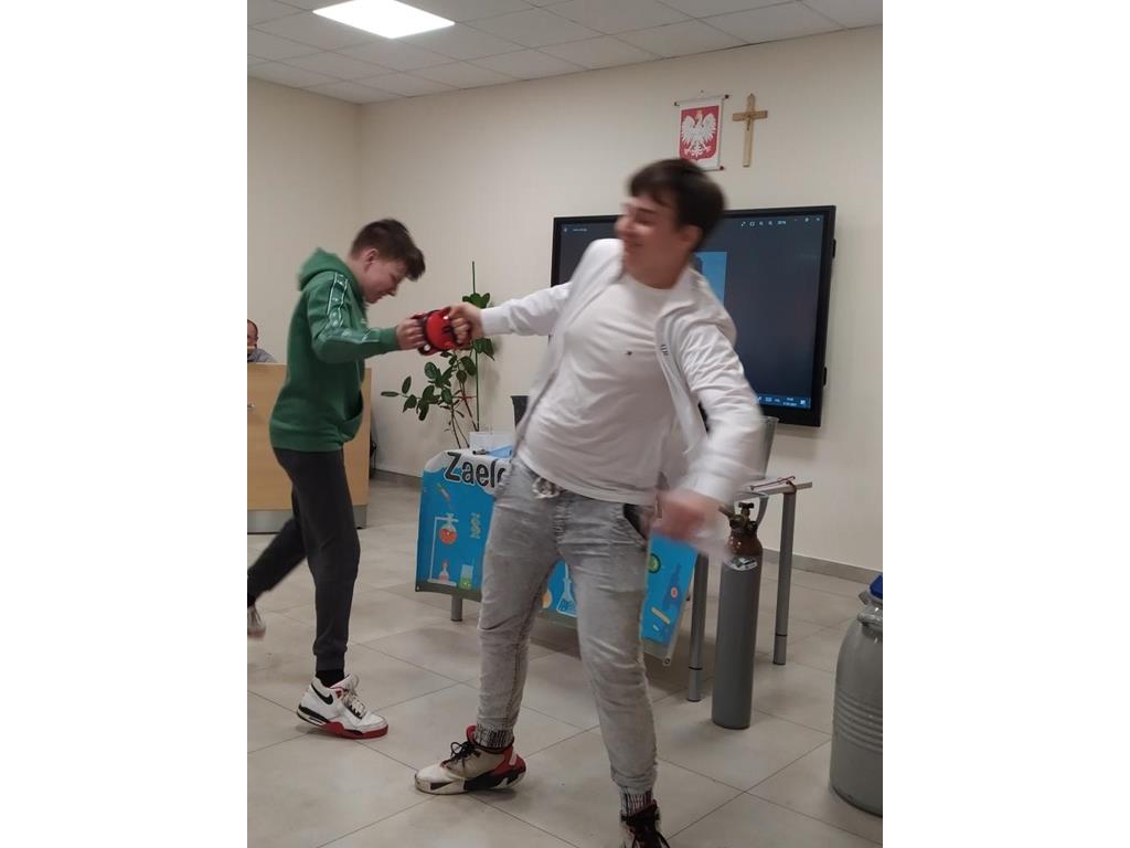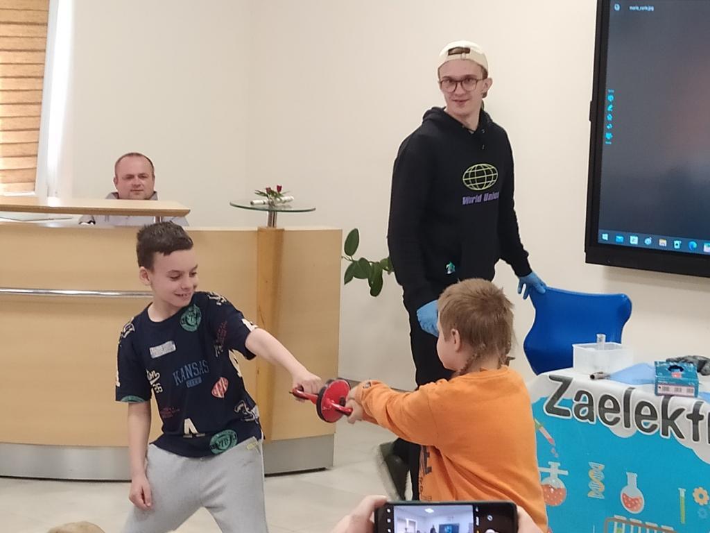 W środę naszą szkołę odwiedził pan Mikołaj z "Grupy Zaelektryzowani", który przeprowadził dla naszych uczniów niecodzienną lekcję pt. "Poczuj chemię do fizyki”. Scenariusz tych niecodziennych zajęć połączył w sobie elementy edukacyjne z humorystycznymi. Dzięki tym doświadczeniom wiemy, że świat, który nas otacza i zjawiska w nim zachodzące są pasjonujące i magiczne. Starsi i młodsi uczniowie mieli okazję zobaczyć niecodzienne eksperymenty fizyczne i chemiczne oraz zaobserwować ciekawe zjawiska fizyczne. Wśród nich znalazły się: efektowna, wybuchowa zabawa z wodorem, nadmuchiwanie foliowego rękawa, zabawy z helem i ciekłym azotem, jazda rowerem przeciwskrętnym czy rozdzielanie przyssawek.