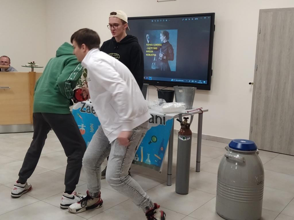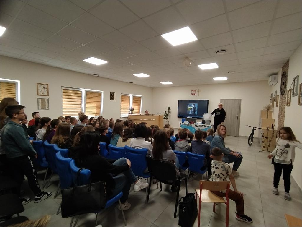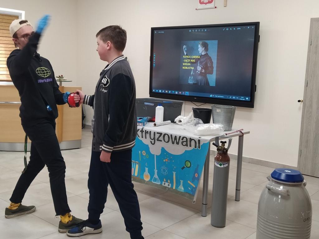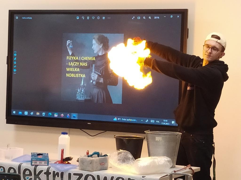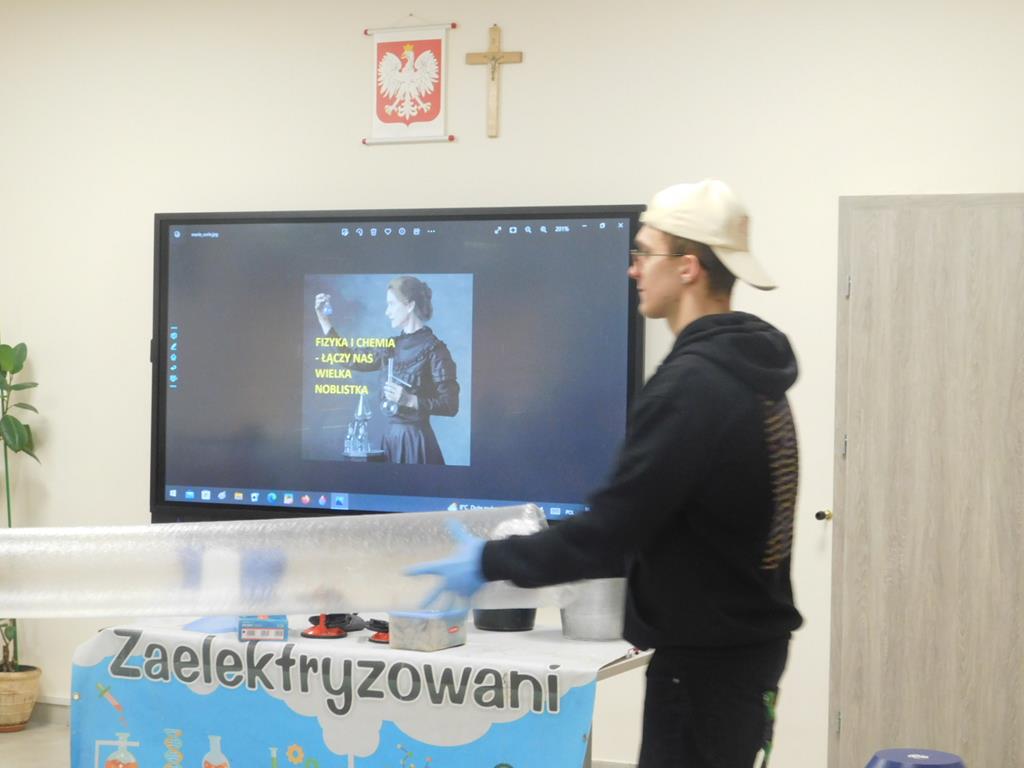 W środę naszą szkołę odwiedził pan Mikołaj z "Grupy Zaelektryzowani", który przeprowadził dla naszych uczniów niecodzienną lekcję pt. "Poczuj chemię do fizyki”. Scenariusz tych niecodziennych zajęć połączył w sobie elementy edukacyjne z humorystycznymi. Dzięki tym doświadczeniom wiemy, że świat, który nas otacza i zjawiska w nim zachodzące są pasjonujące i magiczne. Starsi i młodsi uczniowie mieli okazję zobaczyć niecodzienne eksperymenty fizyczne i chemiczne oraz zaobserwować ciekawe zjawiska fizyczne. Wśród nich znalazły się: efektowna, wybuchowa zabawa z wodorem, nadmuchiwanie foliowego rękawa, zabawy z helem i ciekłym azotem, jazda rowerem przeciwskrętnym czy rozdzielanie przyssawek.
