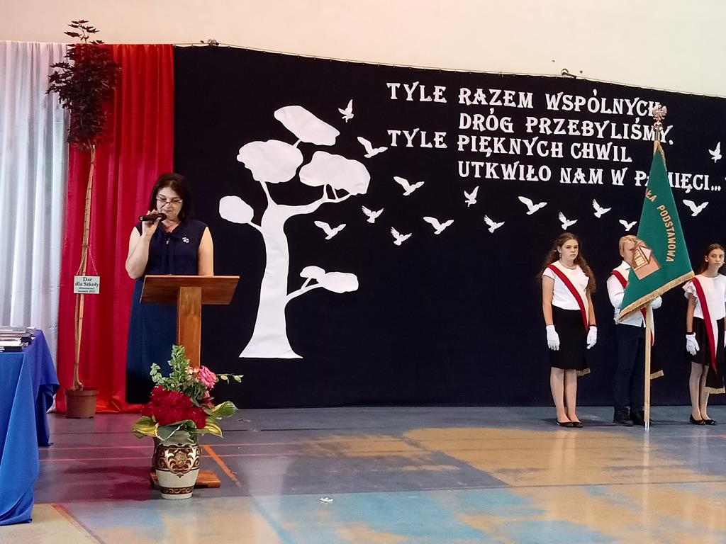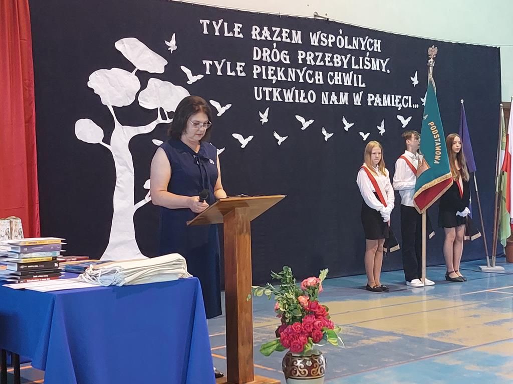 Pani Dyrektor zwróciła się do uczniów klasy najstarszej podsumowując ich pracę i wspominając sukcesy i osiągnięcia. Życzyła również dostania się do wybranych szkół, wspomniała o bezpieczeństwie podczas wakacji.