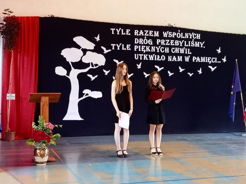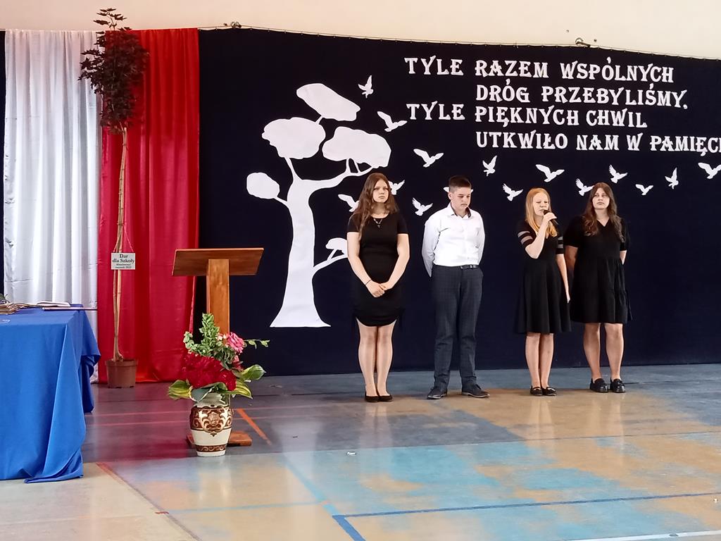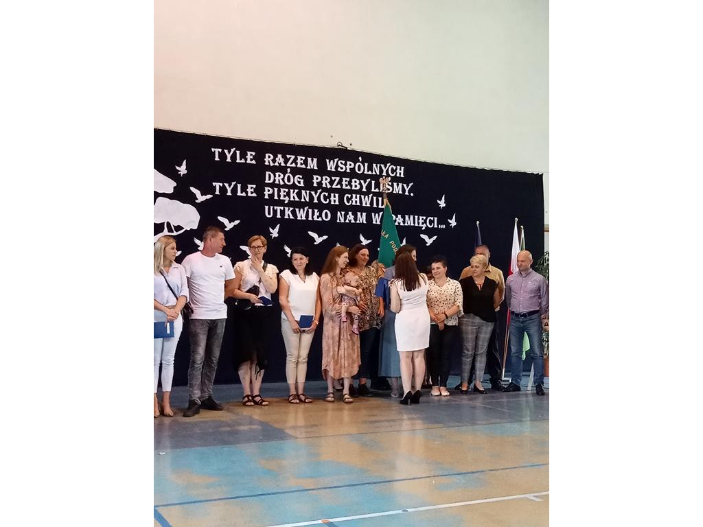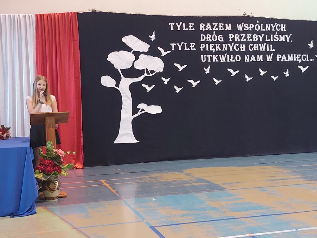 Delegacja złożona z przewodniczącej uczniów klasy VIII, rodziców i wychowawcy udali się wspólnie na korytarz, aby zawiesić na ścianie pamiątkowe tablo. Przedstawiciele Rodziców zabrali głos w imieniu rodziców absolwentów i przekazali pamiątkowe drzewko. Wychowawczyni klasy Pani Anna Filipiec w swoim przemówieniu nawiązała do wspólnie przebytych ośmiu lat i życzyła swoim wychowankom dostania się do upragnionych szkół, spełniania marzeń, odnoszenia sukcesów i osiągania zamierzonych celów oraz powodzenia w nowej szkole. Życzyła również bezpieczeństwa nie tylko w wakacje ale i w życiu.