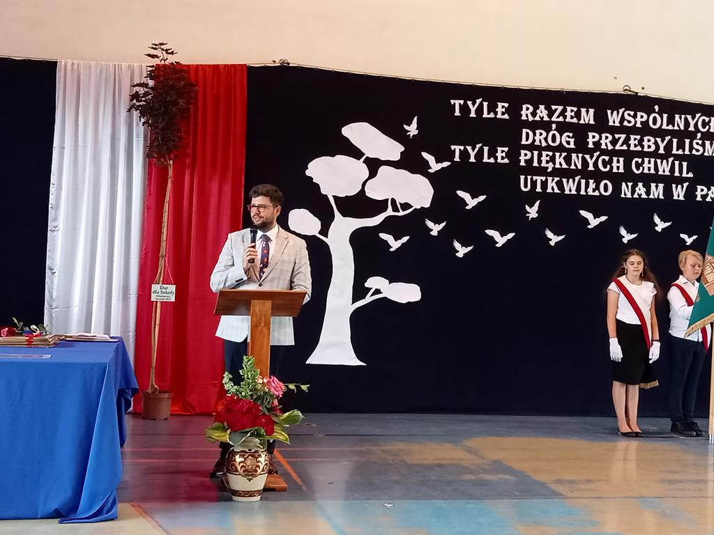 Wychowawca klasy VIII podziękował za współpracę, pomoc i wsparcie wszystkim rodzicom i wręczył podziękowania za owocną współpracę przez wszystkie lata nauki. Głos zabrali również zaproszeni goście: Wicewójt Gminy Słupca- Pan Cezary Przybylski oraz przewodnicząca Rady Rodziców- Pani Alina Maciaszek.