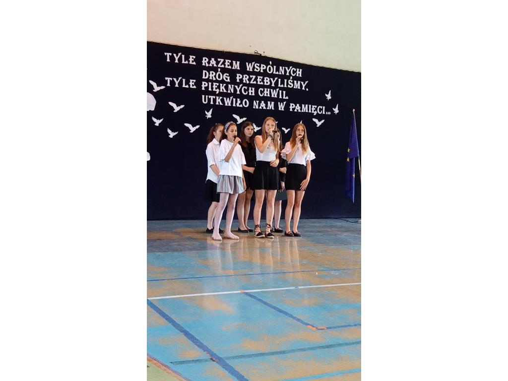 W imieniu uczniów klasy ósmej krótką część artystyczną przedstawili Kinga Graczyk, Maja Daniszewska, Szymon Kukulski i Justyna Górna a swe podziękowania przekazali Daria Drewniacka i Maja Konieczka, a Eryk Ryźlak zachwycił pięknym utworem, grając „Sonatę Księżycową” na pianinie. Delegacja uczniów klasy VII skierowała do absolwentów życzenia i przekazała drobne upominki.