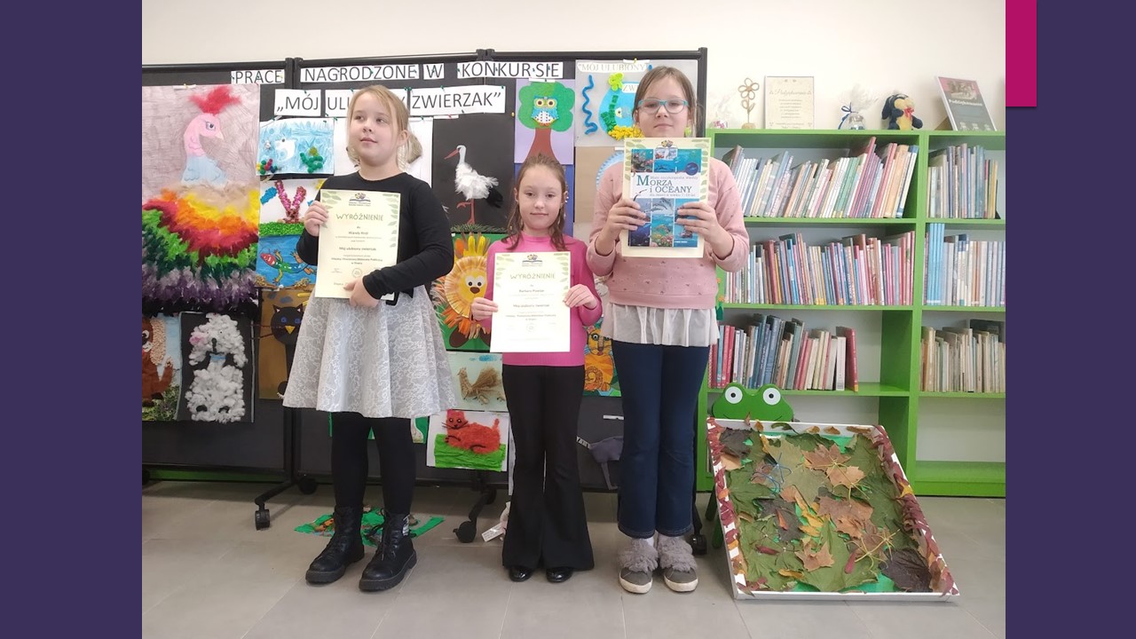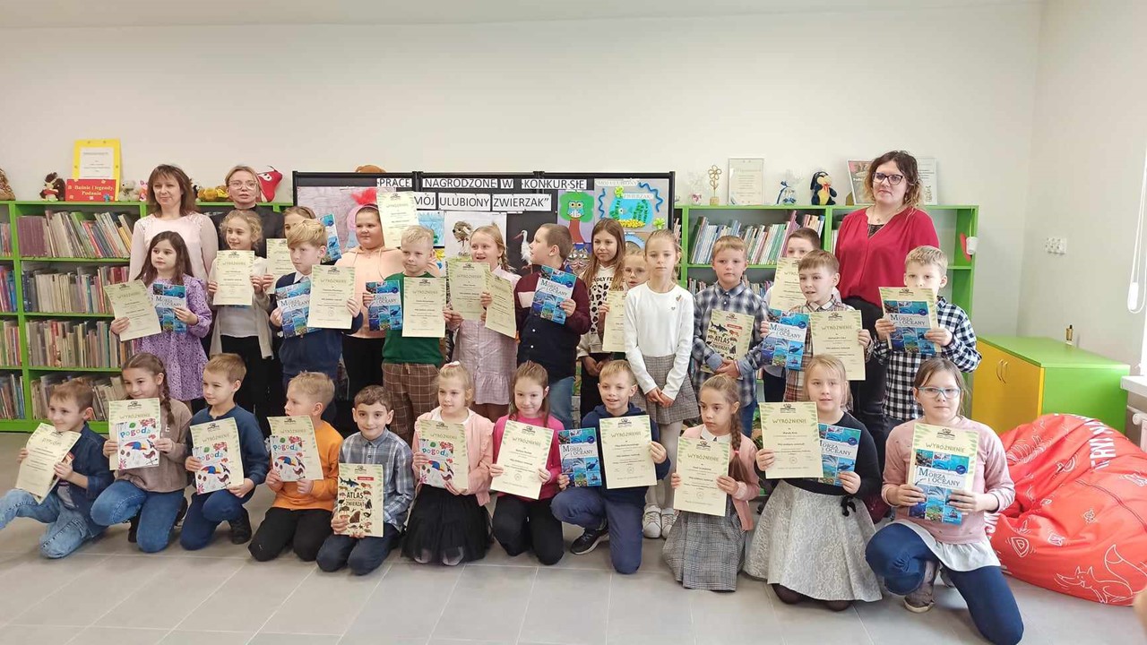 W tym roku szkolnym najmłodsi uczniowie naszej szkoły wzięli udział w powiatowym konkursie plastycznym zorganizowanym przez Miejską i Powiatową Bibliotekę w Słupcy. Zadaniem dzieci było stworzenie pracy plastycznej pod hasłem „Mój ulubiony zwierzak”.