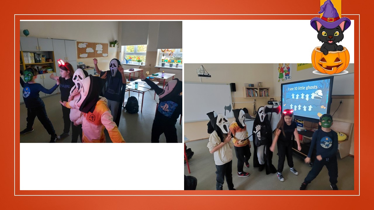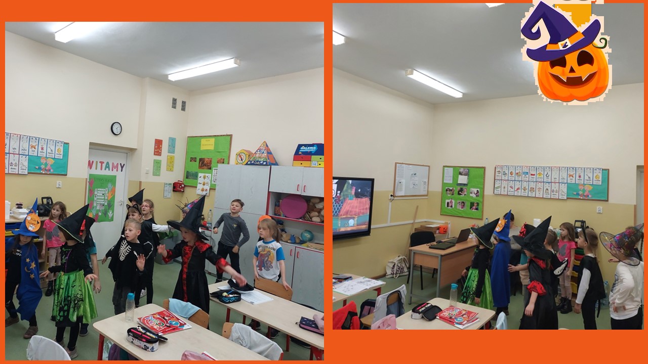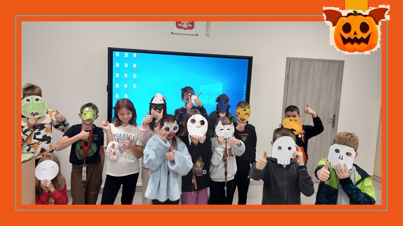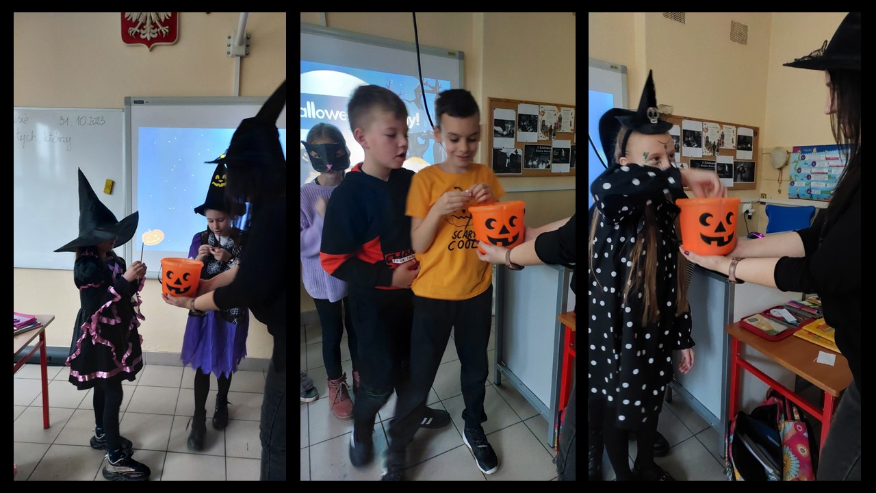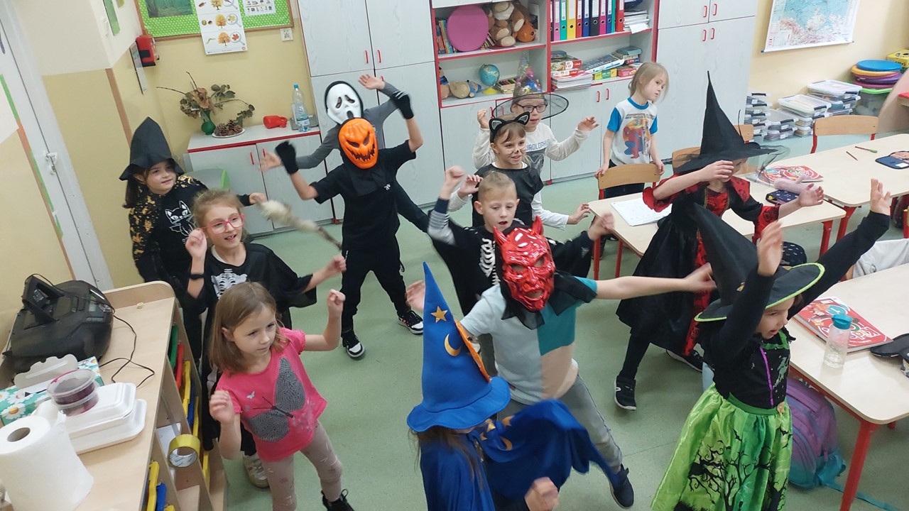 31 października przypada „Halloween”, to doskonała okazja, aby przeprowadzić nietypowe zajęcia językowe. W ostatnim tygodniu tego miesiąca w naszej szkole na lekcjach angielskiego, prowadzonych przez p. A. Filipec oraz p. J. Wiśną, uczniowie poznają kulturę anglosaską, uczą się słówek i wyrażeń związanych z Halloween. Oczywiście nie może obyć się bez masek czy kostiumów, które dzieci wykonują i zakładają w tych dniach na zajęciach. Podczas lekcji najmłodsi również oglądają filmiki, tańczą i śpiewają angielskie piosenki utrwalając poznane słownictwo. Jak mówi obyczaj nie może zabraknąć słodkiego upominku w myśl angielskiego hasła ,,Trick or Treat” czyli ,,Cukierek albo psikus”. Starsi uczniowie natomiast uczą się słownictwa oraz rozwiązują zagadki i zadania interaktywne. Szkołę natomiast ozdabiają przepięknie przygotowane dynie przez uczniów, które biorą udział w konkursie.