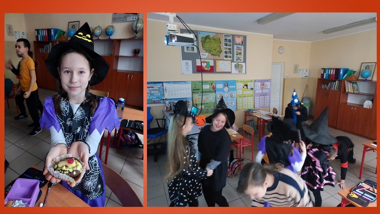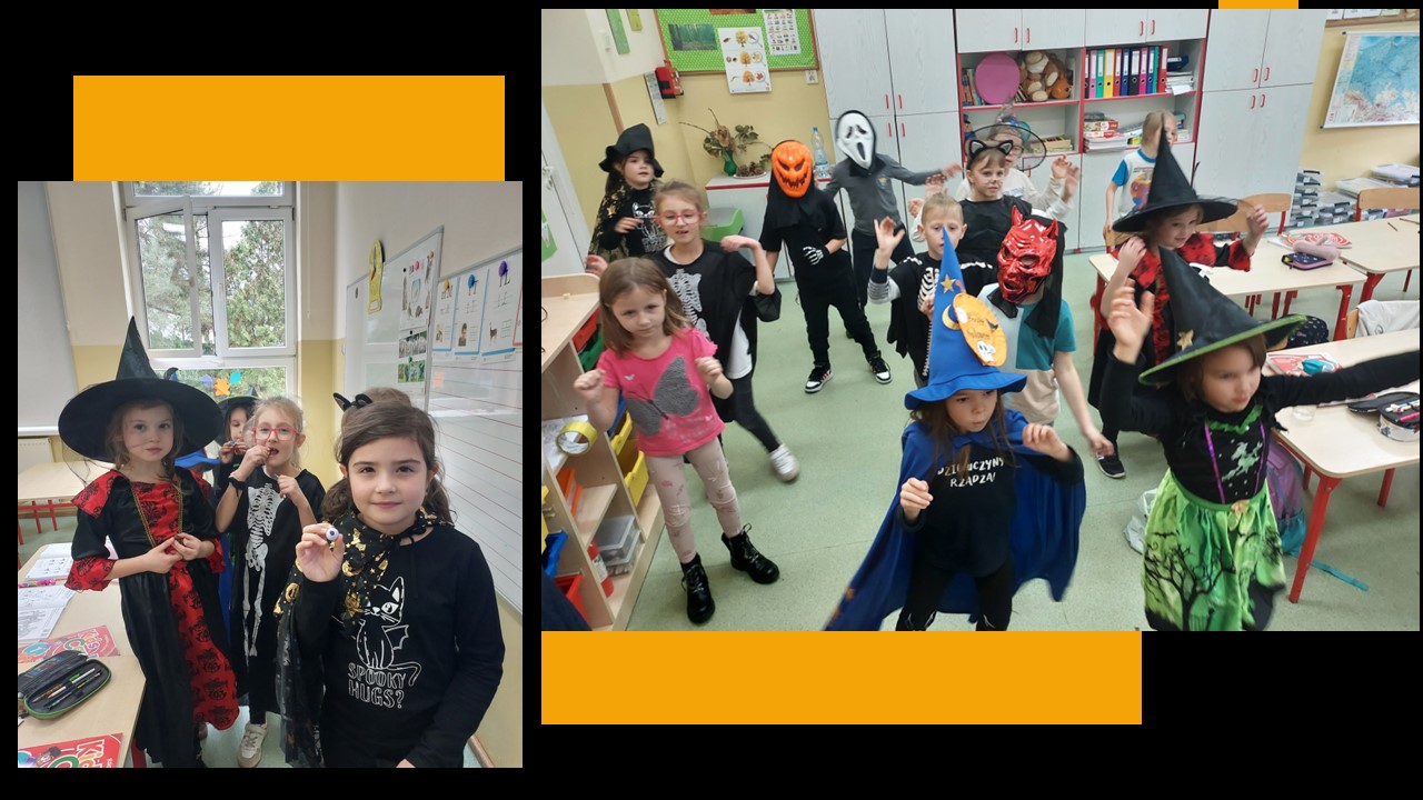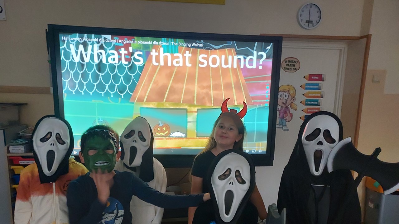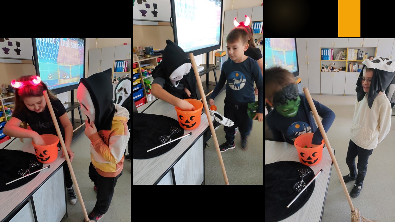 31 października przypada „Halloween”, to doskonała okazja, aby przeprowadzić nietypowe zajęcia językowe. W ostatnim tygodniu tego miesiąca w naszej szkole na lekcjach angielskiego, prowadzonych przez p. A. Filipec oraz p. J. Wiśną, uczniowie poznają kulturę anglosaską, uczą się słówek i wyrażeń związanych z Halloween. Oczywiście nie może obyć się bez masek czy kostiumów, które dzieci wykonują i zakładają w tych dniach na zajęciach. Podczas lekcji najmłodsi również oglądają filmiki, tańczą i śpiewają angielskie piosenki utrwalając poznane słownictwo. Jak mówi obyczaj nie może zabraknąć słodkiego upominku w myśl angielskiego hasła ,,Trick or Treat” czyli ,,Cukierek albo psikus”. Starsi uczniowie natomiast uczą się słownictwa oraz rozwiązują zagadki i zadania interaktywne. Szkołę natomiast ozdabiają przepięknie przygotowane dynie przez uczniów, które biorą udział w konkursie.