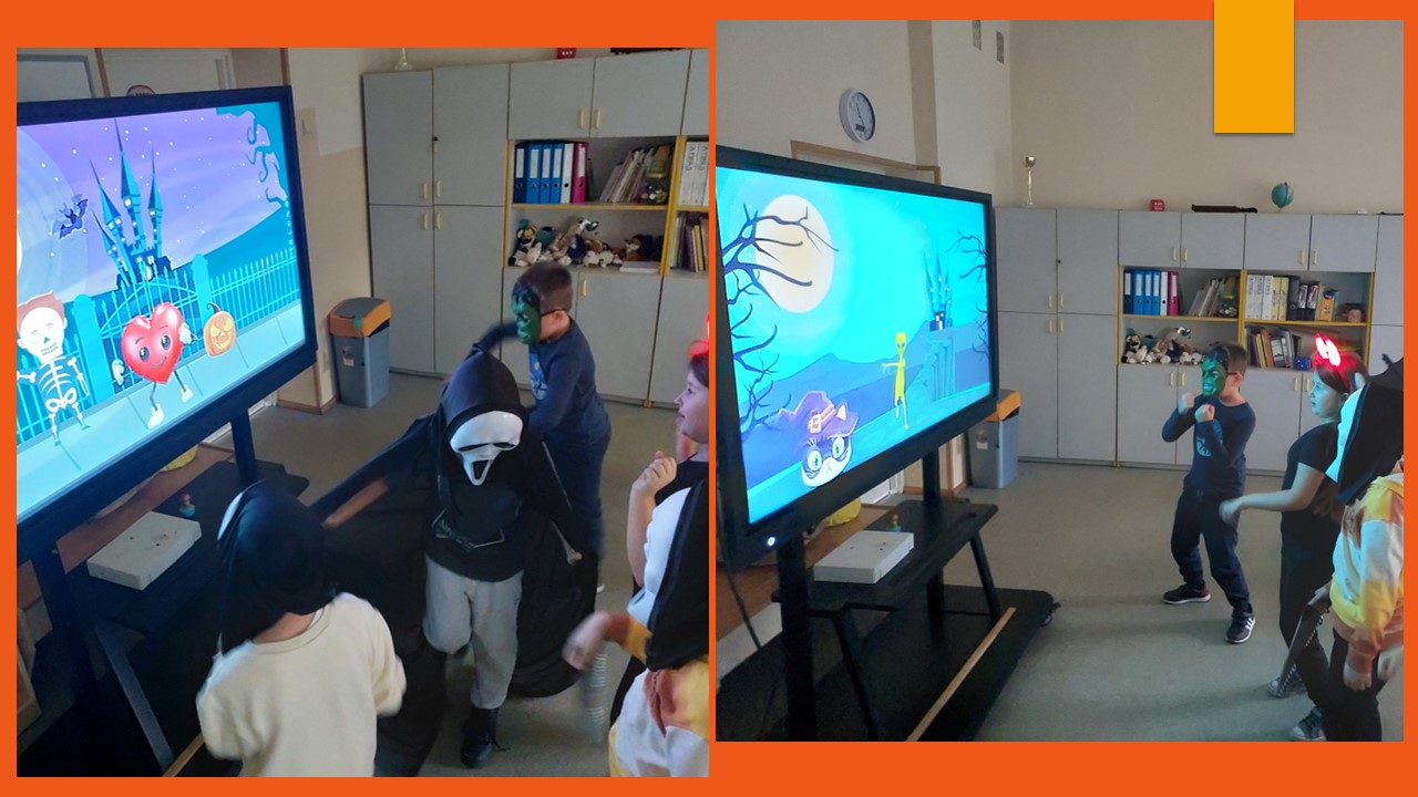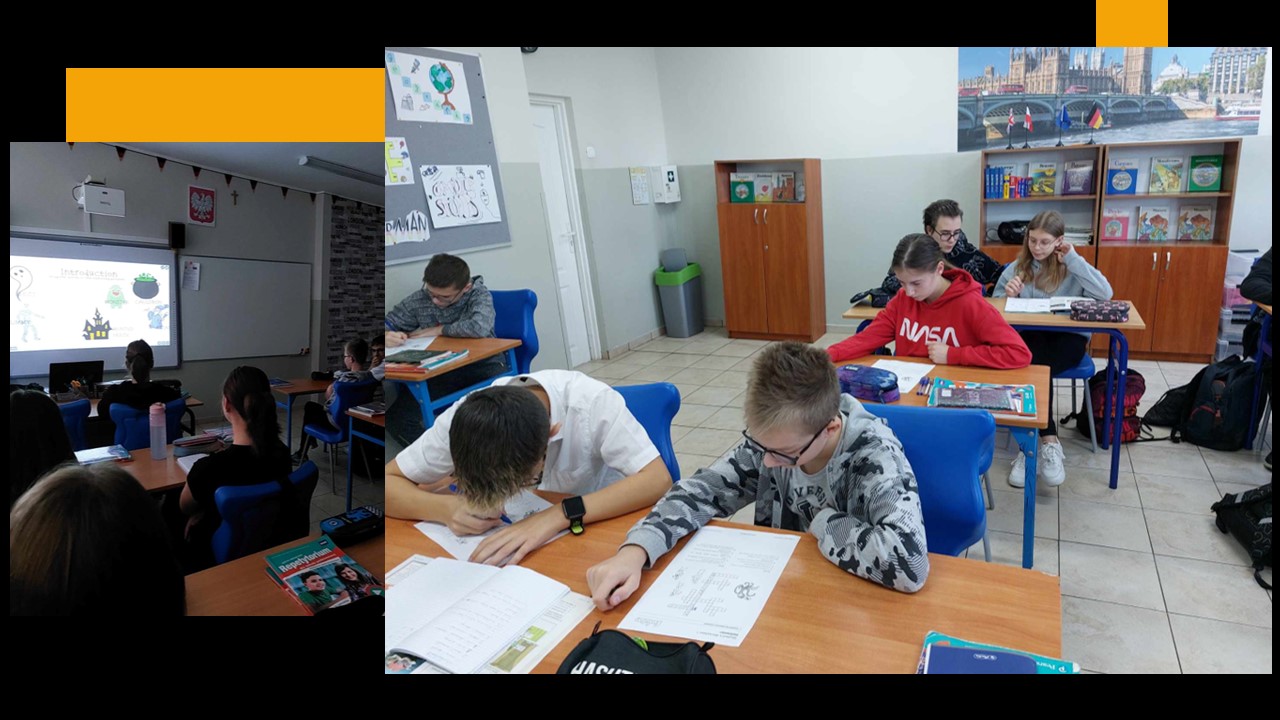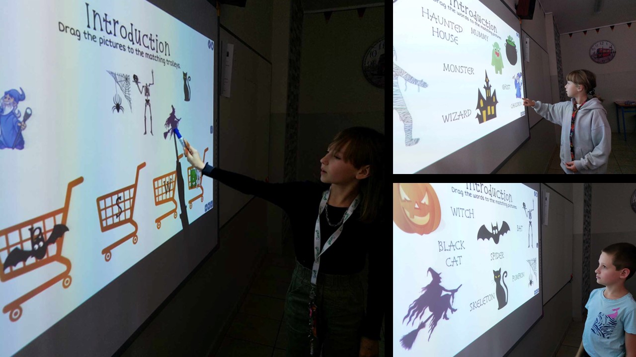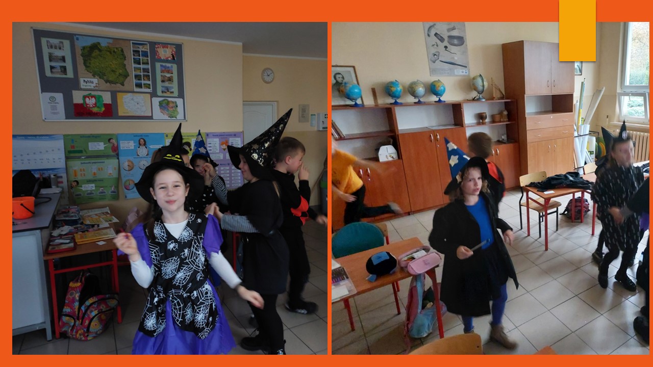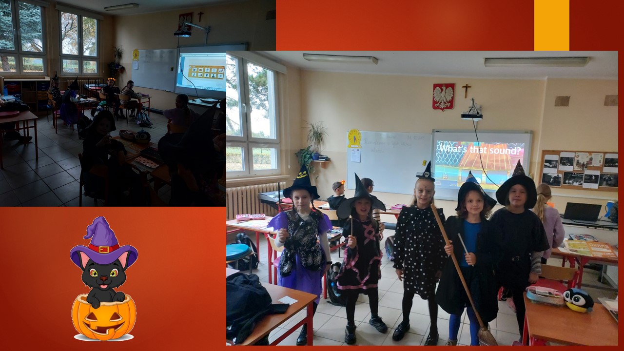 31 października przypada „Halloween”, to doskonała okazja, aby przeprowadzić nietypowe zajęcia językowe. W ostatnim tygodniu tego miesiąca w naszej szkole na lekcjach angielskiego, prowadzonych przez p. A. Filipec oraz p. J. Wiśną, uczniowie poznają kulturę anglosaską, uczą się słówek i wyrażeń związanych z Halloween. Oczywiście nie może obyć się bez masek czy kostiumów, które dzieci wykonują i zakładają w tych dniach na zajęciach. Podczas lekcji najmłodsi również oglądają filmiki, tańczą i śpiewają angielskie piosenki utrwalając poznane słownictwo. Jak mówi obyczaj nie może zabraknąć słodkiego upominku w myśl angielskiego hasła ,,Trick or Treat” czyli ,,Cukierek albo psikus”. Starsi uczniowie natomiast uczą się słownictwa oraz rozwiązują zagadki i zadania interaktywne. Szkołę natomiast ozdabiają przepięknie przygotowane dynie przez uczniów, które biorą udział w konkursie.