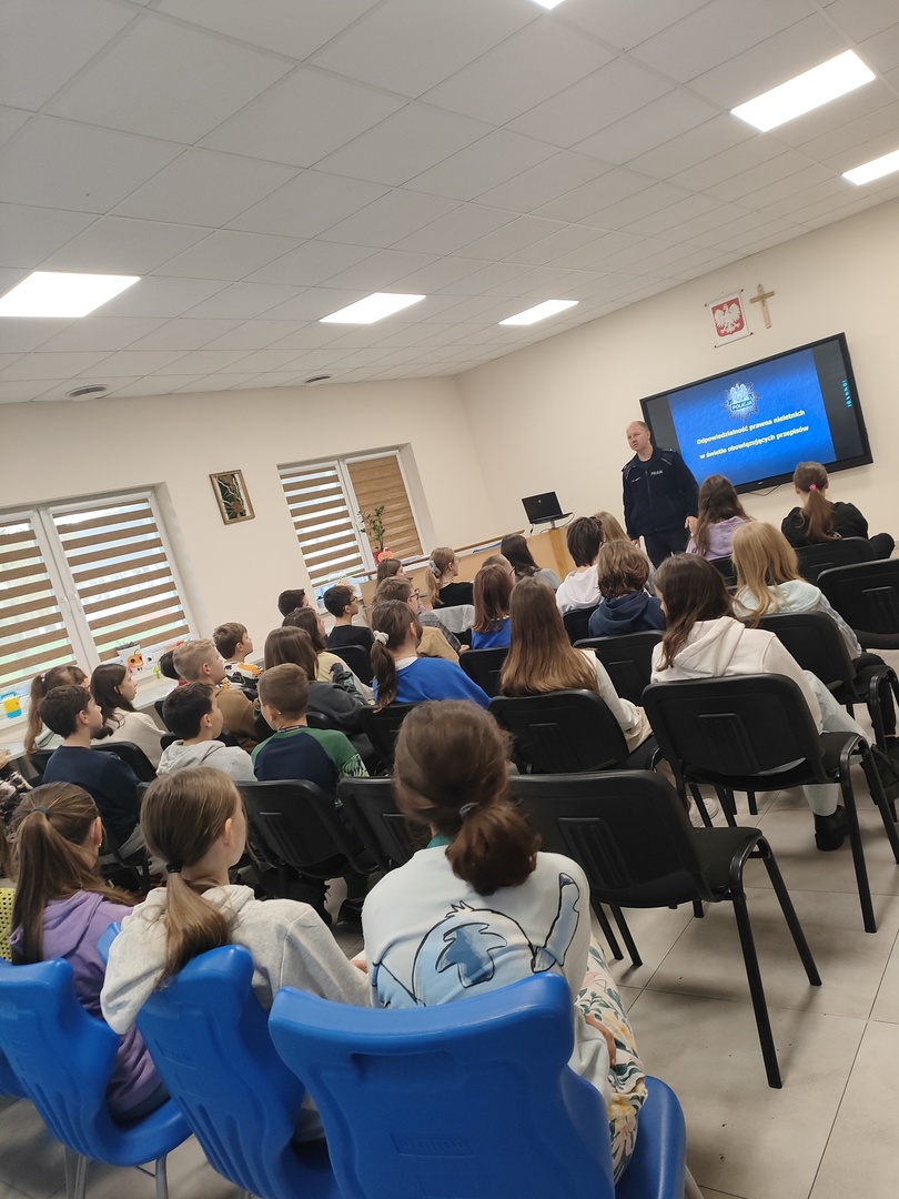 Dnia 08.11.2023 r odbyło się spotkanie klas 4-8 z funkcjonariuszem policji młodszym aspirantem Marcinem Dębowskim. Tematem przewodnim było: „Prawo nieletnich w świetle obowiązujących przepisów”. Warsztaty zostały przeprowadzone w ramach programu profilaktyczno – wychowawczego.
