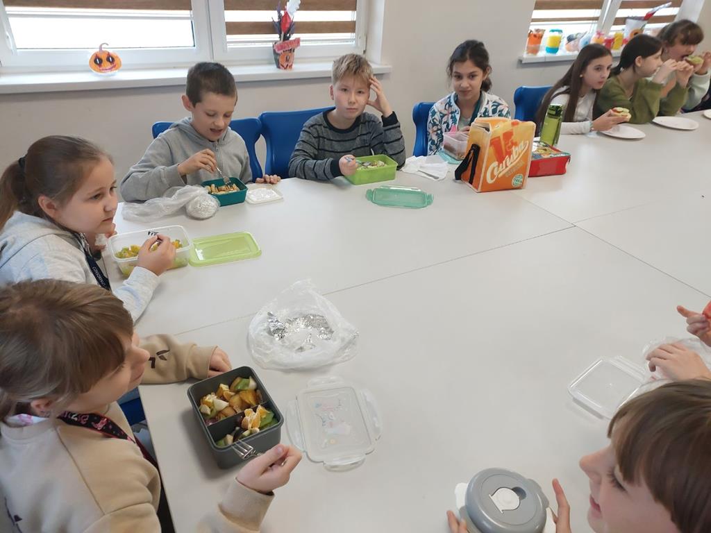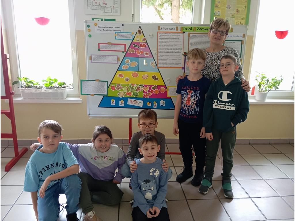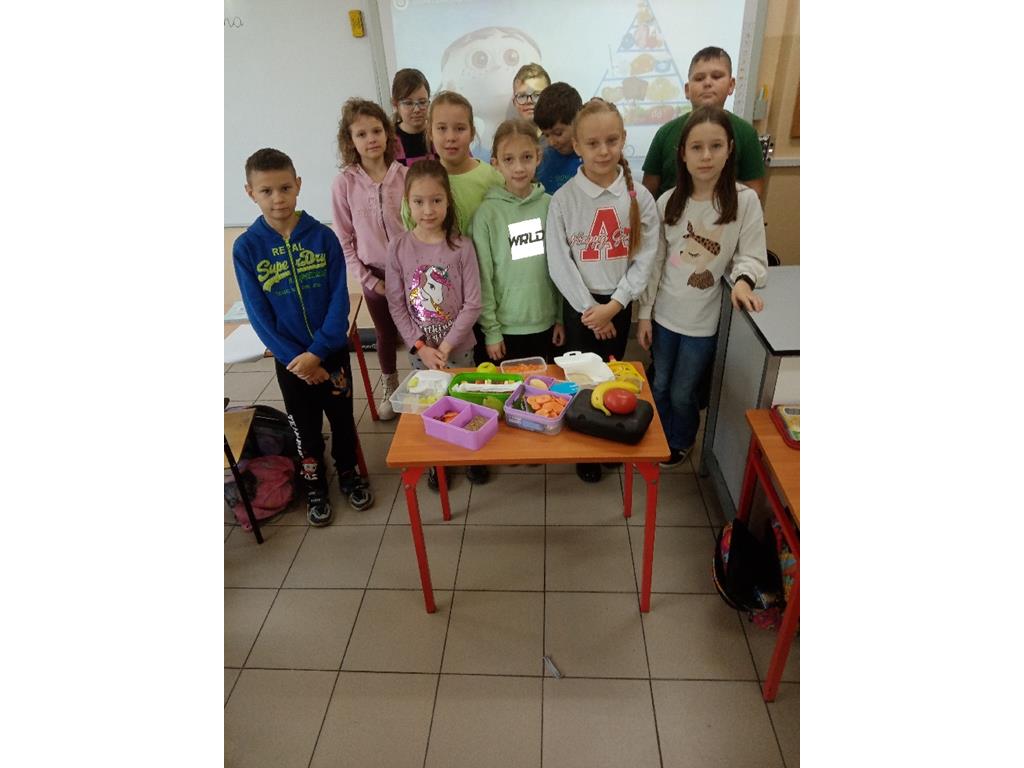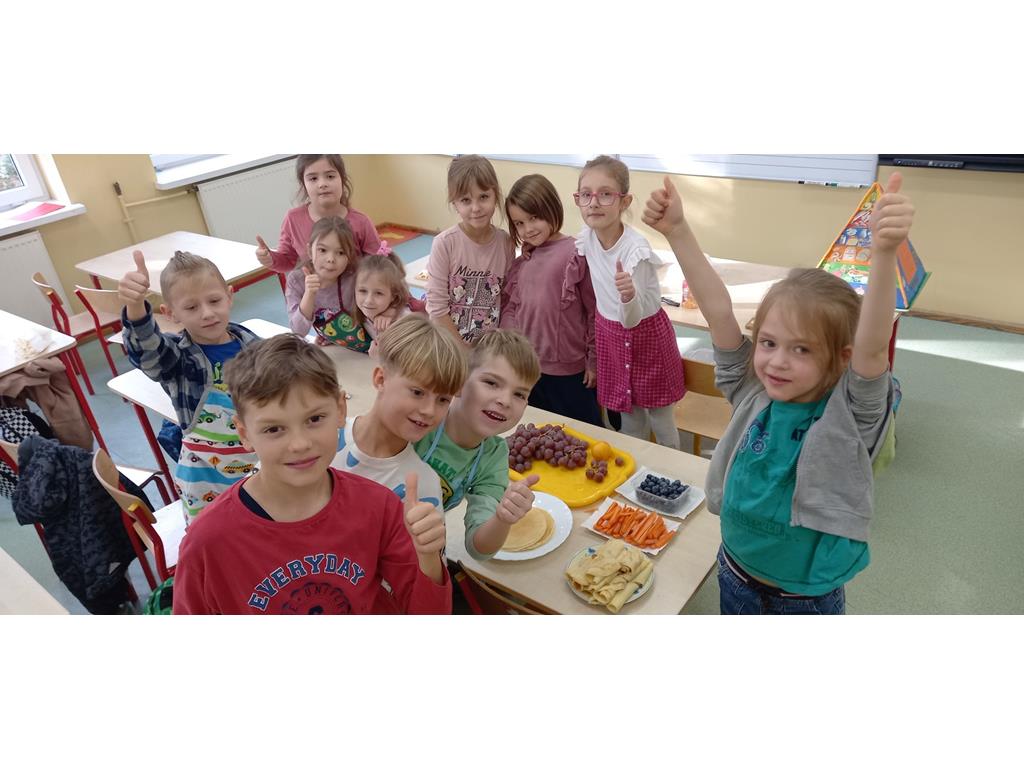 Najmłodsi uczniowie podczas zajęć dydaktycznych dowiedzieli się, co to jest piramida zdrowego żywienia oraz poznali zasady zdrowego odżywiania i stylu życia. Dzieci dowiedziały się również, że śniadanie to najważniejszy posiłek dnia. Dzięki niemu mają dobry humor i energię do nauki i zabawy. Śniadanie dostarcza energii potrzebnej do efektywnego rozpoczęcia dnia, wpływa na lepszą koncentrację, zapamiętywanie, zdolność uczenia się.