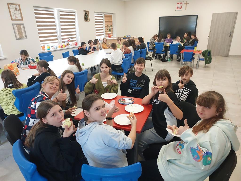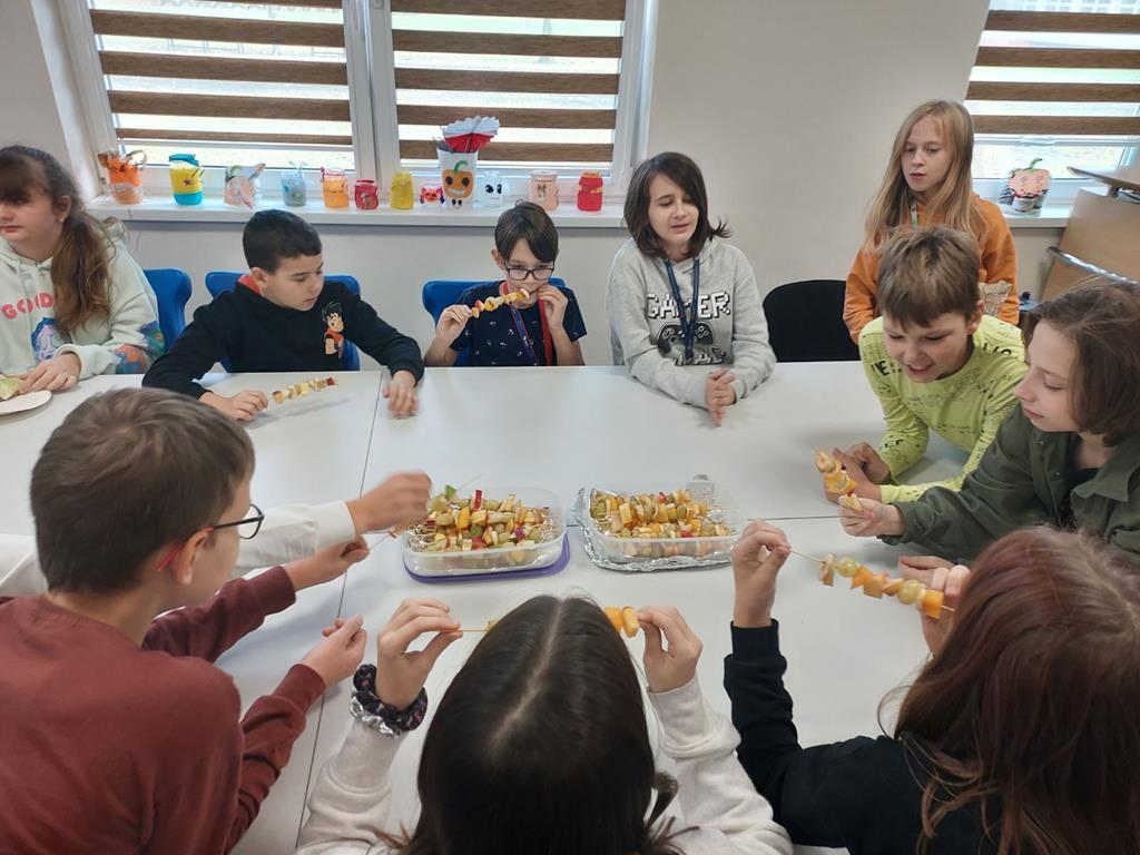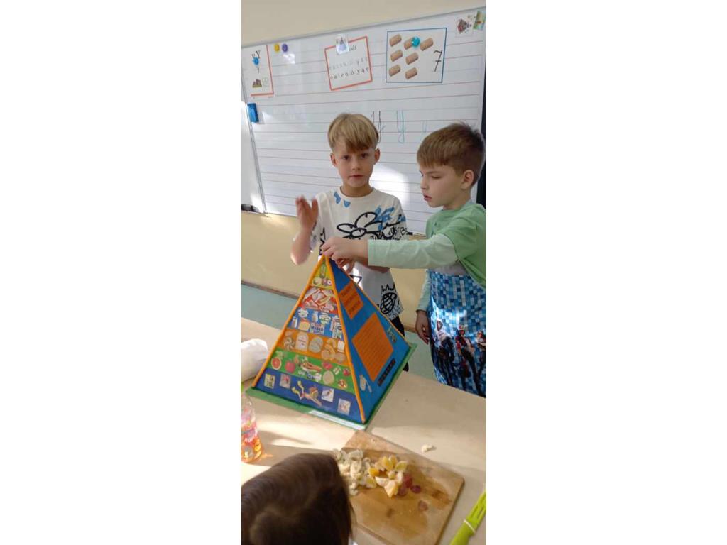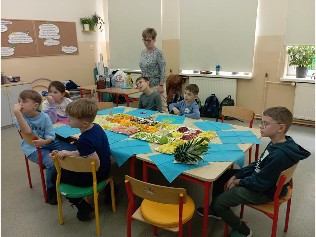 Najmłodsi uczniowie podczas zajęć dydaktycznych dowiedzieli się, co to jest piramida zdrowego żywienia oraz poznali zasady zdrowego odżywiania i stylu życia. Dzieci dowiedziały się również, że śniadanie to najważniejszy posiłek dnia. Dzięki niemu mają dobry humor i energię do nauki i zabawy. Śniadanie dostarcza energii potrzebnej do efektywnego rozpoczęcia dnia, wpływa na lepszą koncentrację, zapamiętywanie, zdolność uczenia się.