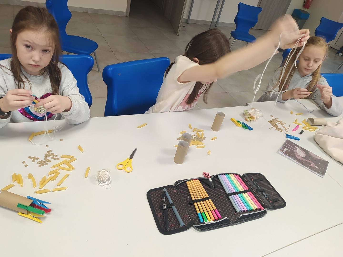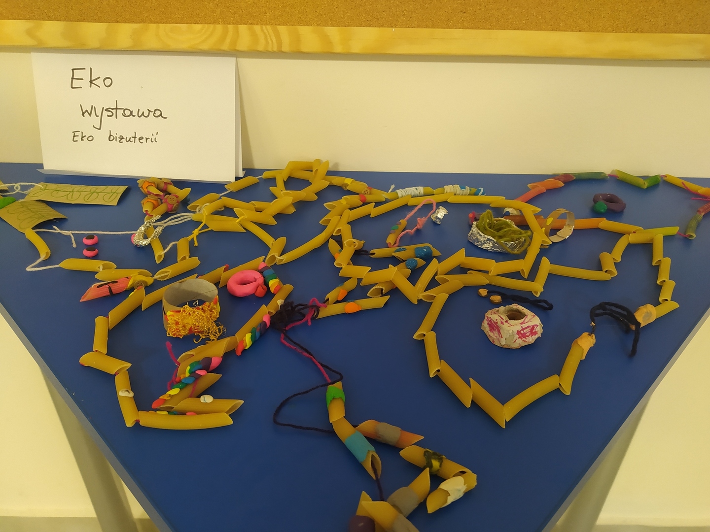 W ramach zajęć w świetlicy uczniowie przygotowali dla społeczności szkolnej wystawę ekobiżuterii, wykonanej z kawałków wełny, makaronu, folii aluminiowej, nakrętek, plasteliny, rolek po papierze toaletowym, wydmuszek po jajkach. Przygotowane zostały łańcuszki na rękę, kolczyki, wisiorki oraz pierścionki. Tworzenie ekobiżuterii sprawiło uczniom wiele frajdy. Pomysłowości nie było końca. Odwiedzającym wystawę bardzo podoba się biżuteria.