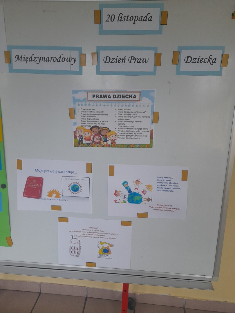 Najmłodsi uczniowie z klas 0 – III zapoznali się z Konwencją Praw Dziecka. Wysłuchali piosenki „Nasze prawa”. Starsi uczniowie podczas zajęć wychowawczych, świetlicowych uczestniczyli w debatach, dyskutowali na temat praw dzieci i ich przestrzegania w różnych krajach. Indywidualnie i grupowo wykonywali kolorowe prace plastyczne, rysunki i plakaty. Oglądali filmy edukacyjne o tematyce związanej z prawami dziecka. Na stronie internetowej szkoły, Facebooku poinformowaliśmy całą społeczność o włączeniu się do międzynarodowej akcji. W holu korytarza przygotowaliśmy gazetkę szkolną dla uczniów i rodziców, na której zamieściliśmy materiały informujące o prawach dzieci i o Konwencji.