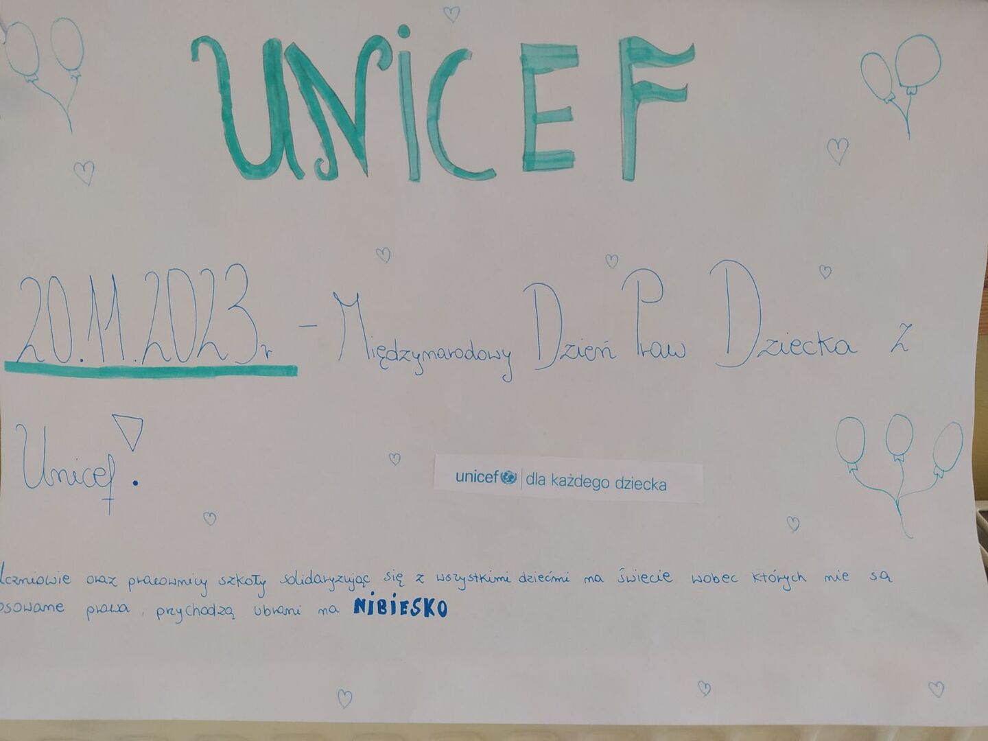 20 listopada obchodziliśmy Międzynarodowy Dzień Praw Dziecka. Nasza szkoła włączyła się do globalnej akcji UNICEF. W szkole odbyły się liczne zajęcia edukacyjne dotyczące tematyki praw dzieci. Pracowaliśmy także na materiałach udostępnionych przez UNICEF. Samorząd Uczniowski pod kierunkiem opiekuna zorganizował akcję ,,Ubierz się na niebiesko”, ,,Weź ze sobą niebieski balonik”.