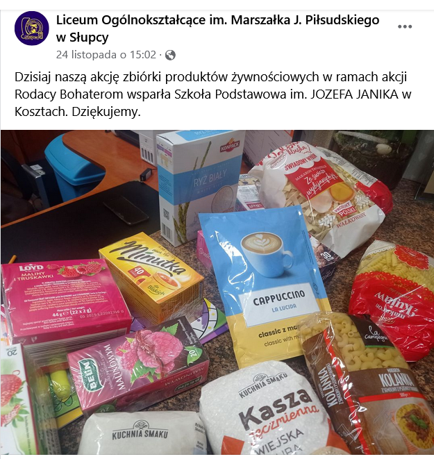 Szkolny Wolontariat przyłączył się do akcji „Rodacy Bohaterom”, której koordynatorem jest Liceum Ogólnokształcące w Słupcy. Potrzebne były dary żywnościowe, które będą przeznaczone dla kombatantów w Polsce i na Kresach, polskich środowisk kresowych (nauczycieli, seniorów, lokalnych działaczy), parafii, placówek edukacyjnych, domów polskich oraz hospicjum bł.ks.Michała Sopoćki w Wilnie, a także dla polskich rodzin wielodzietnych i osób żyjących w trudnych warunkach. Głównym organizatorem zbiórki na terenie Polski jest Stowarzyszenie Odra – Niemen. Zebrane dary zostały przekazane do lokalnego koordynatora, za co dostaliśmy podziękowania osobiste jak również zamieszczone na fb liceum. Dziękujemy wszystkim, którzy włączyli się w akcję.