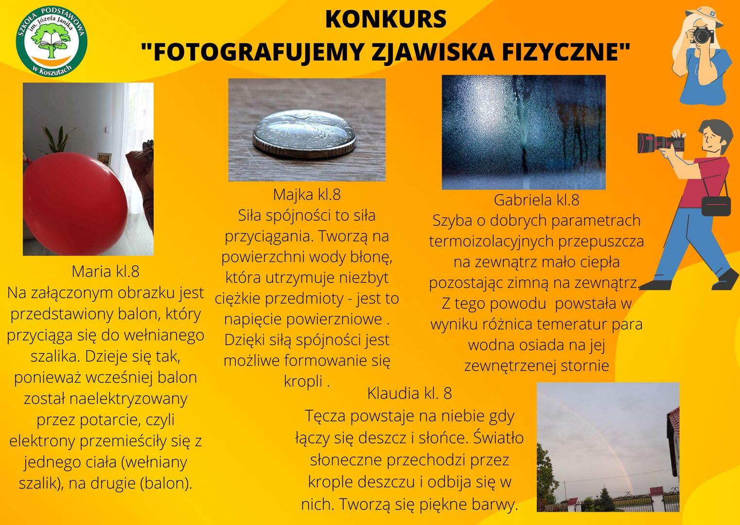 W naszej szkole zorganizowany został konkurs pt.: „Fotografujemy zjawiska fizyczne”. Trwał on do dnia 09.11.2023 r. Organizatorem Konkursu był nauczyciel fizyki. Celem Konkursu było rozbudzanie zainteresowania zjawiskami otaczającego świata; kształtowanie ciekawości poznawczej przejawiającej się w formułowaniu pytań i szukaniu odpowiedzi z wykorzystaniem metodologii badawczej; wyrabianie nawyku poszerzania wiedzy, korzystania z materiałów źródłowych i bezpiecznego eksperymentowania; posługiwanie się pojęciami i językiem charakterystycznym dla fizyki, odróżnianie znaczenia pojęć w języku potocznym od ich znaczenia w nauce. Uczestnikami konkursu byli uczniowie klasy VIII, a warunkiem uczestnictwa było przesłanie zdjęcia zjawiska fizycznego oraz opisanie fotografii w 3 zdaniach na wskazany adres mail. Konkurs składał się z jednego etapu, a ocenie podlegało: