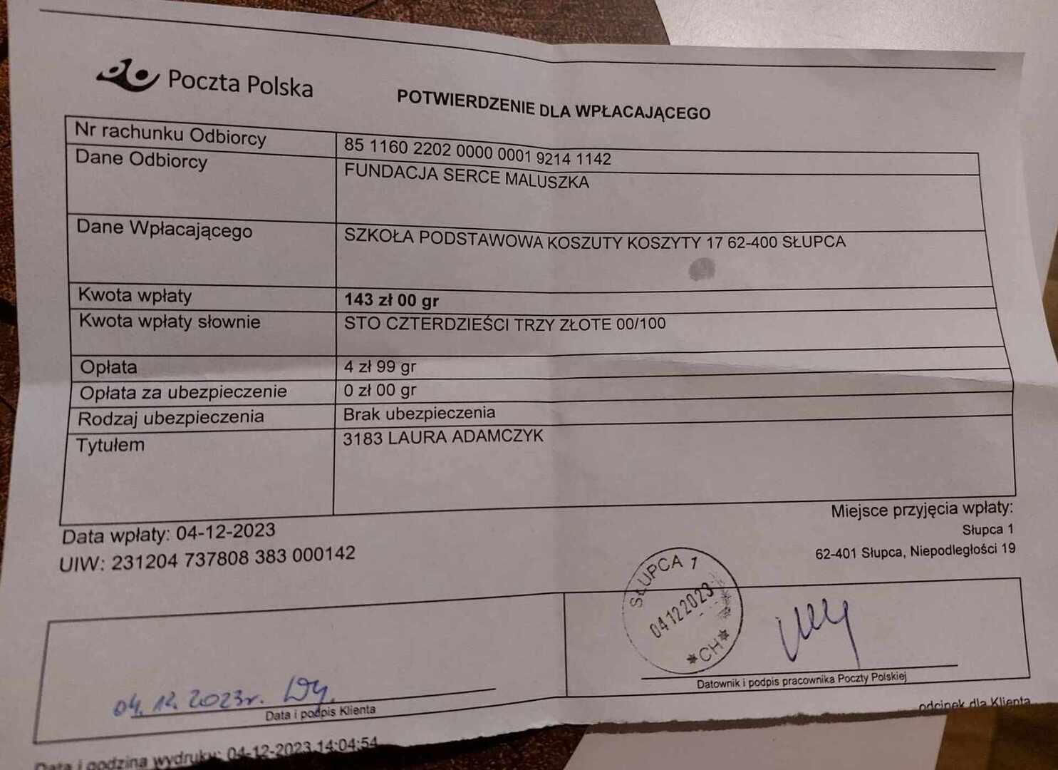 W październiku z okazji Dnia Nauczyciela w naszej szkole zorganizowano akcję: „Zamiast kwiata wrzuć piątaka”, do której włączyli się Dyrektor Szkoły, Nauczyciele oraz Pracownicy. Polegała ona na tym, żeby zamiast kwiatka, wrzucić pieniążek do specjalnie oznaczonej puszki. Zebrane fundusze miały być przeznaczone na szczytny cel. Do puszki w tym dniu wrzucono 143 zł. Kwota ta po zaczerpnięciu opinii Rady oraz Samorządu Uczniowskiego została wpłacona na konto Laury Adamczyk. (https://sercadlamaluszka.pl/nasi-podopieczni/laura-maria-adamczyk?fbclid=IwAR0cmV6q9eMhd9v1_voxq9Qh_RvVeZG55lp-aJYMJaSNKaqtZDA6u0gbR6A)