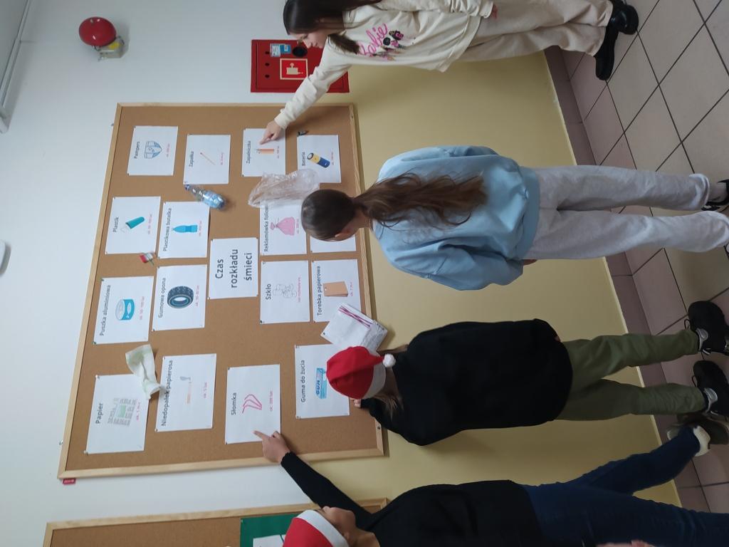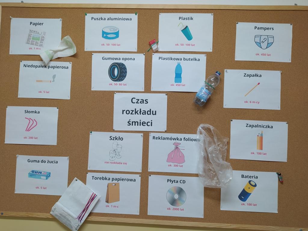 Liczba odpadów jakie produkujemy rośnie w zatrważającym tempie. W ramach ogólnopolskiego programu Eko-szkoła realizowanego w naszej szkole, w celu kształtowania postaw ekologicznych uczniów i zwrócenia uwagi na ilość wytwarzanych odpadów na co dzień, na holu powstała gazetka: „Czas rozkładu śmieci”. Tempo rozkładu odpadów zależy od wielu czynników. Przede wszystkim od typu danego odpadu oraz od warunków klimatycznych przechowywania. Wysoka temperatura i duża wilgotność powietrza mocno przyśpieszają procesy zachodzących w przyrodzie, a co za tym idzie rozkład śmieci. Na tempo ma również wpływ jakość materiału oraz wielkość odpadu.
