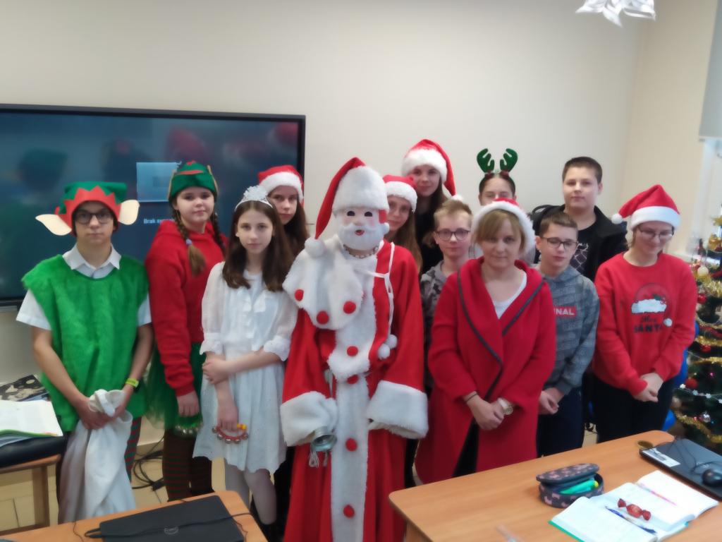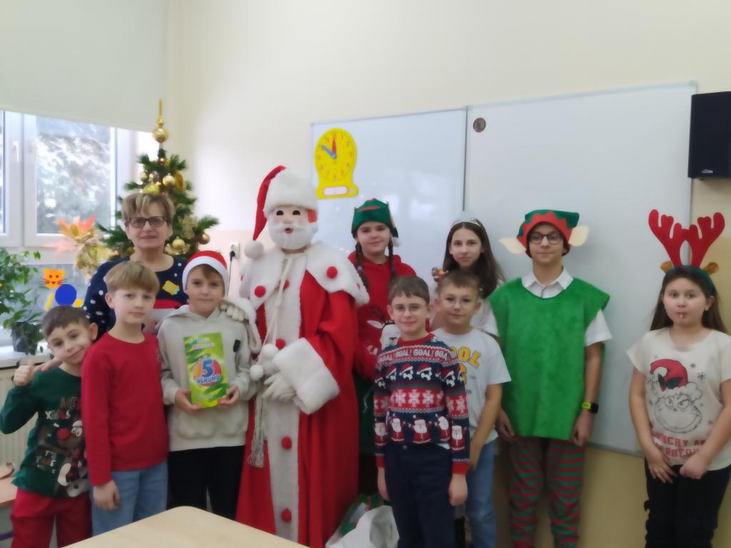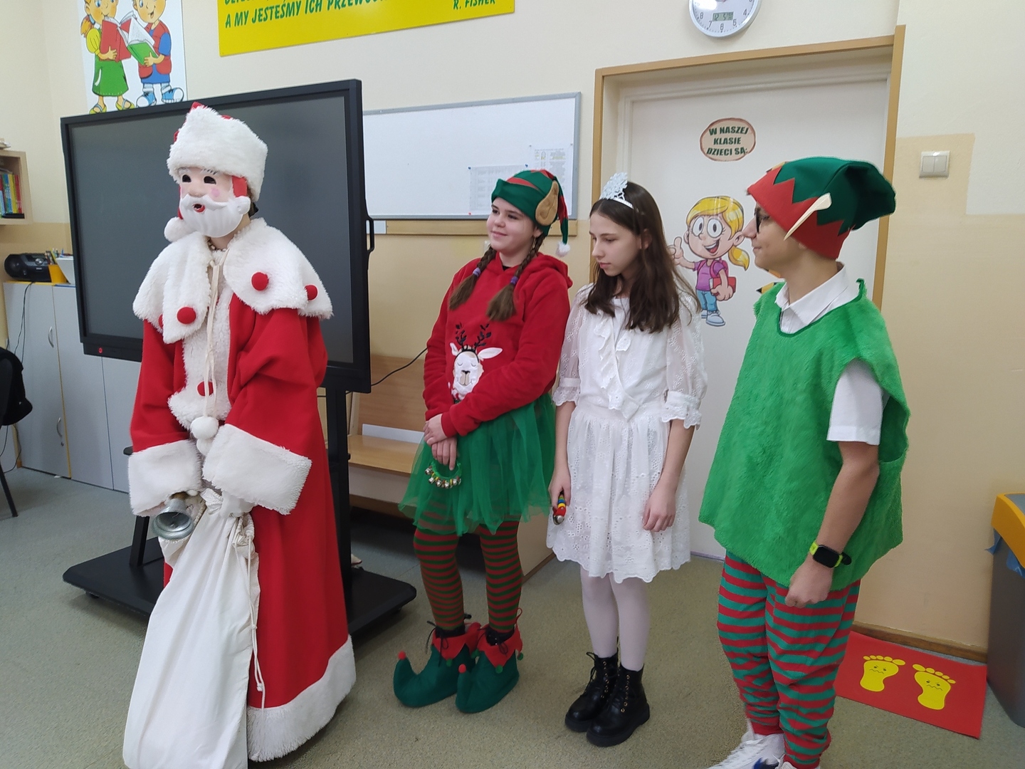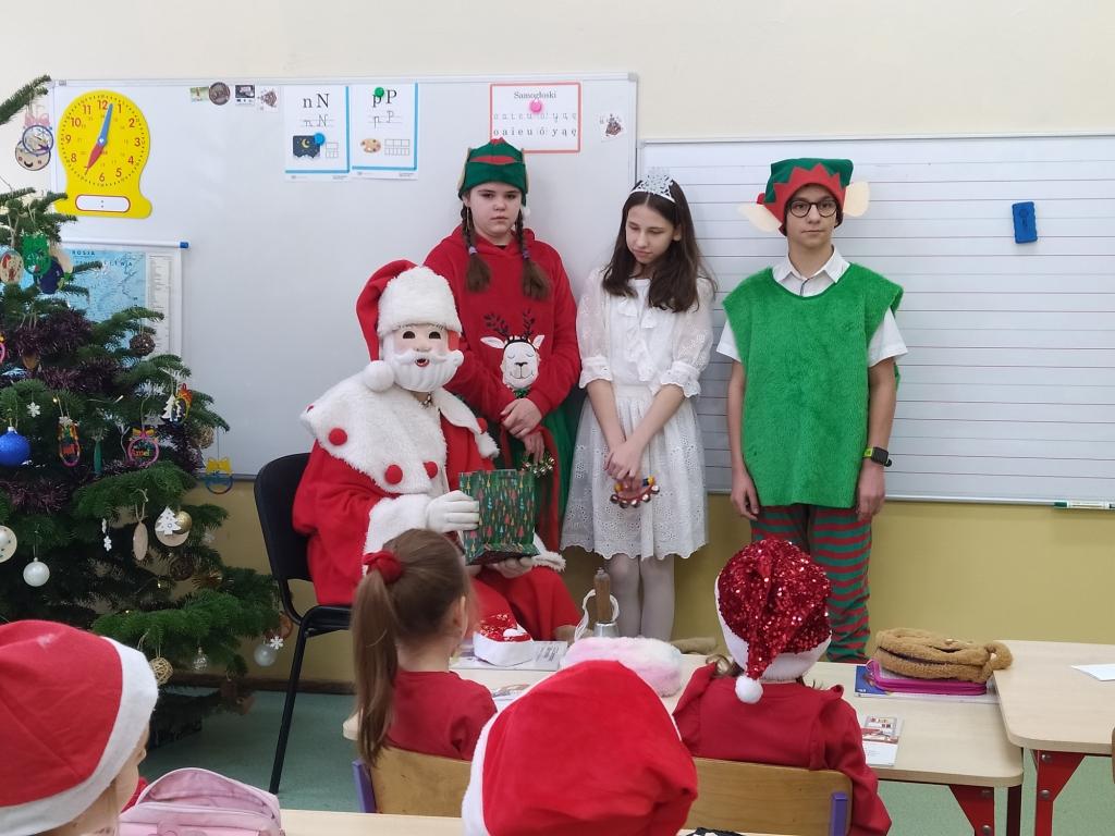 W środę w naszej placówce odbyły się Mikołajki zorganizowane przez Samorząd Uczniowski. W naszej szkole podtrzymujemy tą mikołajkową tradycję. Od samego rana z każdej strony kręciły się po korytarzach dzieci ubrane w mikołajkowe czapki. Nasz cudowny Mikołaj wraz ze swoją asystą: piękną śnieżynką oraz elfami, odwiedziły grzecznych uczniów oraz nauczycieli naszej szkoły i obdarowały ich prezentami. Każdy mógł skorzystać z okazji, by zrobić sobie pamiątkowe zdjęcie, ponieważ taka okazja trafia się raz w roku ;).