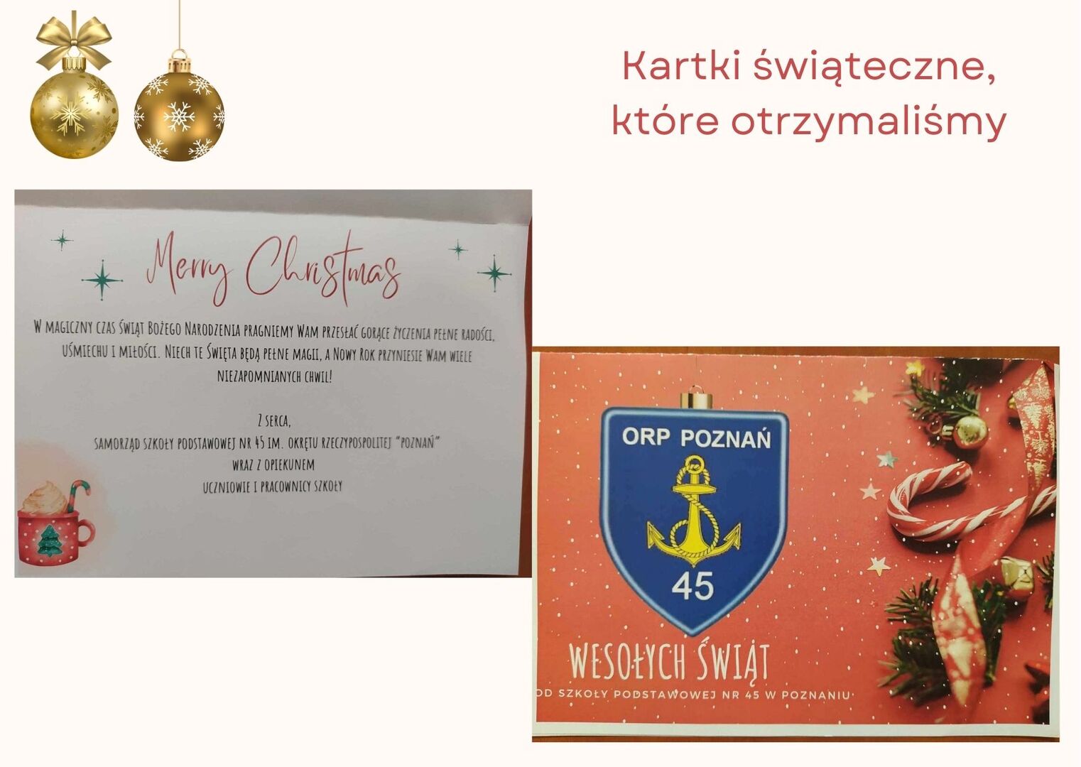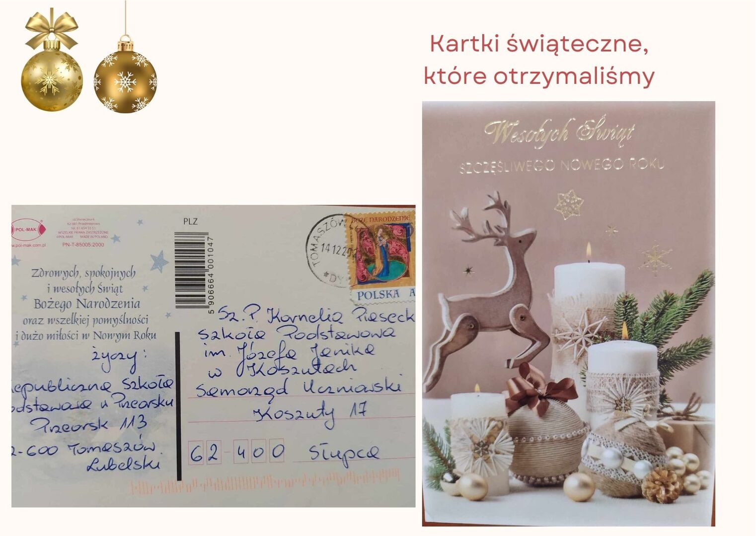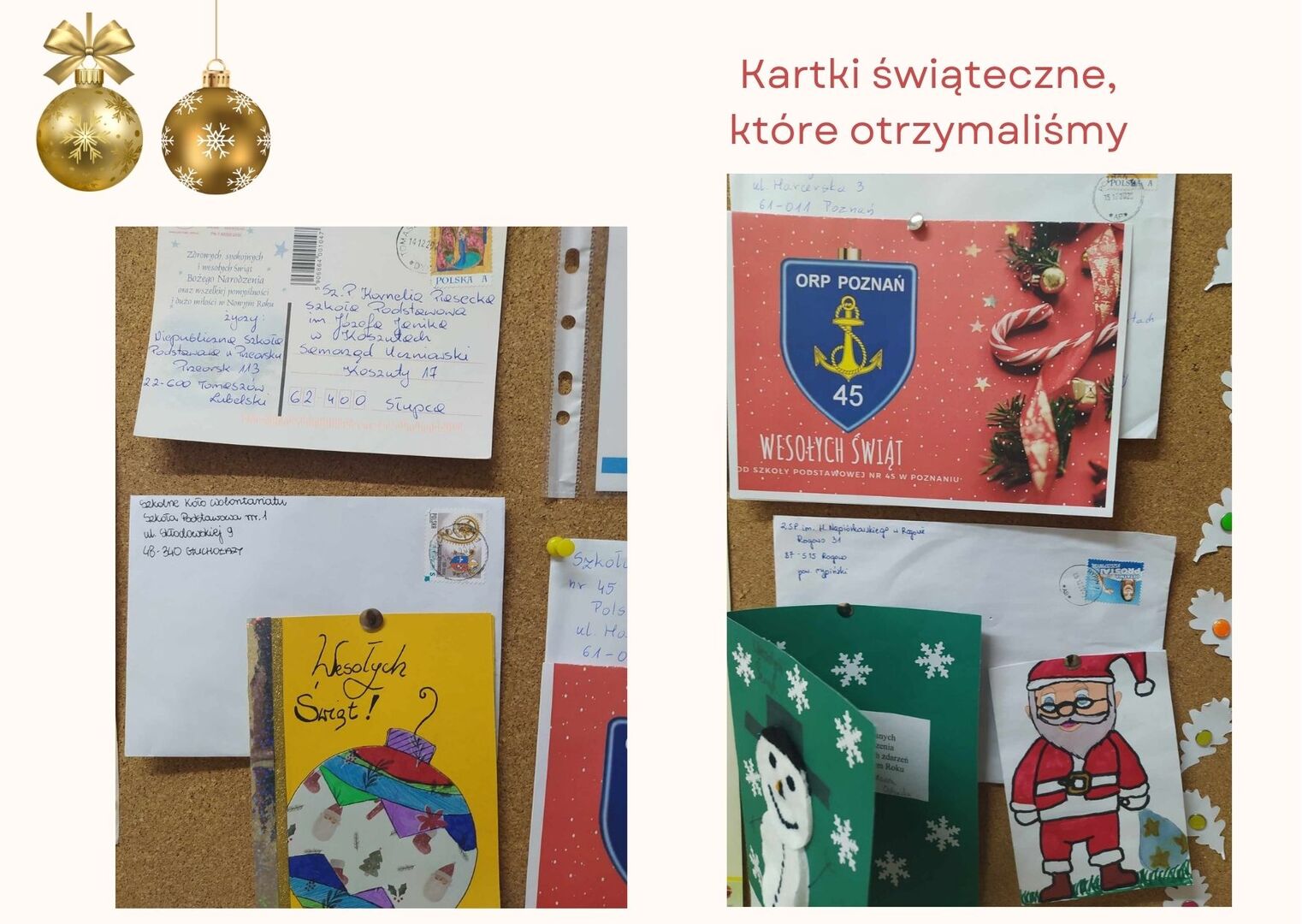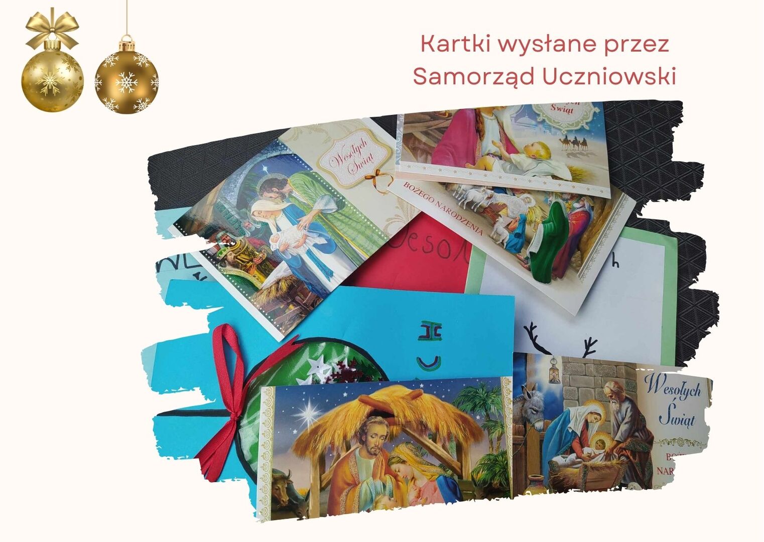 Z okazji zbliżających się świąt Bożego Narodzenia Samorząd Uczniowski wraz z opiekunami wziął udział w międzyszkolnej wymianie kartek świątecznych. Nasi uczniowie na pięknych kartkach, niektórych wykonanych własnoręcznie, napisali życzenia i wysłali do innych opiekunów oraz Samorządów Uczniowskich ze szkół z całej Polski. My również otrzymaliśmy wiele kartek z życzeniami, które zostały umieszczone na gazetce szkolnej. Wszystkim zaangażowanym uczniom bardzo dziękujemy! Taka wymiana pozwala na kultywowanie pięknych tradycji świątecznych. W przyszłym roku z pewnością będziemy chcieli to powtórzyć.