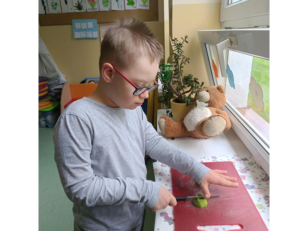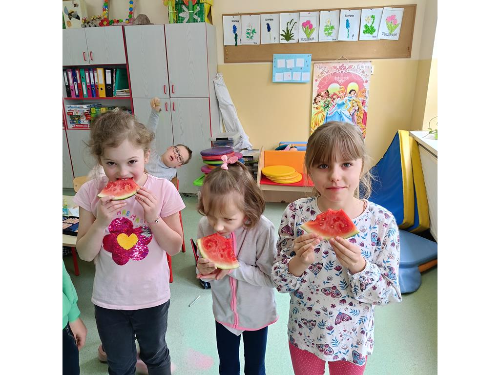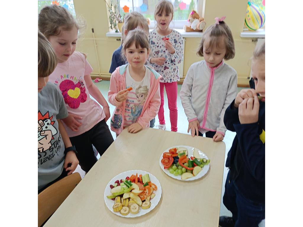 i warzyw. Był to najprzyjemniejszy moment zajęć. Wszyscy ze smakiem pałaszowali zebrane produkty. Po takiej porcji witamin z wielką energią tańczyli do piosenki „Witaminki” .