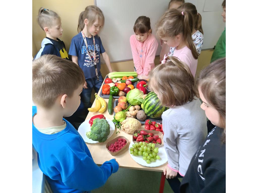 W ramach klasowego projektu „Zdrowo jem, więcej wiem” uczniowie klasy pierwszej uczestniczyli w ciekawej lekcji. Zajęcia rozpoczęły się od krótkiej rozmowy na temat owoców i warzyw. Uczniowie zostali podzieleni na dwie grupy „Owoce” i „Warzywa” . Ich zadaniem było wypisanie na kartce jak najwięcej owoców i warzyw, które znają. Następnie mogli obejrzeć wystawę owoców i warzyw zgromadzoną w klasie i sprawdzić czy jest tam jeszcze jakiś artykuł którego nie wymienili .