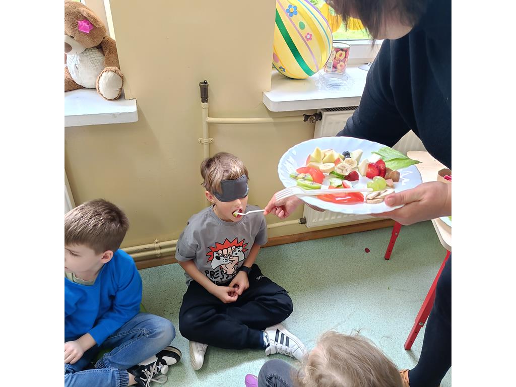 Następnie przeprowadzony został konkurs smaku, w którym uczniowie mieli za zadanie spróbować różnych owoców i warzyw i zgadnąć, co to za produkty. Dzieci z wielkim entuzjazmem próbowały różnych smaków i zgadywały, co znajduje się przed nimi.