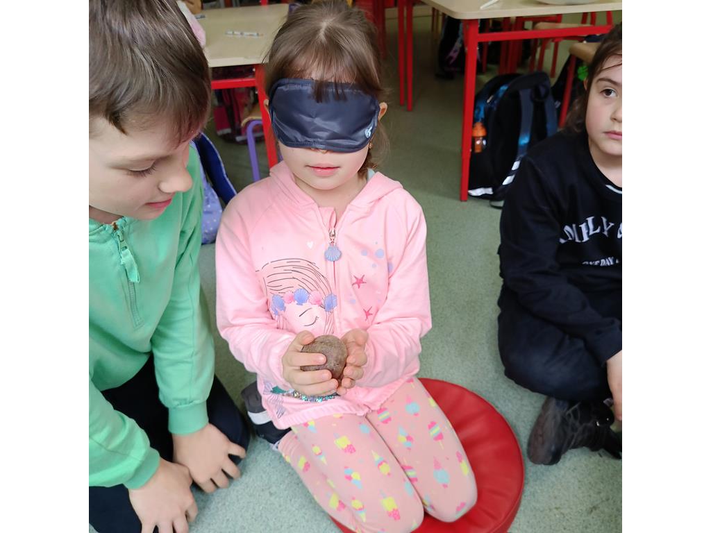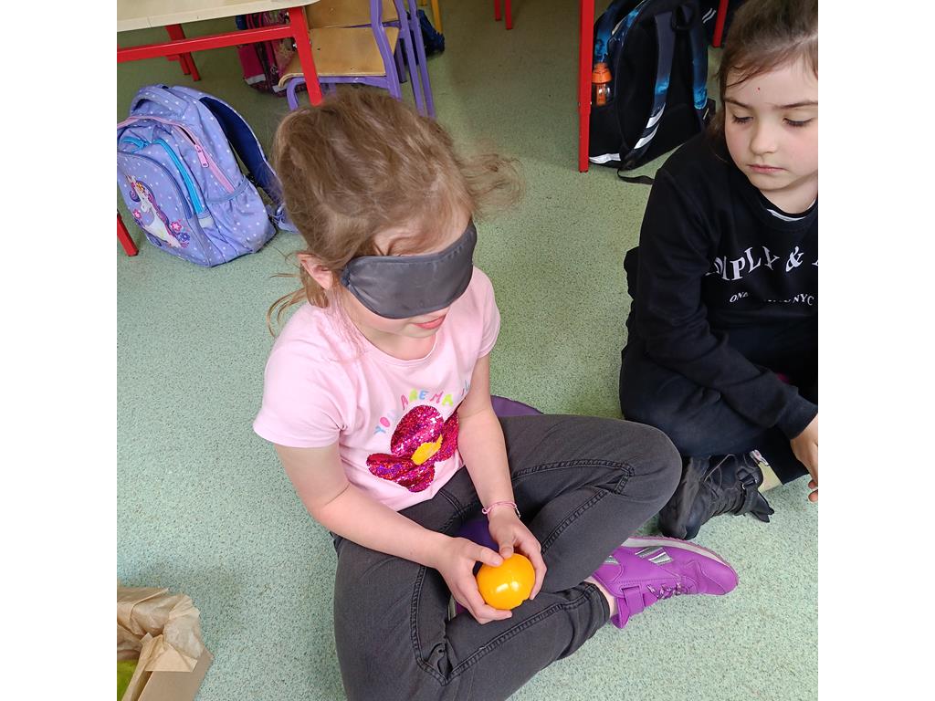 Kolejnym punktem zajęć był konkurs dotyku, w którym przedstawiciele grup musieli wykorzystać zmysł dotyku, aby rozpoznać owoc lub warzywo. Po konkursach odbyła się rozmowa z dziećmi na temat znaczenia spożywania owoców i warzyw dla zdrowia. Uczniowie aktywnie brali udział w dyskusji, próbując znaleźć odpowiedzi na pytania dotyczące korzyści zdrowotnych wynikających z jedzenia owoców i warzyw oraz częstotliwości ich spożywania. Bez najmniejszego problemu odkryły, że to właśnie różne witaminy ( A, C, K, B, D, E ) „ukryte” w warzywach i owocach są niezbędne dla naszego zdrowia.
