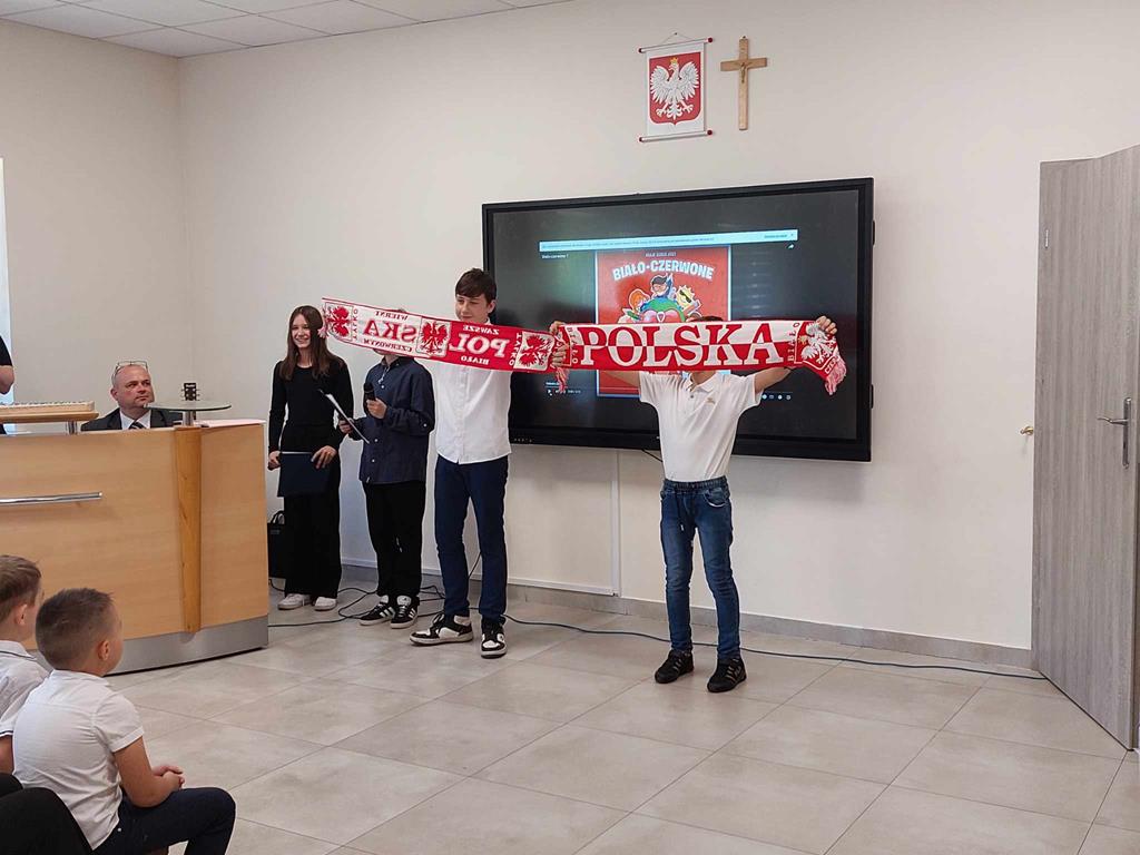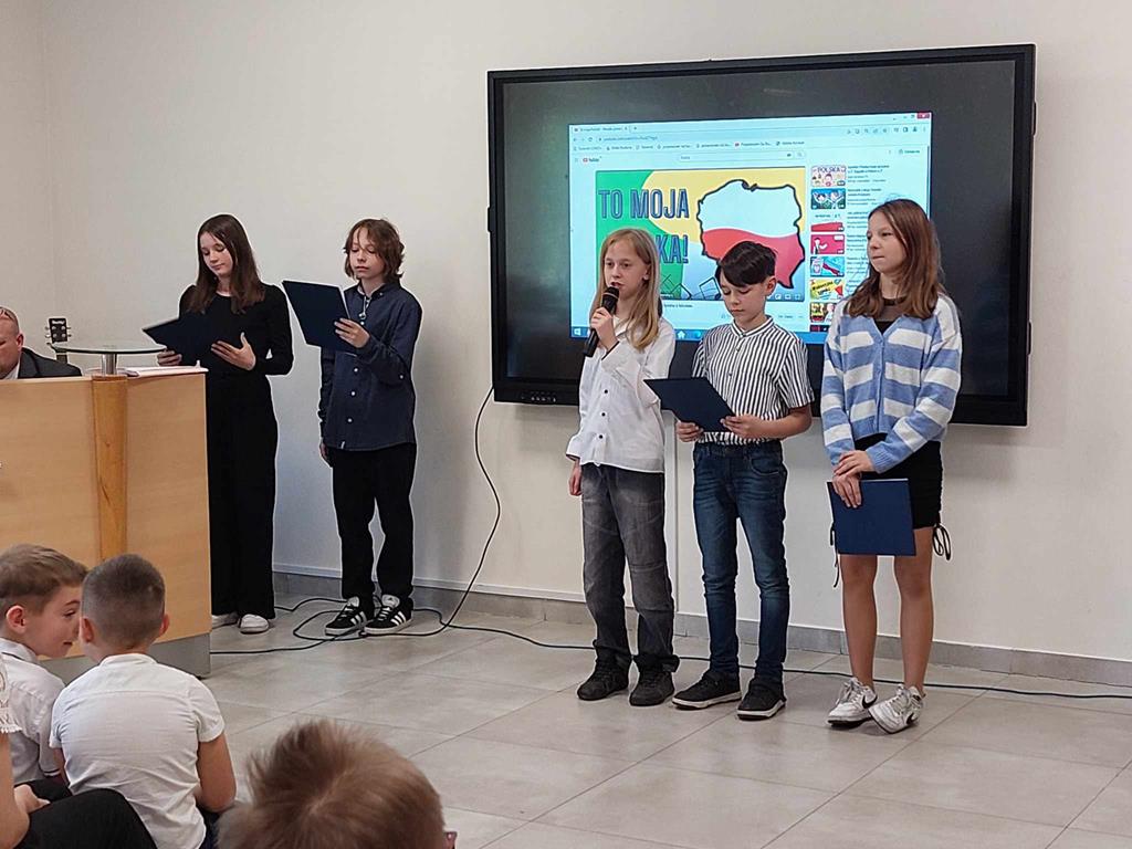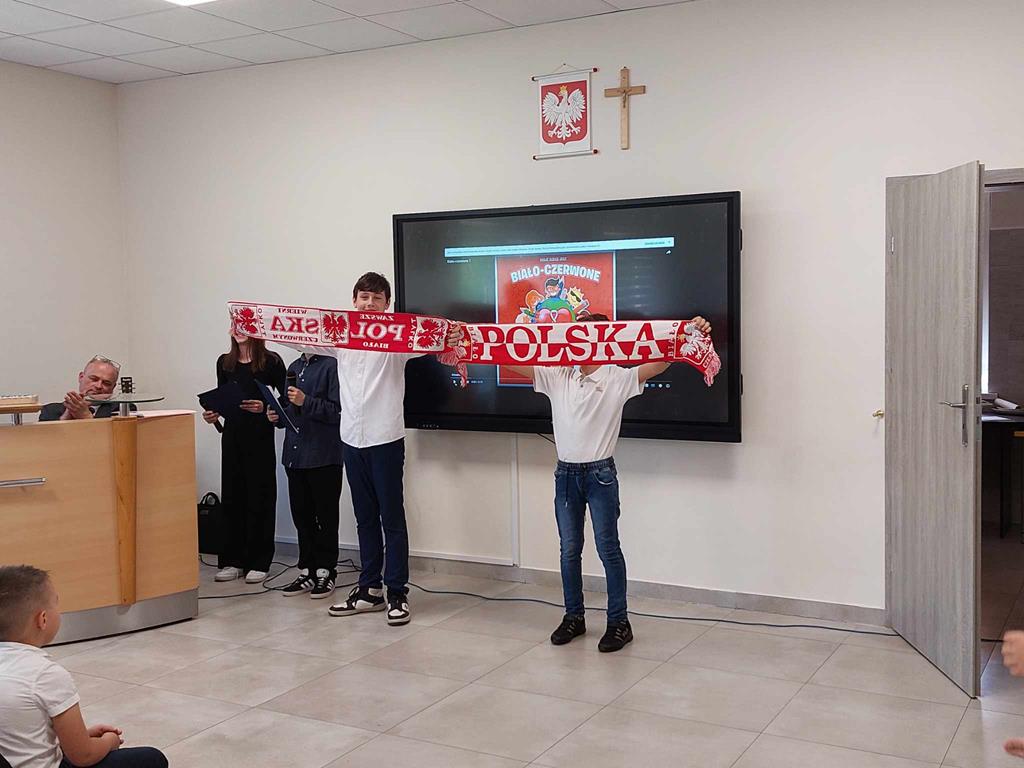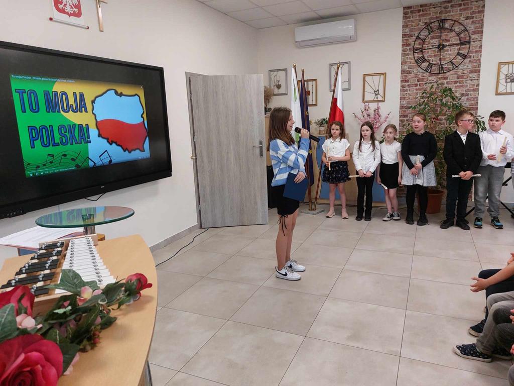 Następnie uczciliśmy 20. rocznicę wstąpienia Polski do Unii Europejskiej. Historię organizacji i ciekawostki na temat UE przedstawiła Iga, uczennica klasy piątej.