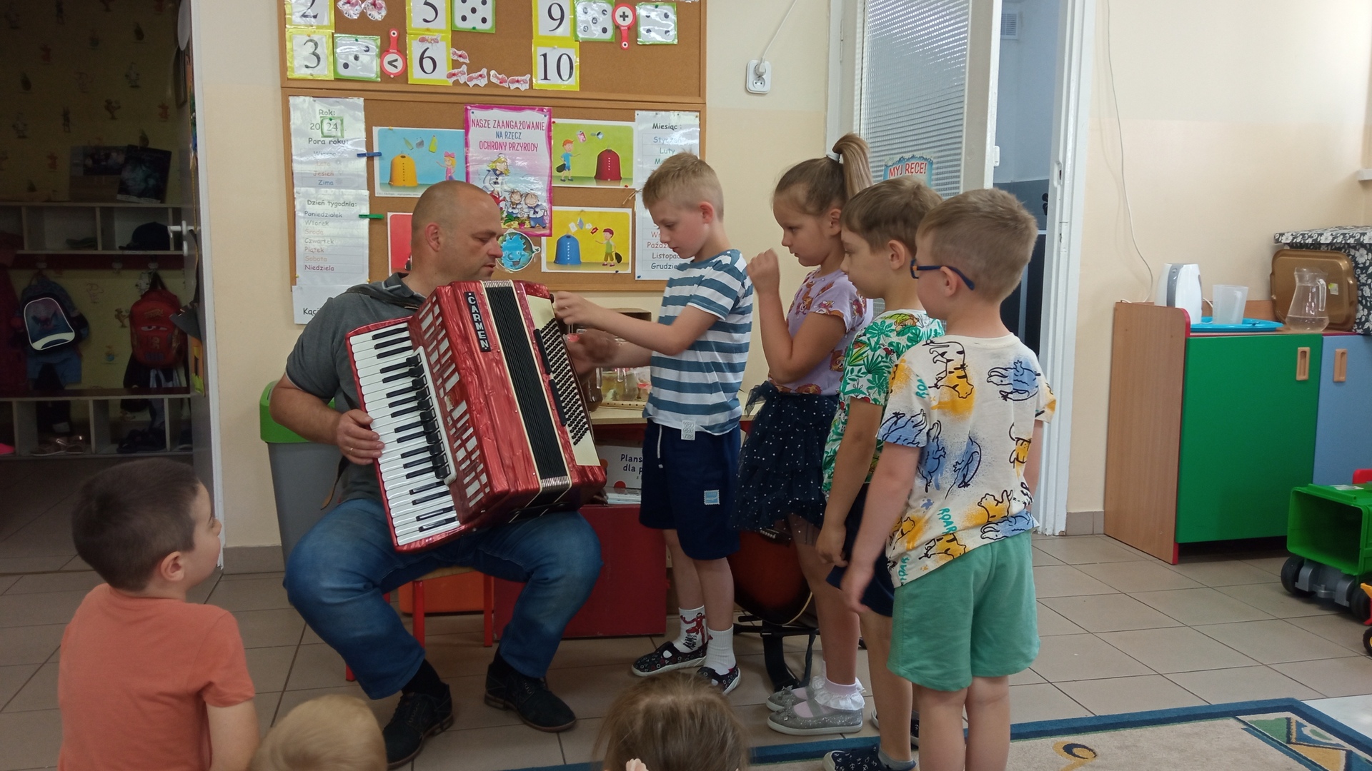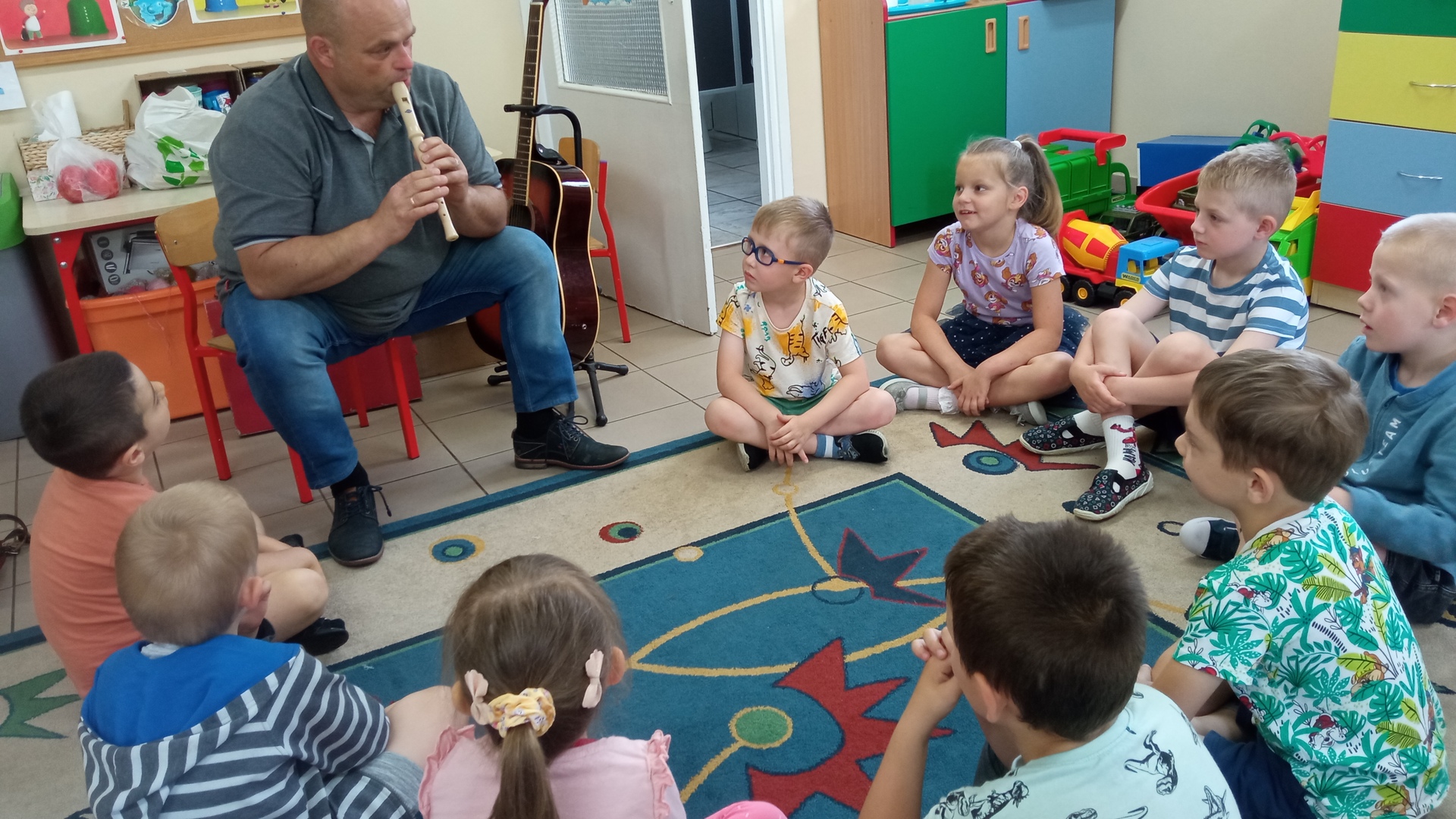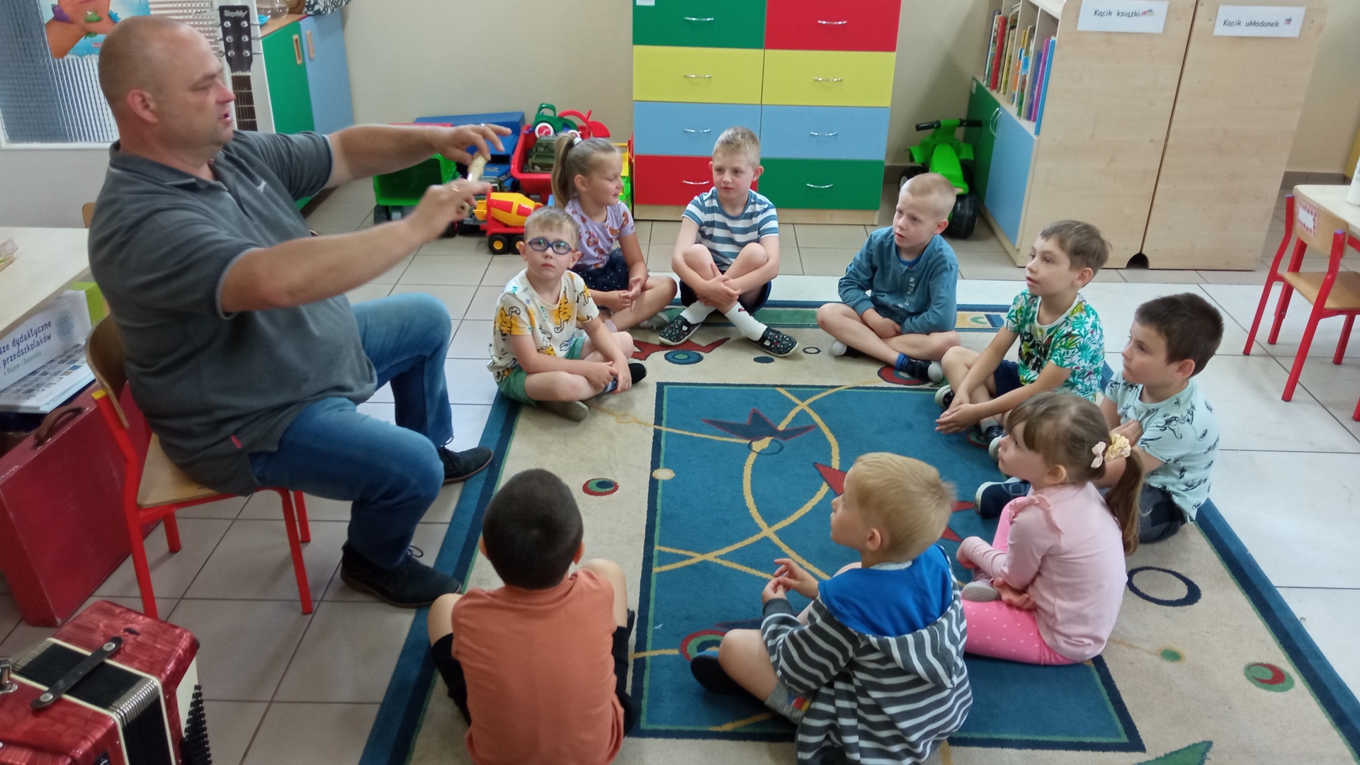 Podczas tematów związanych z muzyką nie zabrakło odwiedzin p.Andrzeja Rydzewskiego,który bawił się z dziećmi w rozpoznawanie melodii oraz nazw instrumentòw.