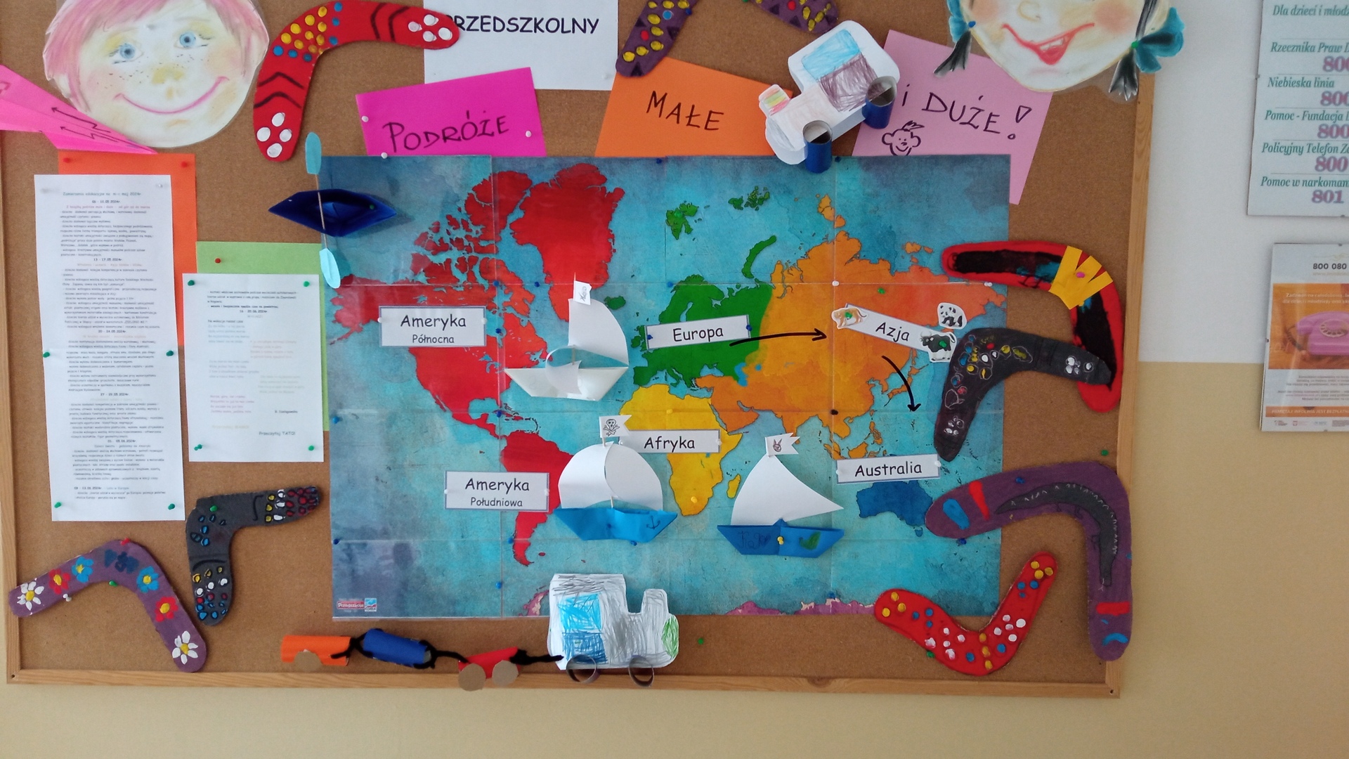 W maju oddział przedszkolny "wybrał się" w podróże małe i duże.W ruch poszedł globus oraz mapy.Dzieci wykonały m.in.azjatyckie czapki i wachlarze,australijskie bumerangi i deszczowe rurki,pociąg,samolot,łòdki.Poznały wiele gatunków azjatyckich,australijskich oraz afrykańskich zwierząt a także przygotowały niespodzianki dla swoich mam z okazji ich święta.