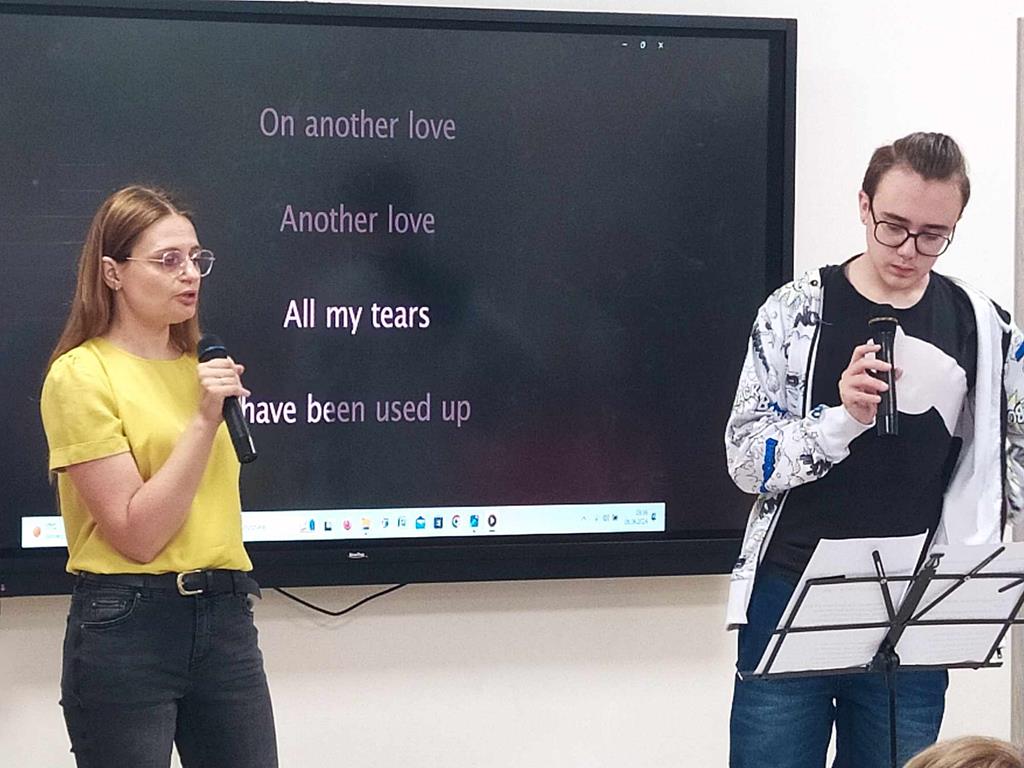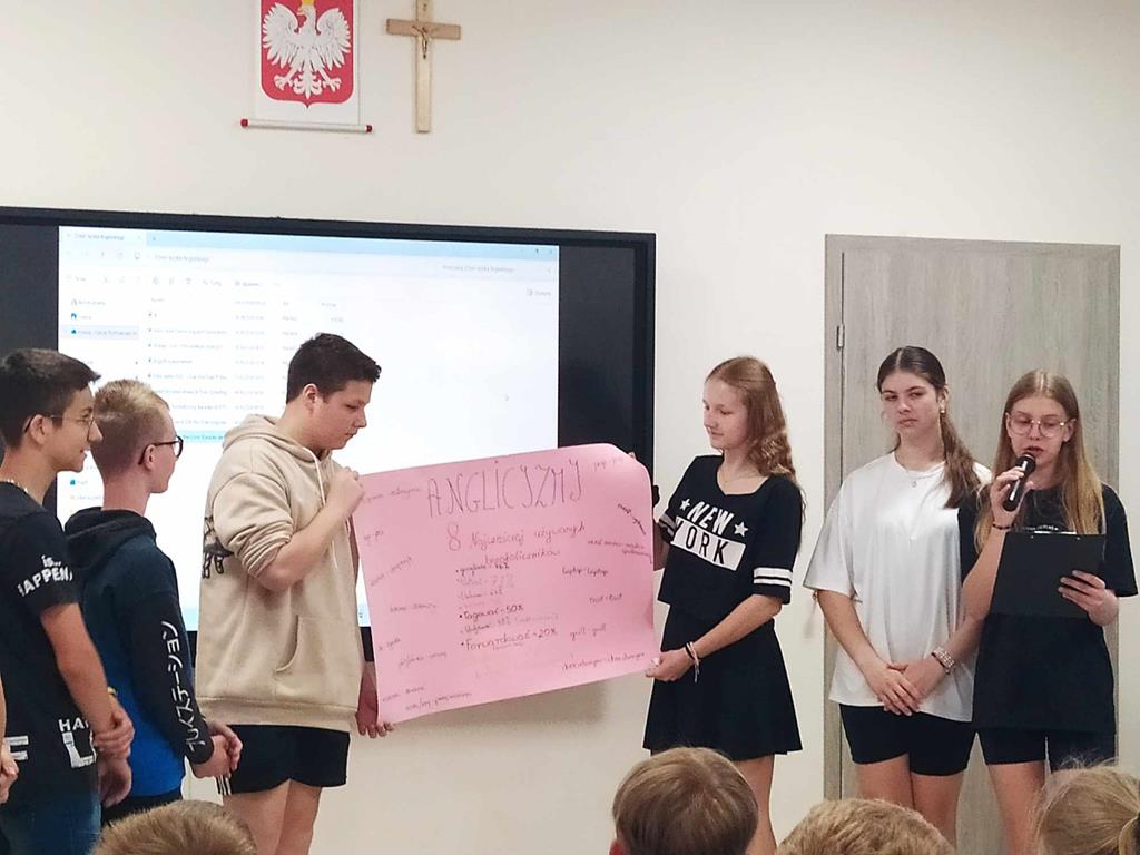 Następnie przyszedł czas na uczniów klasy 4, którzy zaprezentowali plakat pt. ,,English is everywhere”, w którym to przedstawili słowa w języku angielskim, które są obecne w naszym codziennym życiu ( na produktach żywnościowych, ubraniach, kosemtykach itp.), po czym uczennica z kl. 4 wraz z uczennicami z kl. 1 i 3 wspólnie wykonały energetyczny utwór ,,Close your eyes”. Kolejnym występującym był reprezentant klasy 8- Gabriel Tylisz, który wraz z Panią Joanną Wiśną wykonał wzruszający utwór ,,Another love”. Następnie, uczniowie klasy 8 omówili plakat dotyczący anglicyzmów, w którym przedstawili najczęściej używane słowa w języku polskim, które zostały zapożyczone z języka angielskiego. Na zakończenie uczennice klasy 5 i 6 zaśpiewały i zatańczyły do znanego utworu Blanki ,,Solo”.