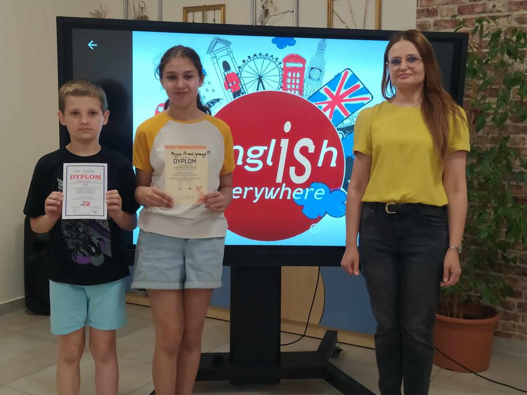Dzień Języka Angielskiego okazał się również świetną okazją do pogratulowania naszemu uczniowi z kl. 4 Filipowi Cieślarskiemu, który w dniu 5.06.2024r. otrzymał dyplom oraz nagrodę za uzyskanie wyniku bardzo dobrego w Ogólnopolskim Konkursie Języka Angielskiego ,,FOX”. Pogratulowano również uczennicy Mayi Ahmed, która wraz z Filipem wywalczyła dla nas I miejsce w POWIECIE SŁUPECKIM w kryterium ,, najlepszy wynik” oraz ,,średni wynik”. Nasza szkoła zajęła również 17 miejsce w rankingu 100 najlepszych szkół w Polsce w kategorii ,,średni wynik”.