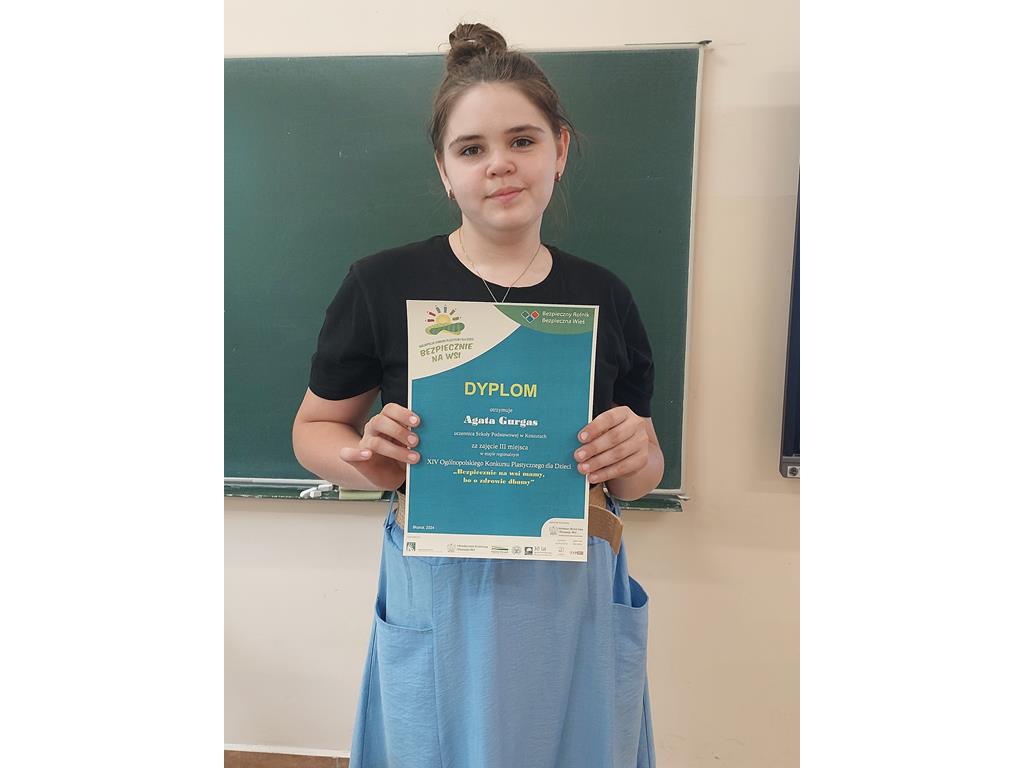 Uczennica klasy VI naszej szkoły, Agata Gurgas, zdobyła III miejsce na etapie regionalnym w XIV Ogólnopolskim konkursie plastycznym pod hasłem „Bezpieczne na wsi mamy, bo o zdrowie dbamy”. W konkursie wzięło udział 324 uczniów z 9 szkół. Celem jego było promowanie pozytywnych zachowań związanych z pracą i zabawą w gospodarstwie rolnym. Zadaniem uczniów było wykonanie dwuwymiarowej pracy plastycznej w formacie A-3 w dowolnej technice, obrazującej upowszechniane przez Kasę Rolniczego Ubezpieczenia Społecznego sposoby zapobiegania wypadkom przy pracy i rolniczym chorobom zawodowym popularyzowane w ramach projektu „Bezpieczny Rolnik, Bezpieczna Wieś”. Współorganizatorami konkursu są Ministerstwo Rolnictwa i Rozwoju Wsi, Państwowa Inspekcja Pracy, Krajowy Ośrodek Wsparcia Rolnictwa oraz Agencja Restrukturyzacji i Modernizacji Rolnictwa.