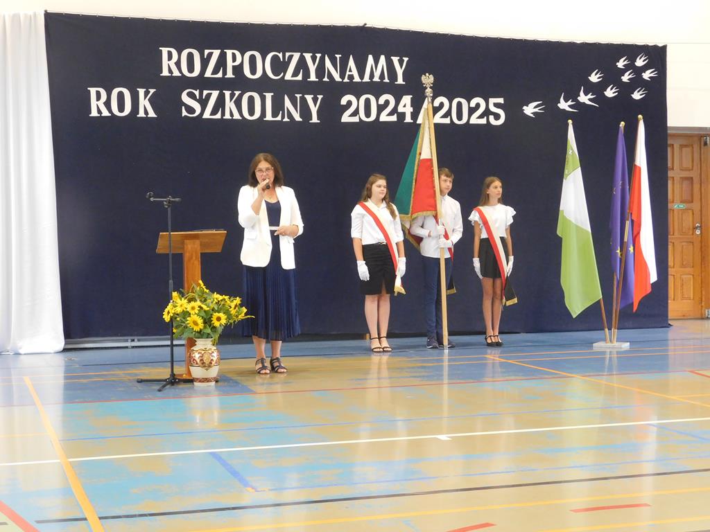 Oficjalną część rozpoczęto od wprowadzenia pocztu sztandarowego i wspólnego odśpiewania hymnu narodowego. Następnie Pani Dyrektor Agata Kopczyńska powitała zebranych uczniów, Rodziców, nauczycieli i pracowników. Gorące słowa skierowała w stronę Pierwszoklasistów życząc Im pomyślności w wypełnianiu obowiązków szkolnych, a wszystkim uczniom powodzenia w zdobywaniu wiedzy i nowych umiejętności. W swoim wystąpieniu Pani Dyrektor wspomniała o pierwszym września 1939 roku, które uczczono minutą ciszy.