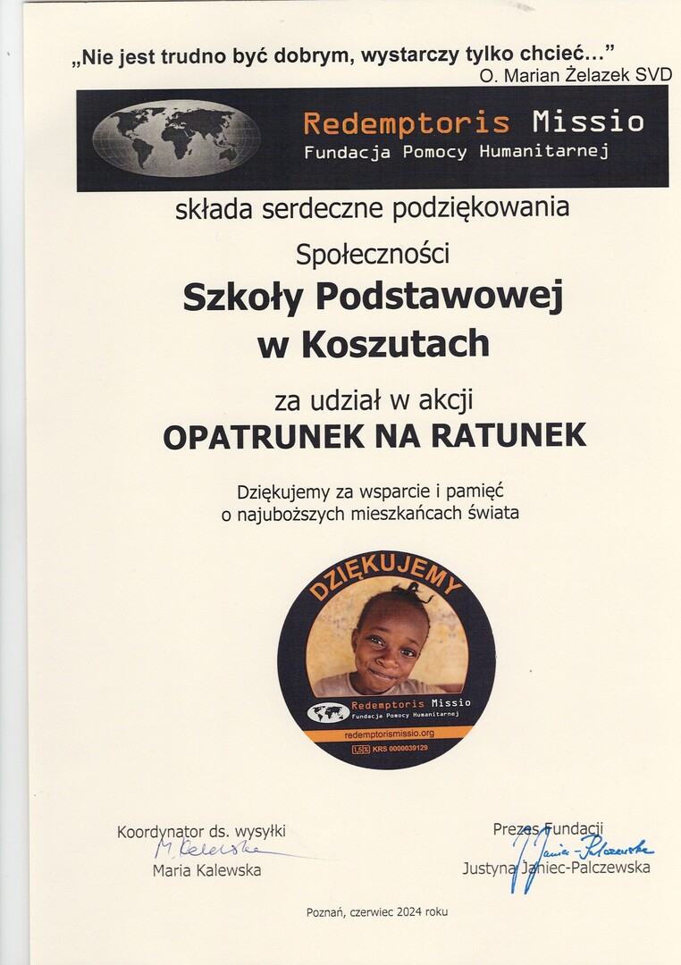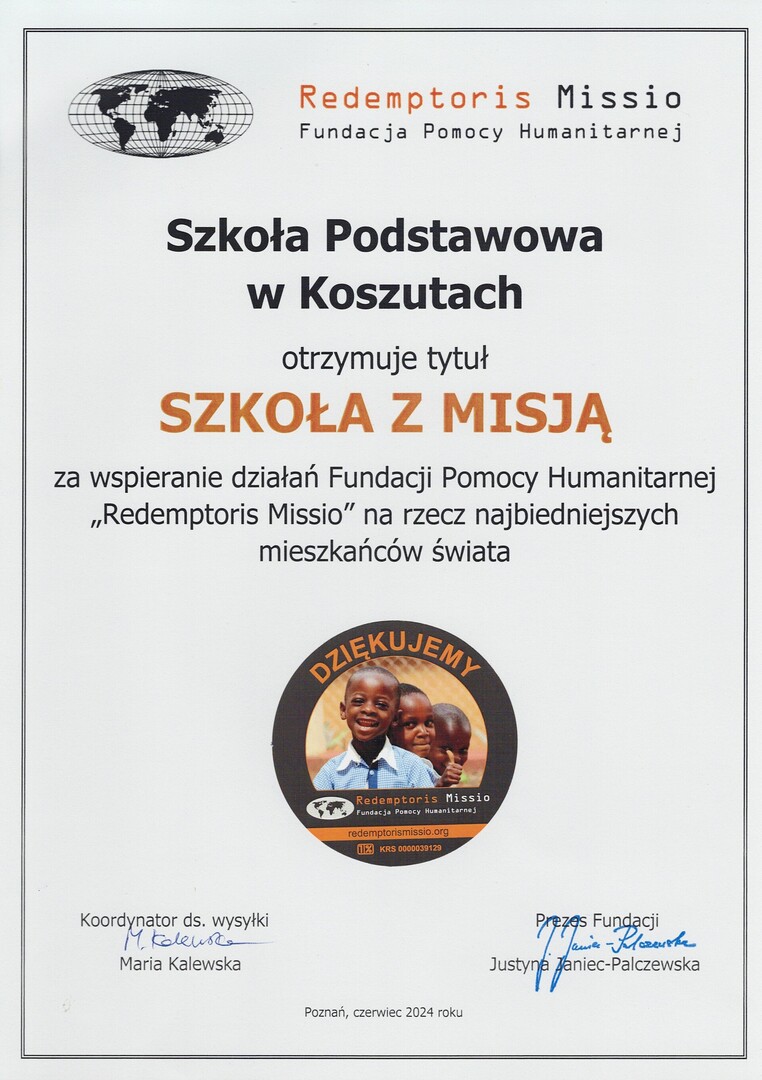 Z radością informujemy, że znaleźliśmy się w gronie szkół z Polski, które otrzymały tytuł„ Szkoła z misją”. Ten zaszczytny tytuł to nagroda za owocną pomoc na rzecz potrzebujących z krajów misyjnych.