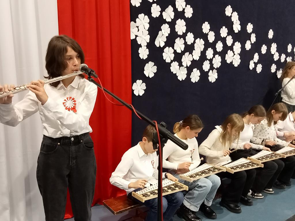 Warto podkreślić, iż kompozycja słowno-muzyczna przedstawiona przez uczniów miała swoją premierę dzień wcześniej. 11 listopada 2024 r. reprezentacja naszej szkoły wystąpiła w czasie gminnych obchodów Narodowego Święta Niepodległości w kościele pw. św. Katarzyny Aleksandryjskiej w Cieninie Kościelnym.