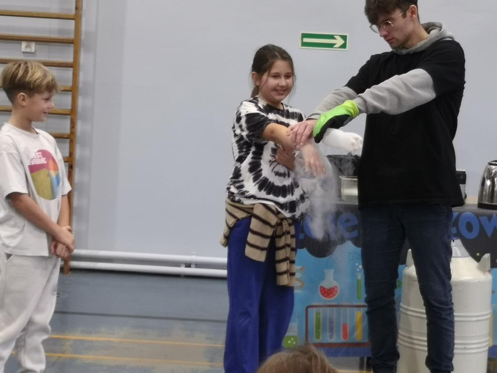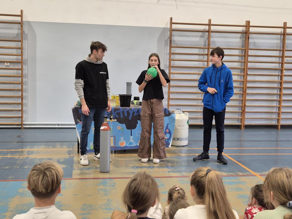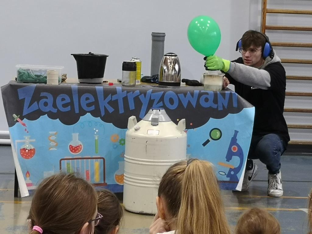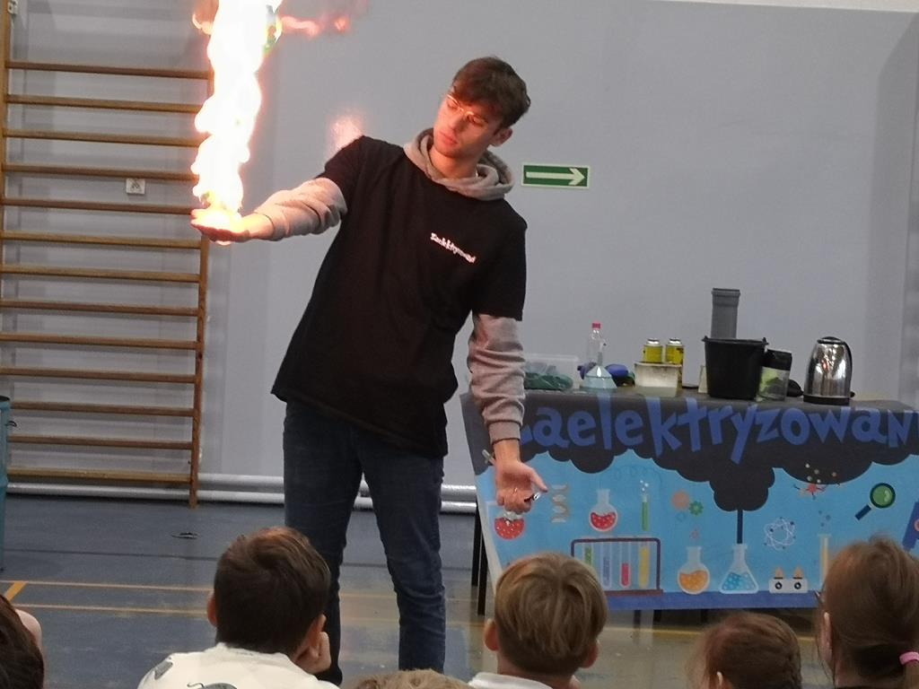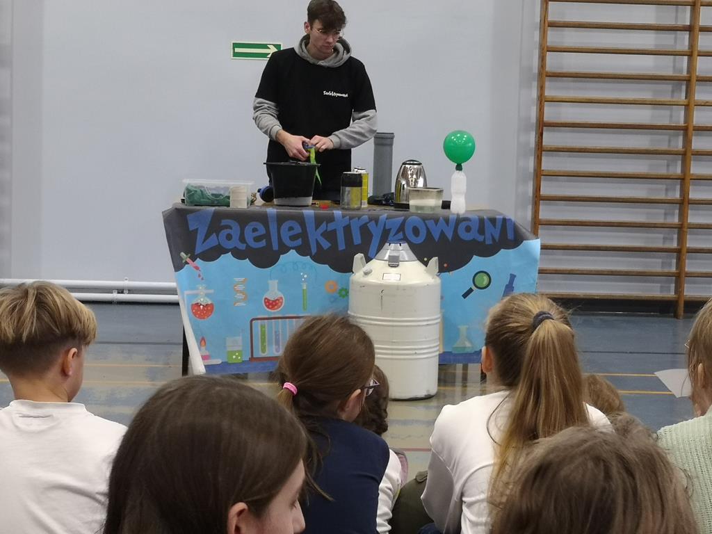 W naszej szkole 15 listopada odbyła się niecodzienna lekcja pt. ”Zasady fizyczne czy kwasy chemiczne” prowadzona przez grupę Zaelektryzowani. Celem pokazu było przybliżenie tajników fizyki i chemii w bardzo prosty i atrakcyjny sposób. Prowadzący zaprezentował widowiskowe eksperymenty i doświadczenia. Chemia i fizyka to również wiedza praktyczna, która może przydać się nam w życiu codziennym. W programie znalazły się zabawy z gazami (zabawy z helem i ciekłym azotem, wybuchowe spalanie wodoru). Zarówno młodsi jak i starsi uczniowie aktywnie uczestniczyli w doświadczeniach i pokazach. Dostarczyły one wiele śmiechu, ale również sporą porcję wiedzy. Uczniowie zobaczyli, że nauka może być wesoła, ciekawa i pasjonująca.