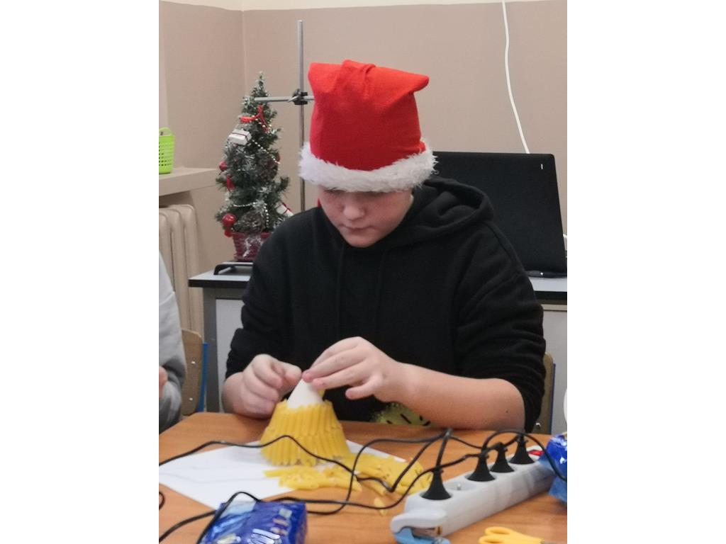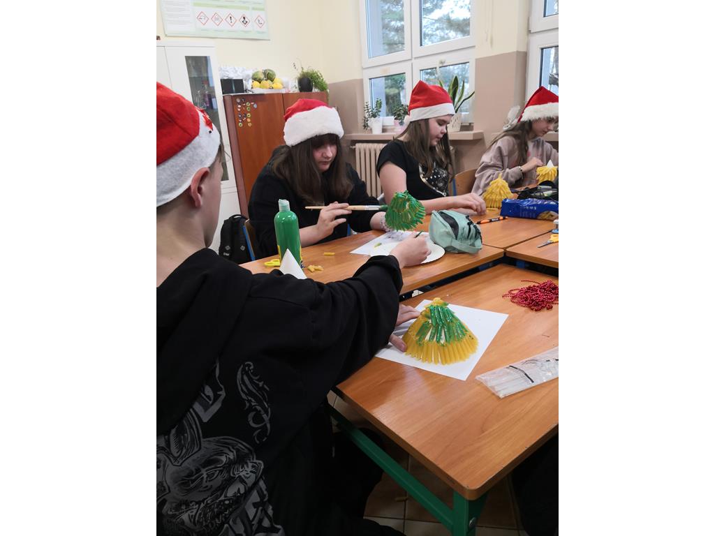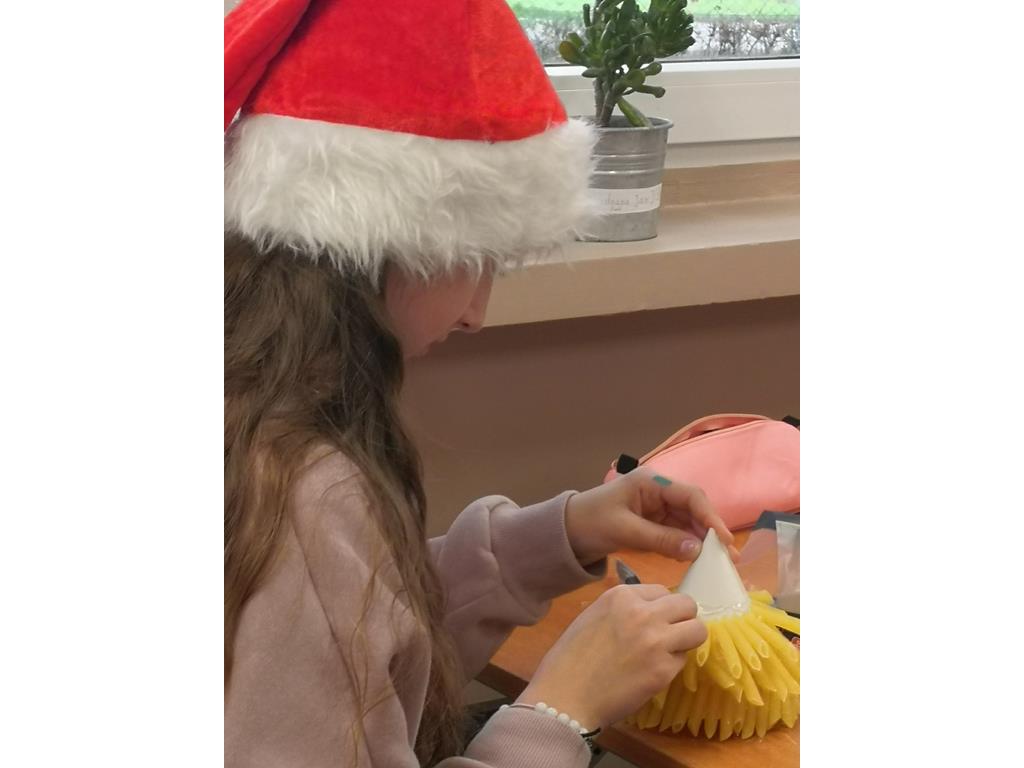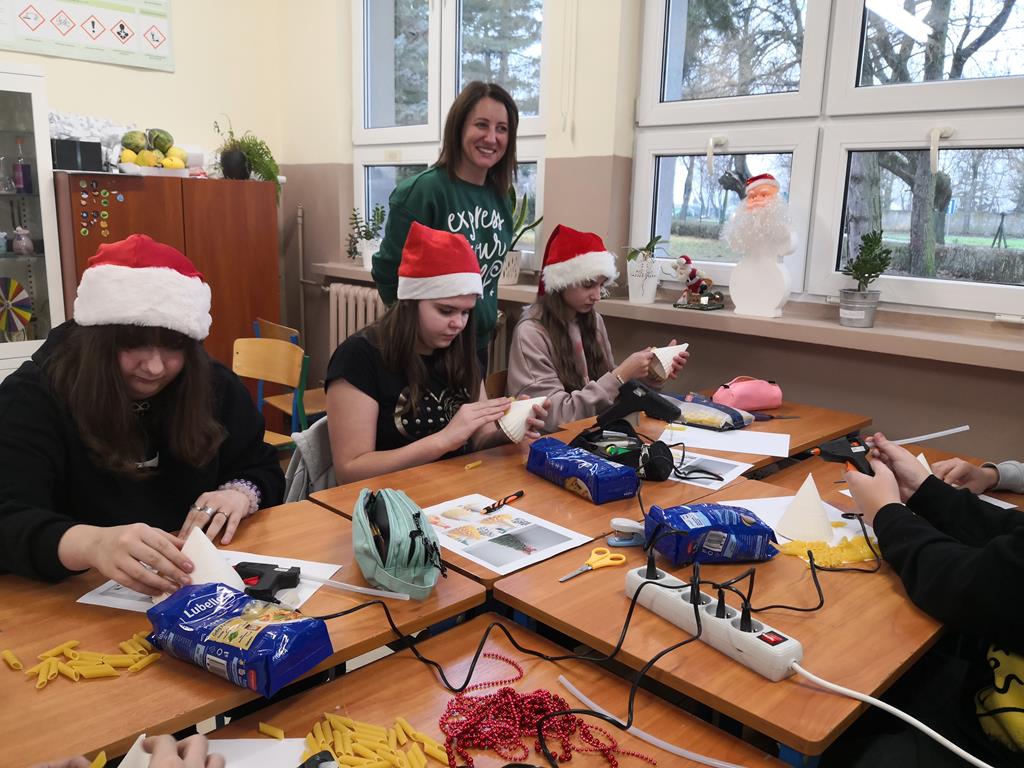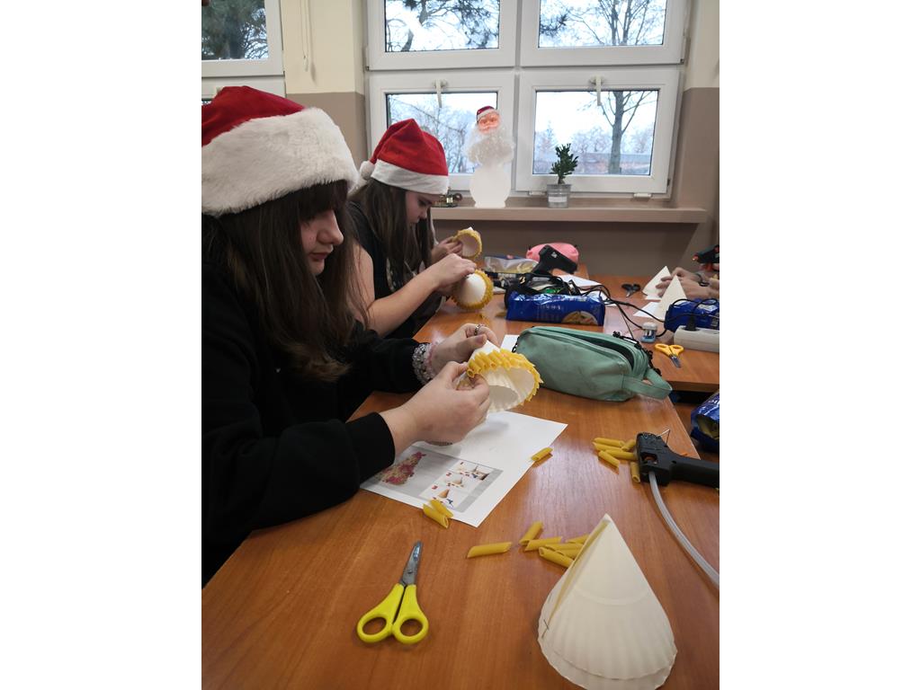 Warsztatom towarzyszyła ciepła, świąteczna atmosfera. Uczniowie z uśmiechem dzielili się swoimi pomysłami, pomagali sobie nawzajem i cieszyli się z efektów swojej pracy. Powstałe ozdoby były nie tylko piękne, ale też unikatowe – każda z nich odzwierciedlała indywidualne podejście twórcy.