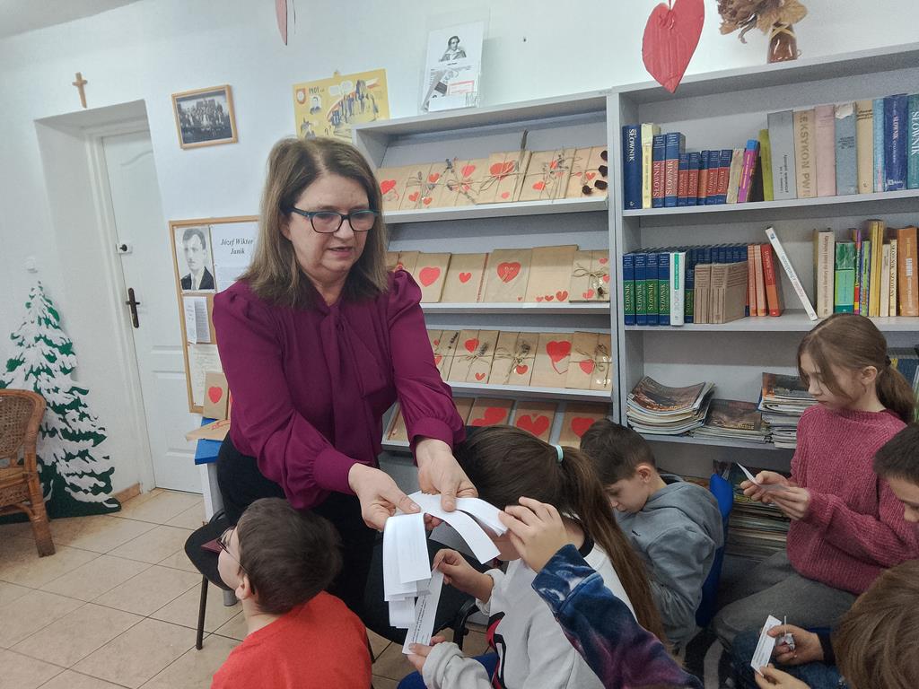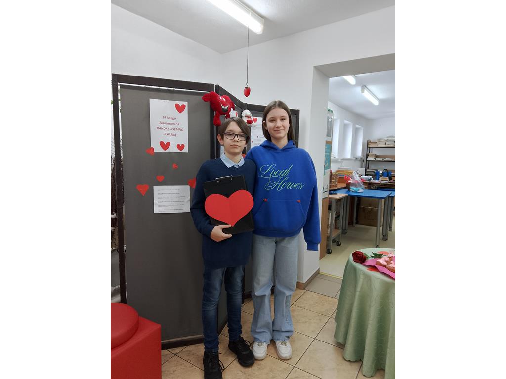 14 lutego, biblioteka szkolna wraz z Samorządem Uczniowskim zorganizowała kolejną akcję czytelniczą. Tym razem była to „Randka w ciemno….. z książką”. W walentynkowym spotkaniu udział wzięli :dyrektor szkoły Pani Agata Kopczyńska, nauczyciele i uczniowie. Tego dnia czytelnia biblioteki stała się strefą, która kojarzy się z emocjami i przyjemnymi momentami w życiu. Scenerię tworzyły serduszka, kwiaty, balony w kształcie serc oraz półki na których znajdowały się książki opowiadające o przyjaźni i miłości. Każda z książek na tej półce była „odświętnie ubrana” w prezentowy papier ozdobiony serduszkami i motywami kwiatowymi. Cała zabawa polegała na tym, że wypożyczający nie widział jaki jest tytuł książki ani kto jest jej autorem. Stąd „randka w ciemno”. Wszystkie książki przygotowane przez panią bibliotekarkę powędrowały do rąk czytelników. Wśród książek które ukryły się pod walentynkowymi dekoracjami były: literatura fantazy, przygodowa, kryminał no i oczywiście książki o miłości. Było sympatycznie i klimatycznie. Spotkanie było też okazją do zaprezentowania przez panią bibliotekarkę kilku książek kryjących w sobie wiele prawd i mądrości, które w piękny, zabawny lub wyjątkowy sposób opowiadają o miłości. W czasie spotkania padło wiele cytatów skupiających się na różnych aspektach miłości, od namiętności przez poświecenie aż po głęboką więź duchową. Każdy z cytatów przypomniał o sile i pięknie miłości, której doświadczamy w naszym życiu. Podczas walentynkowego spotkania wysłuchano wiersza „Rozmowa liryczna” autorstwa K. I. Gałczyńskiego w interpretacji uczniów klasy VI: Igi Konieczki i Kacpra Radeckiego oraz wiersza J. Brzechwy „Żuraw i Czapla” w wykonaniu dyrektor szkoły.