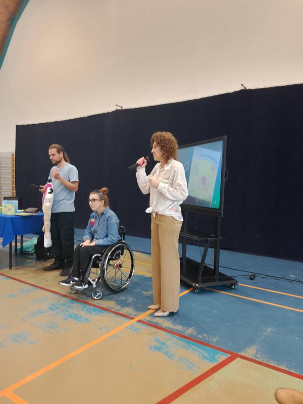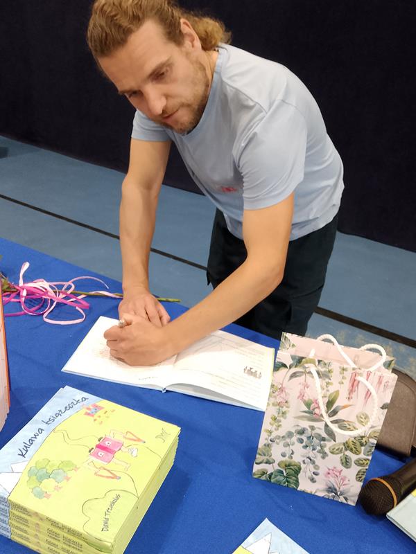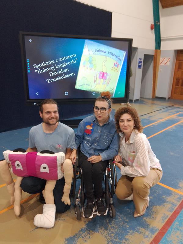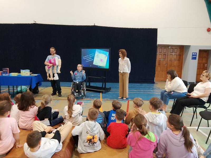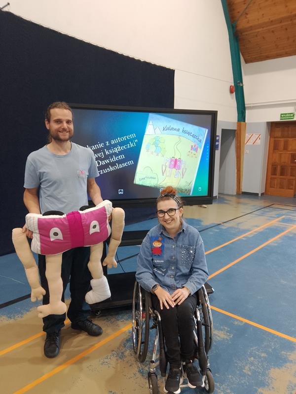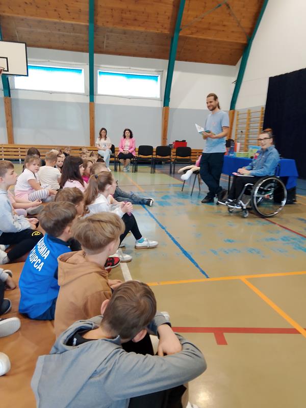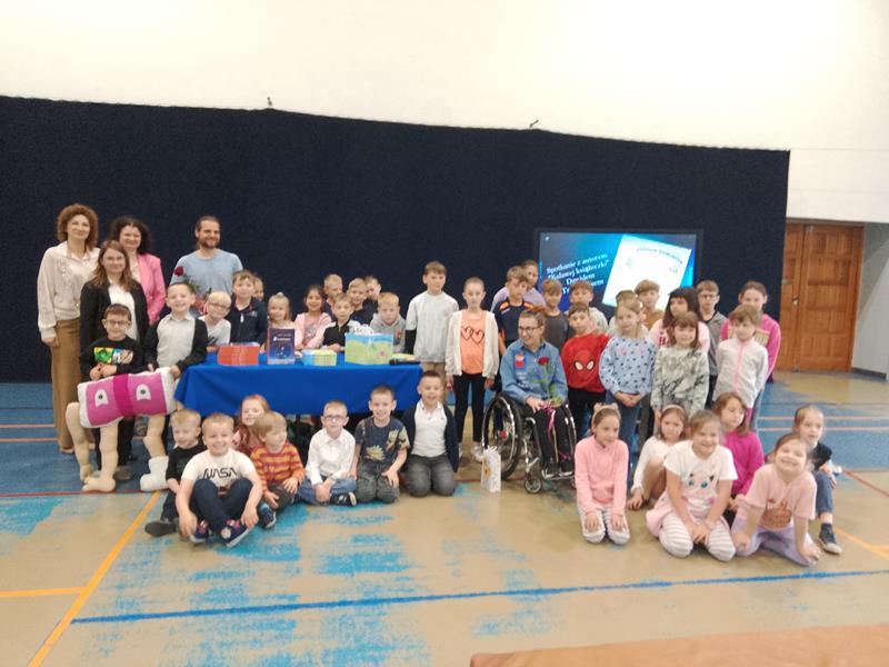W dniu 30 maja odbyło się spotkanie z Dawidem Trzuskolasem , autorem książki „Kulawa Książeczka ‘’. W spotkaniu wzięli udział uczniowie z klas 0-3. Podczas spotkania pan Dawid czytał fragmenty swojej książeczki. Książka składa się z 15 bajek , pięknie zilustrowanych osobiście przez autora oraz jego dzieci . Każda bajka zawierała morał , niby prosty i banalny , ale doskonale tłumaczyła to , co my jako ludzie dorośli w głębi duszy wiemy od dawna . Jesteśmy różni , posiadamy różne cechy , ale tak naprawdę wszystkim nam chodzi o to samo . Chcemy żyć , spełniać marzenia i korzystać z tego co zsyła nam los , jak najlepiej potrafimy . Niektórzy jednak w realizację swoich marzeń muszą włożyć więcej wysiłku . Czytane bajeczki , wprowadziły dzieci w świat osób z niepełnosprawnościami. Wspólnie z panią Joanną Perlińską autorką książki „Ruda rządzi ‘’ opowiadał o tym , jak ważne jest właściwe traktowanie osób z niepełnosprawnościami, zrozumienie ich codziennych wyzwań i rozwijanie empatii. Autorzy pokazywali , jak różnorodność może być siłą i jak można wspierać innych w pokonywaniu trudności. Po spotkaniu, można było kupić książki z autografami autorów. Bardzo dziękujemy pani Monice Paszek za zorganizowanie w naszej szkole tego spotkania.