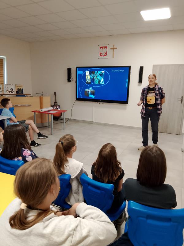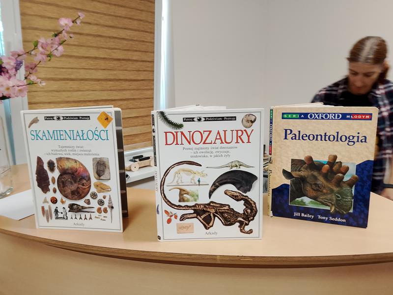 „Wieczór w bibliotece z filmową paleontologią ‘’. Zajęcia prowadziła pani Dagmara Frydrychowicz- Kustosz Muzeum Regionalnego w Koninie . Pani kustosz w przystępny sposób przybliżyła uczniom trudne zagadnienia z paleontologii. Pani Dagmara starała się udowodnić ,że odkrycia paleontologiczne miały i mają ogromny wpływ na kino .Okazuje się ,że twórcy filmowi tworząc postacie ( potwory ) itp. często szukają inspiracji wśród różnych nauk. W oglądanej prezentacji znalazło się wiele zwierząt z prehistorii, które były podstawą to stworzenia postaci w takich filmach ,jak np., „Avatar ‘’, „ Władca Pierścieni” , „Gwiezdne Wojny”.