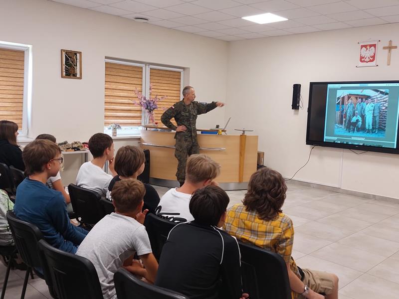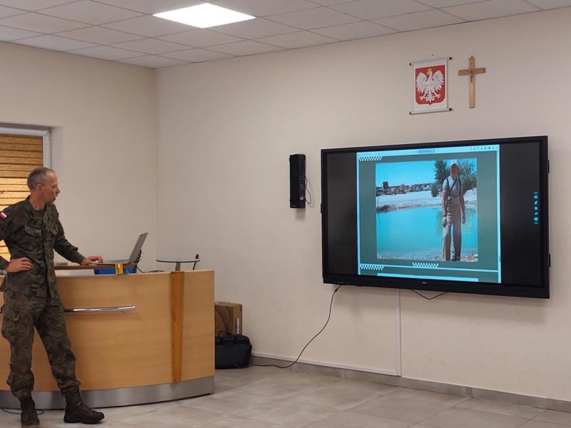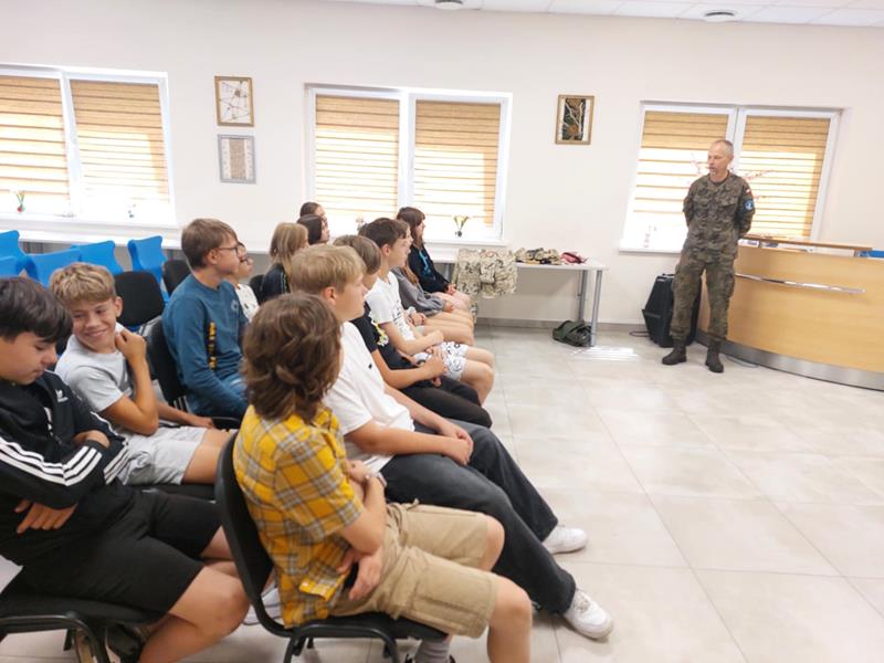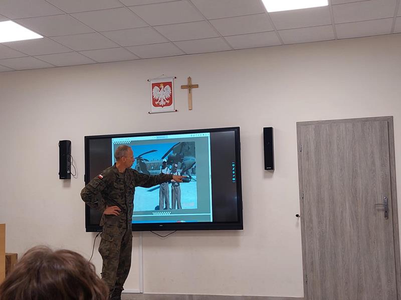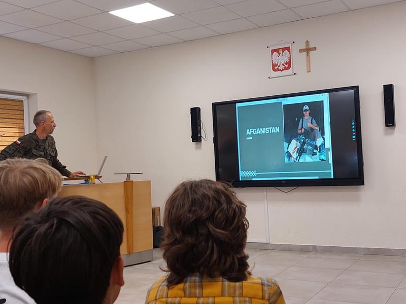Zajęcia w naszej szkole przeprowadził młodszy chorąży Krzysztof Pelec z Jednostki Wojskowej w Powidzu — doświadczony żołnierz, uczestnik misji w Afganistanie i Iraku.