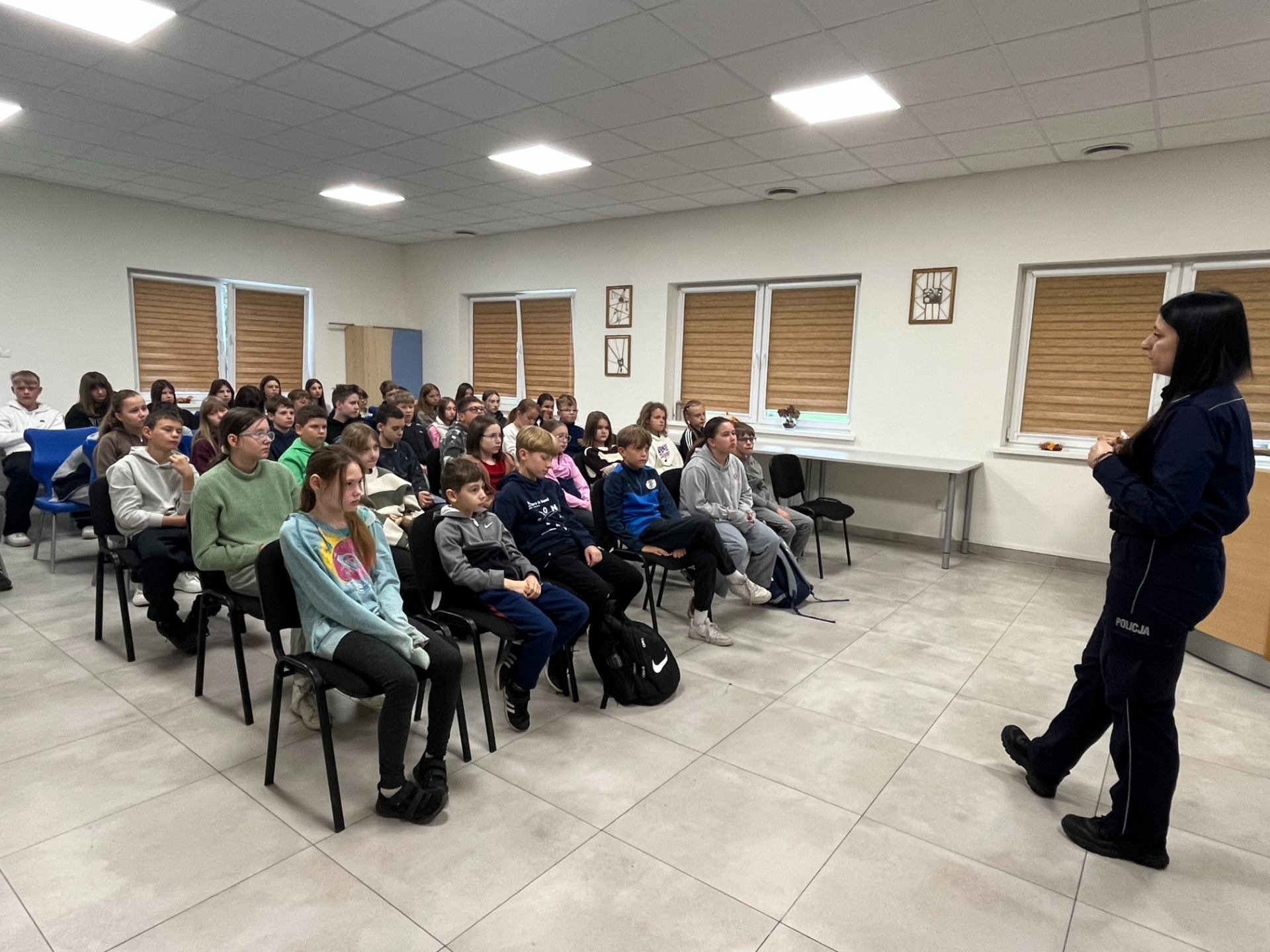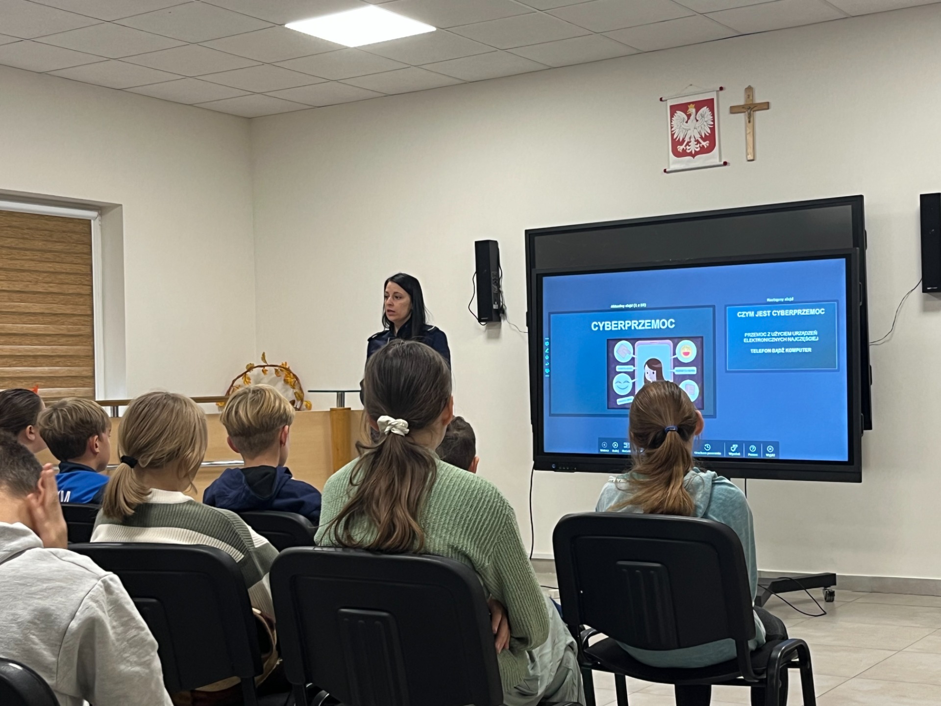 W środę w ramach tygodnia o przeciwdziałaniu przemocy rówieśniczej gościliśmy Panią Katarzynę Dąbrowską z Komendy Powiatowej Policji w Słupcy, która przeprowadziła prelekcję dla uczniów klas IV - VIII na temat hejtu oraz zagrożeń związanych z cyberprzestrzenią. Spotkanie było okazją do rozmowy o bezpiecznym i odpowiedzialnym korzystaniu z Internetu,